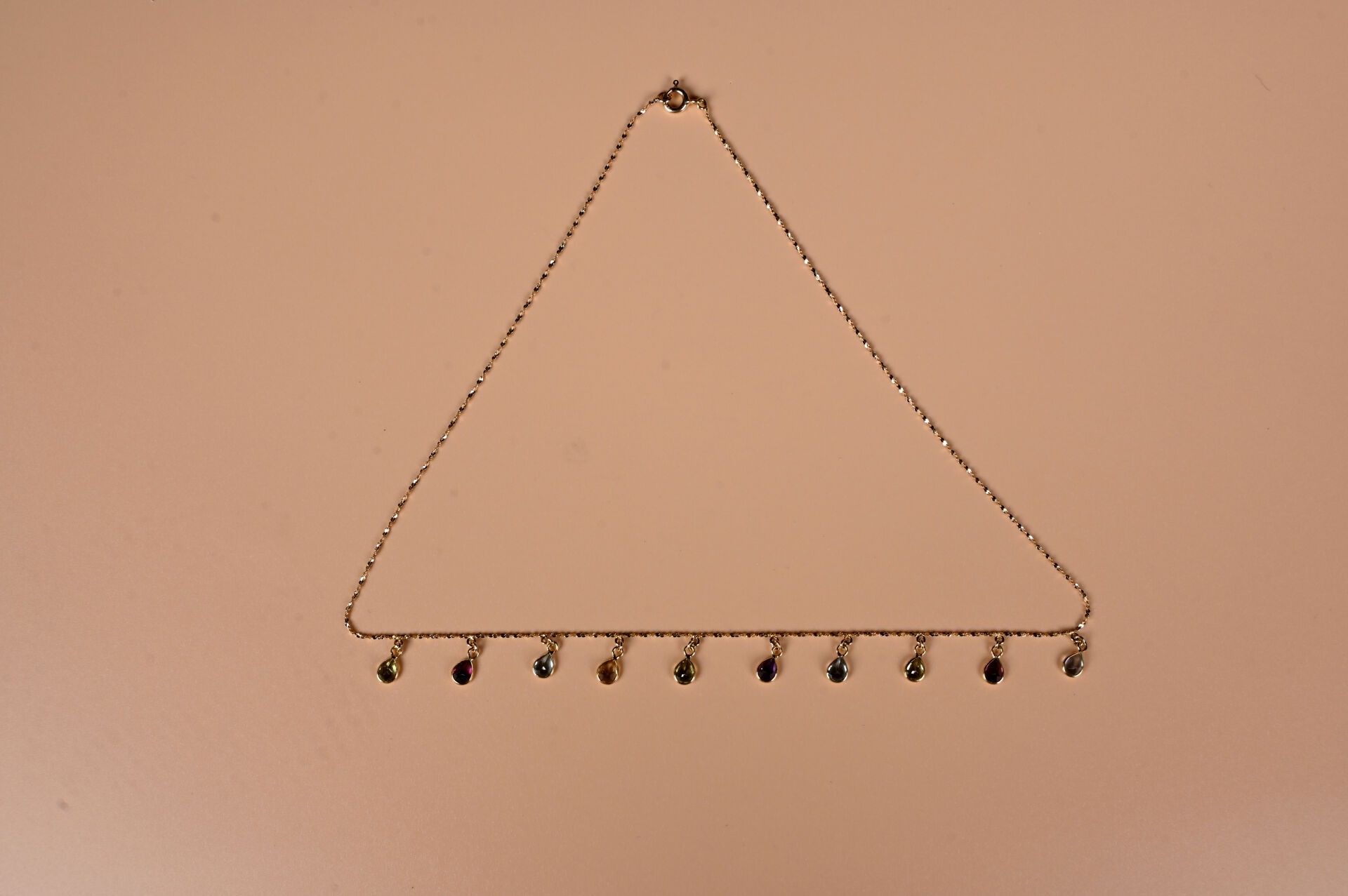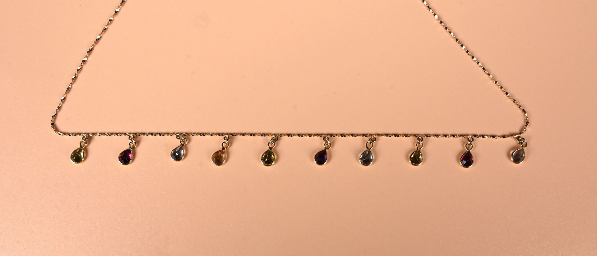 Tutti frutti" chain in 18K yellow gold 750/1000 and gemstones. Length: 42 cm. Gross weight : 3,2 g.