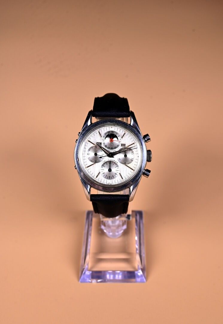 UNIVERSAL GENEVE TRI COMPAX. Men's chronograph wristwatch with round steel case. Signed dial with silvered day/date back, moon phases at 12 o'clock with 3 subdials. Hand-wound mechanical movement. Black leather strap with pin buckle. Diameter: 34 mm. Attachable strap. Starts, minor wear to hands.