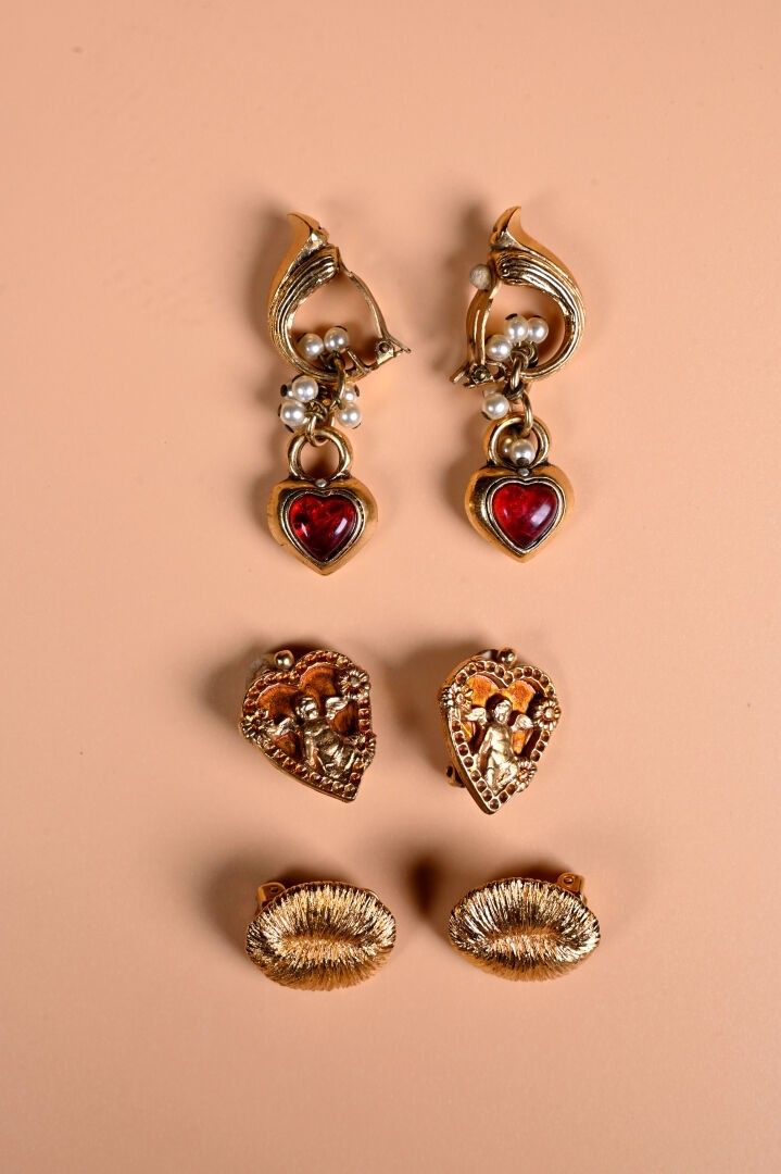 Three pairs of metal and stone ear clips, one heart-shaped b…