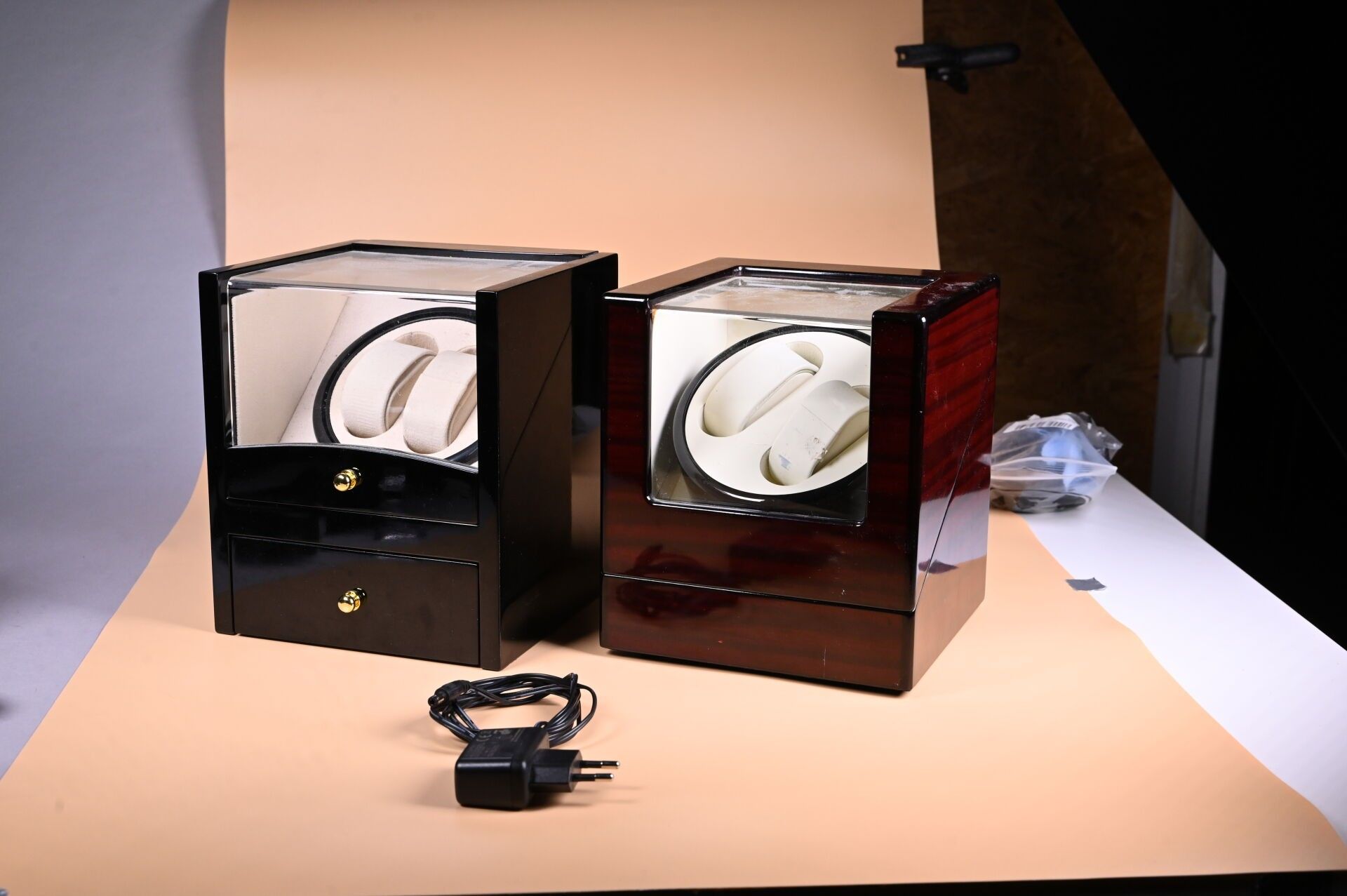 Two watch collector's boxes with double base. Allows watches to be reassembled using mains power.