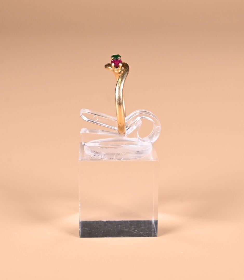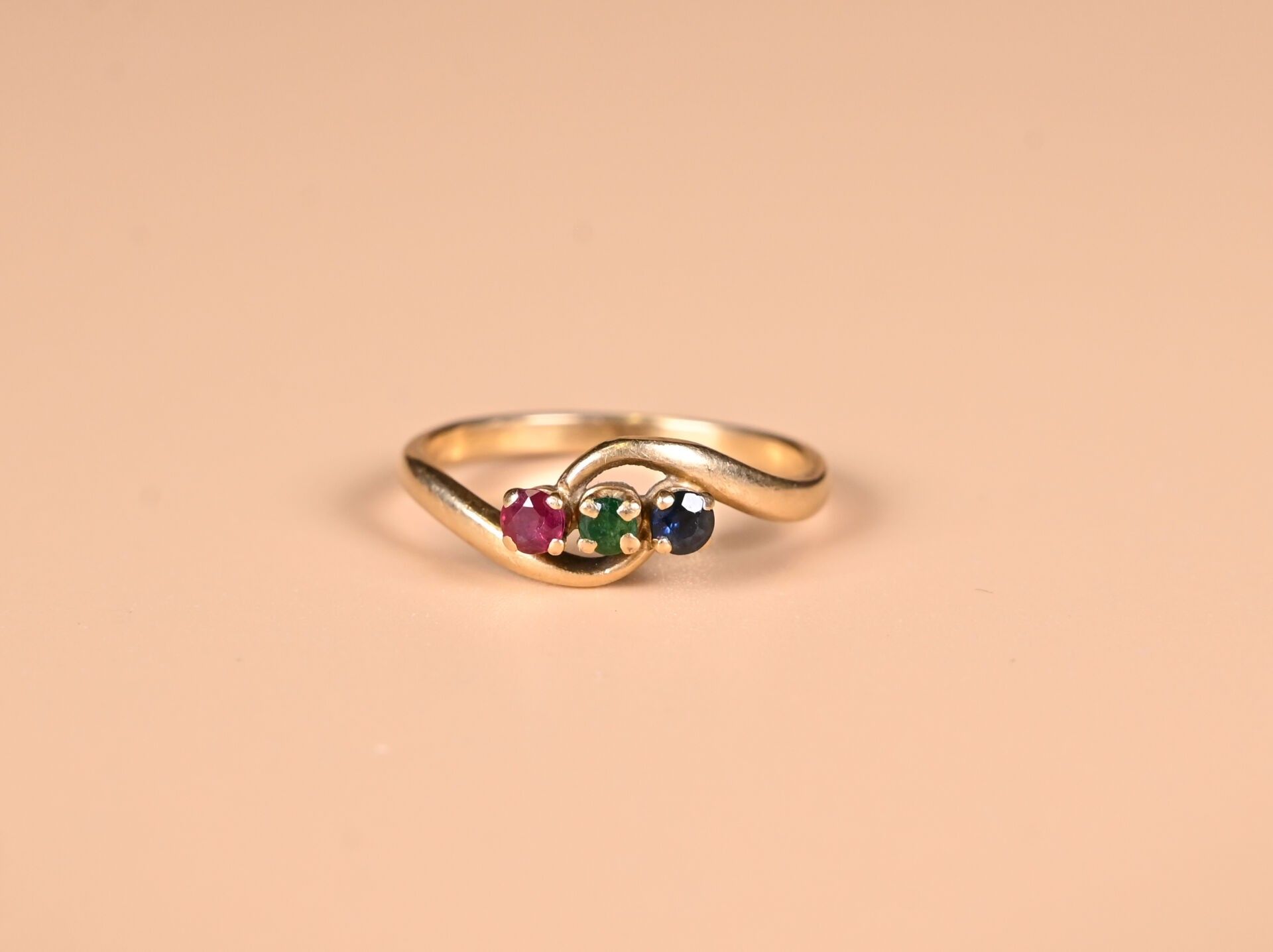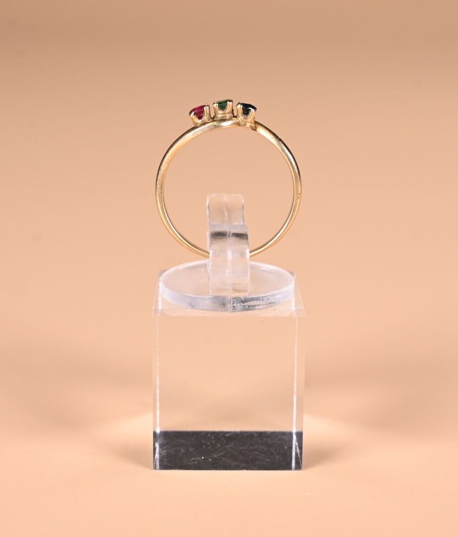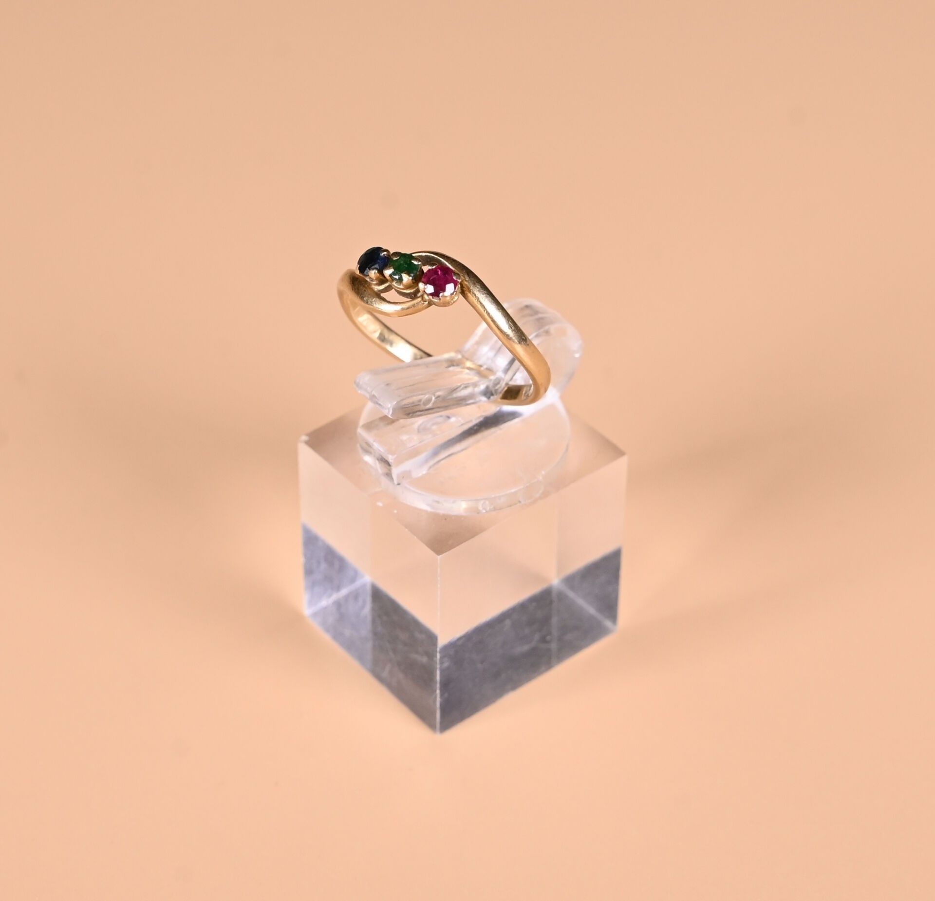 Ring in 18K yellow gold 750/1000th set with a trinity of stones: a sapphire, an emerald and a ruby. TDD. : 52. Gross weight : 2,01 g.