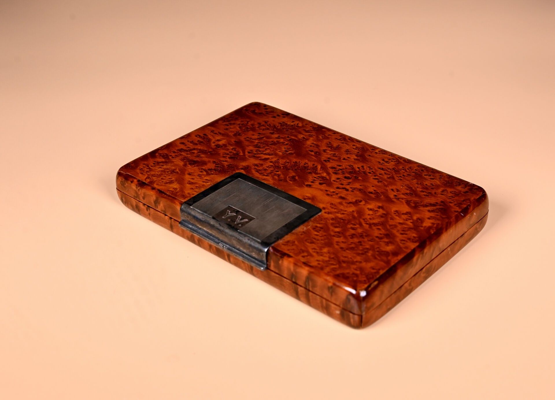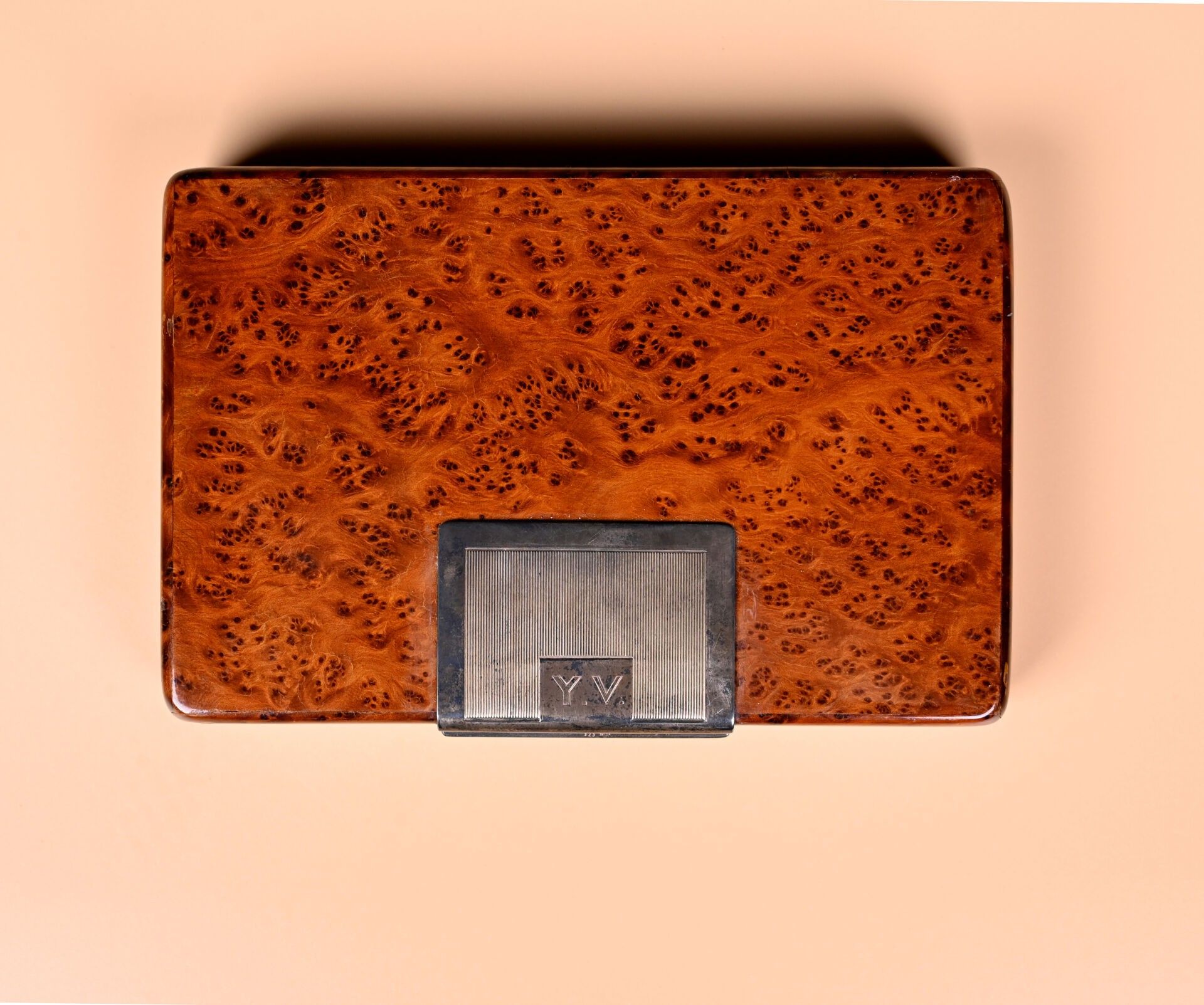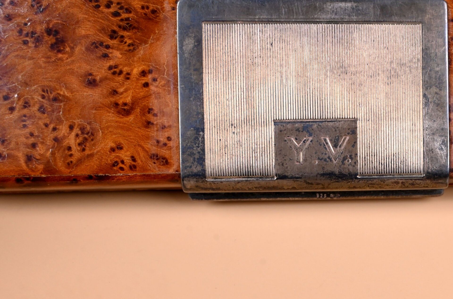 Burr and silver minaudière. The lid is adorned with a silver plate engraved with the initials Y.V. The interior has a compartment with a comb. Circa 1930. 2 cm - Width: 16 cm - Depth: 10.5 cm.