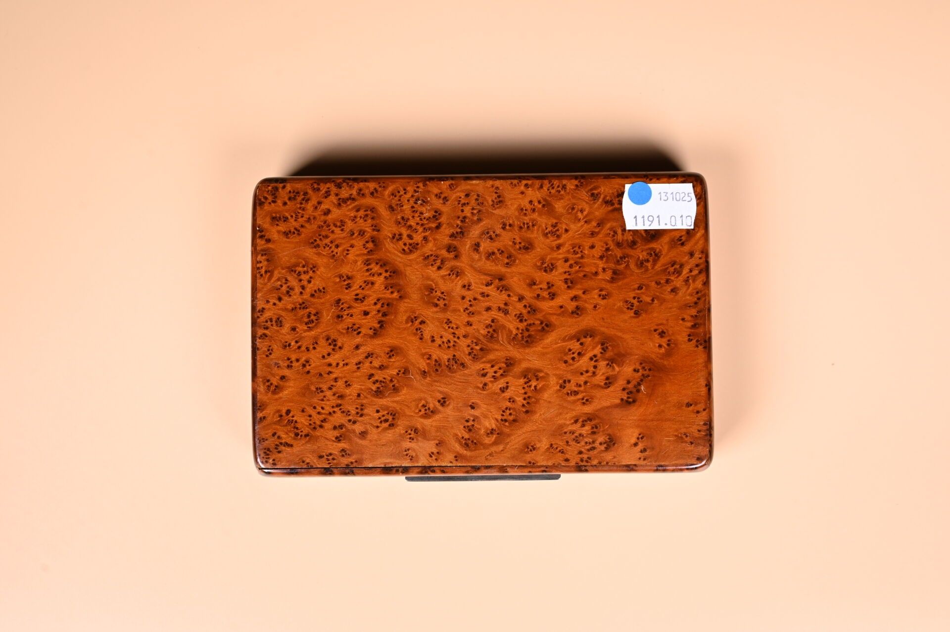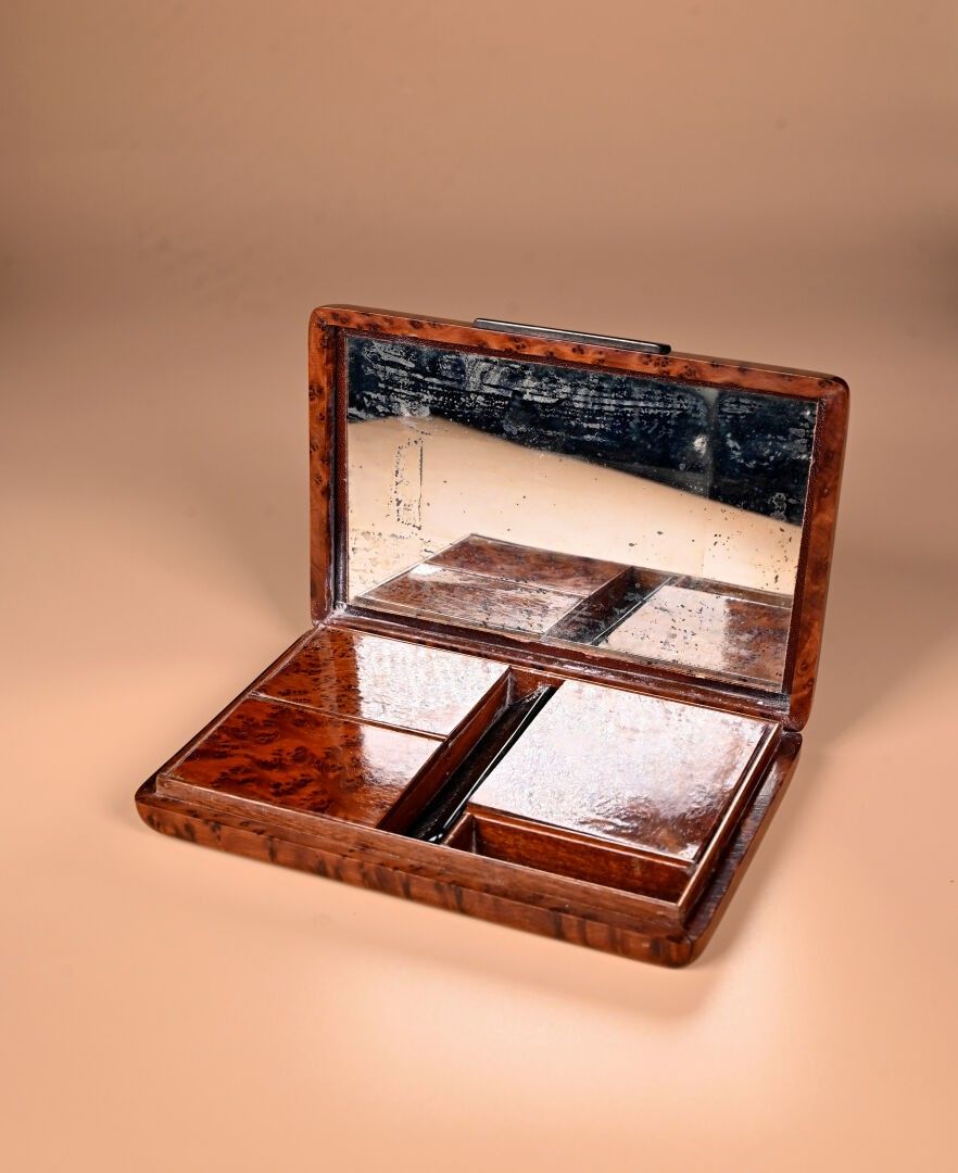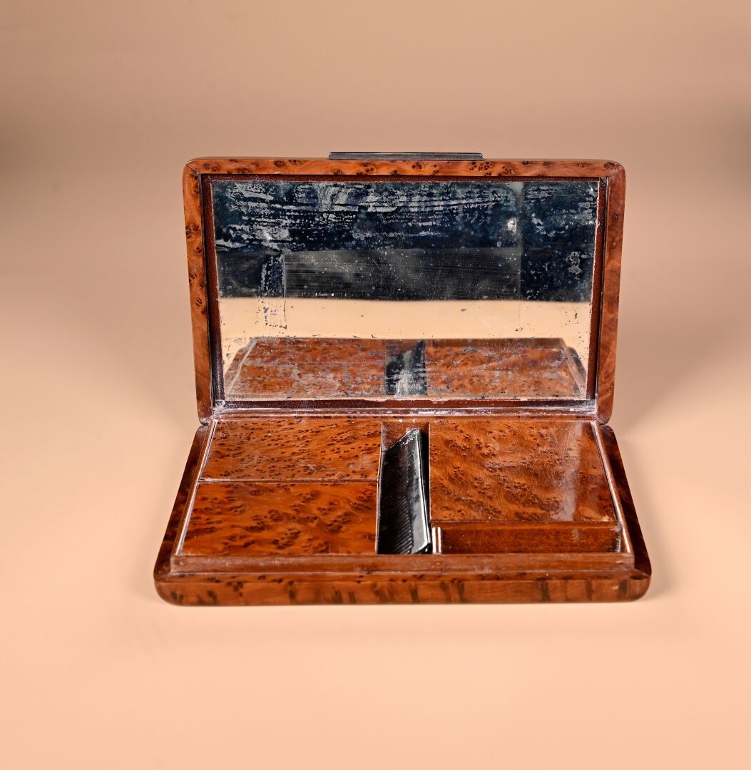 Burr and silver minaudière. The lid is adorned with a silver plate engraved with the initials Y.V. The interior has a compartment with a comb. Circa 1930. 2 cm - Width: 16 cm - Depth: 10.5 cm.