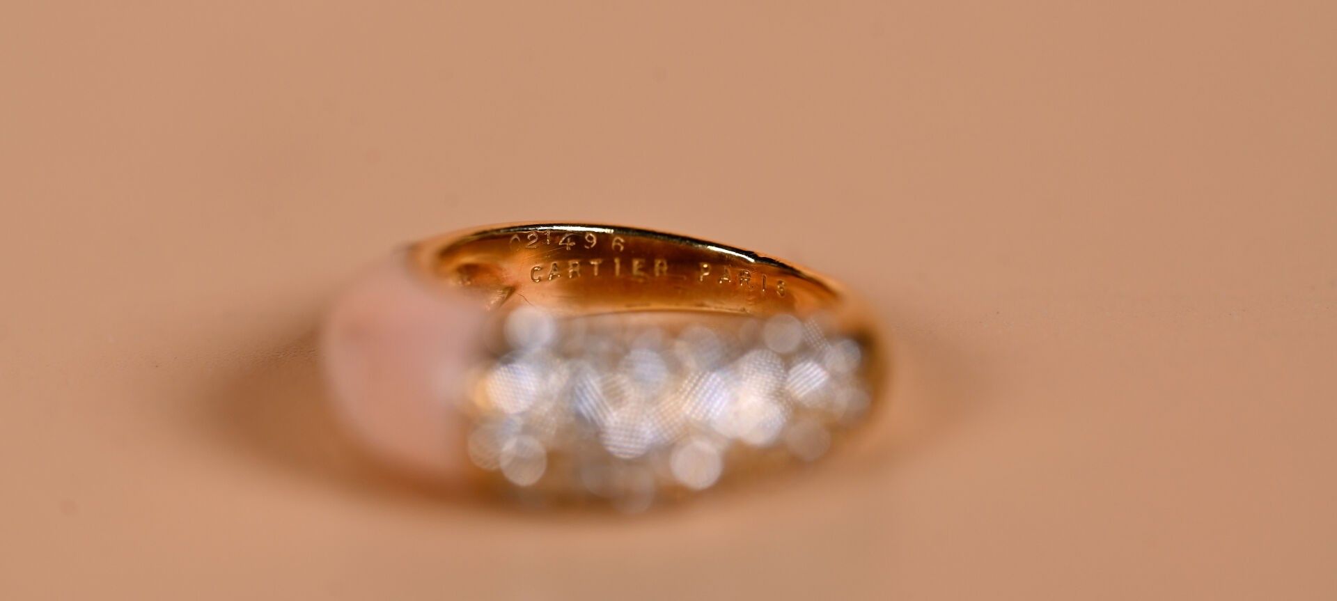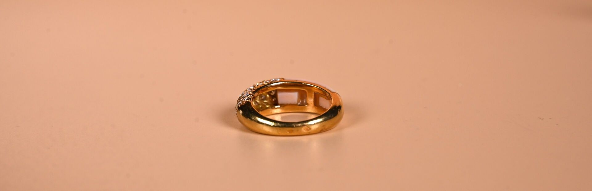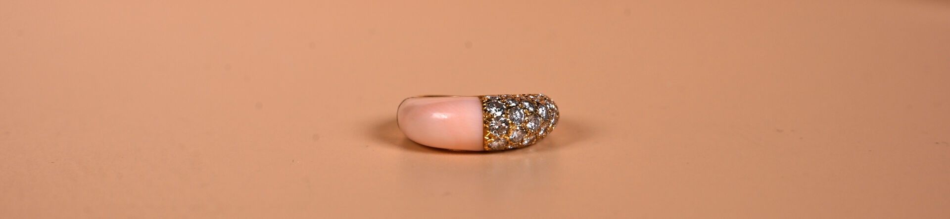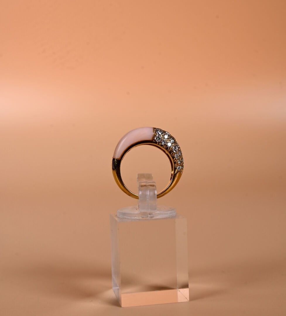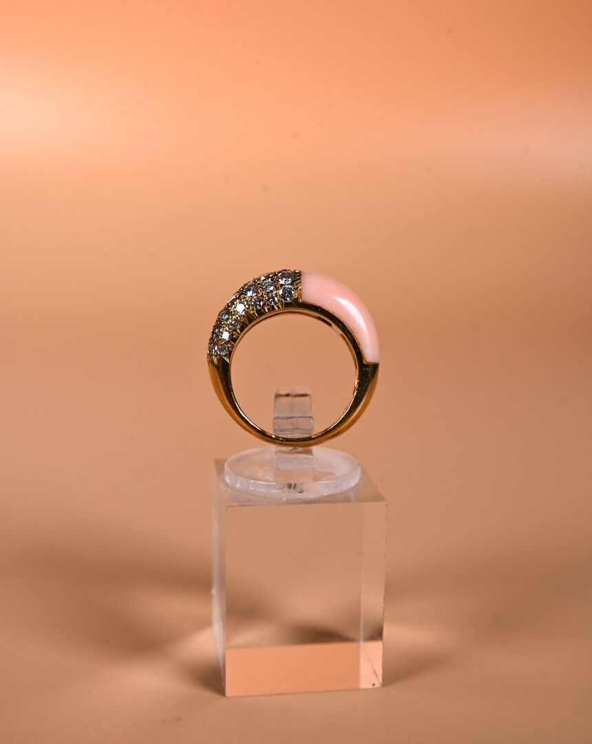 CARTIER Paris. Ring in 18k yellow gold paved with modern-cut diamonds facing an angel-skin coral cabochon. Signed and numbered on the inside. TDD 49. Good condition. Gross weight: 6.4 g Eagle