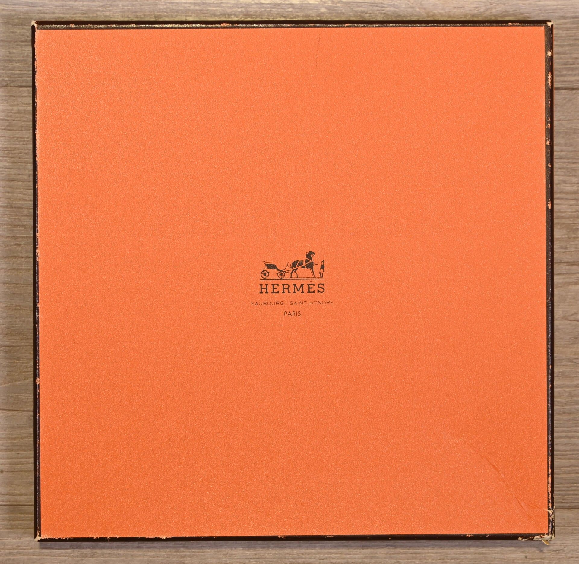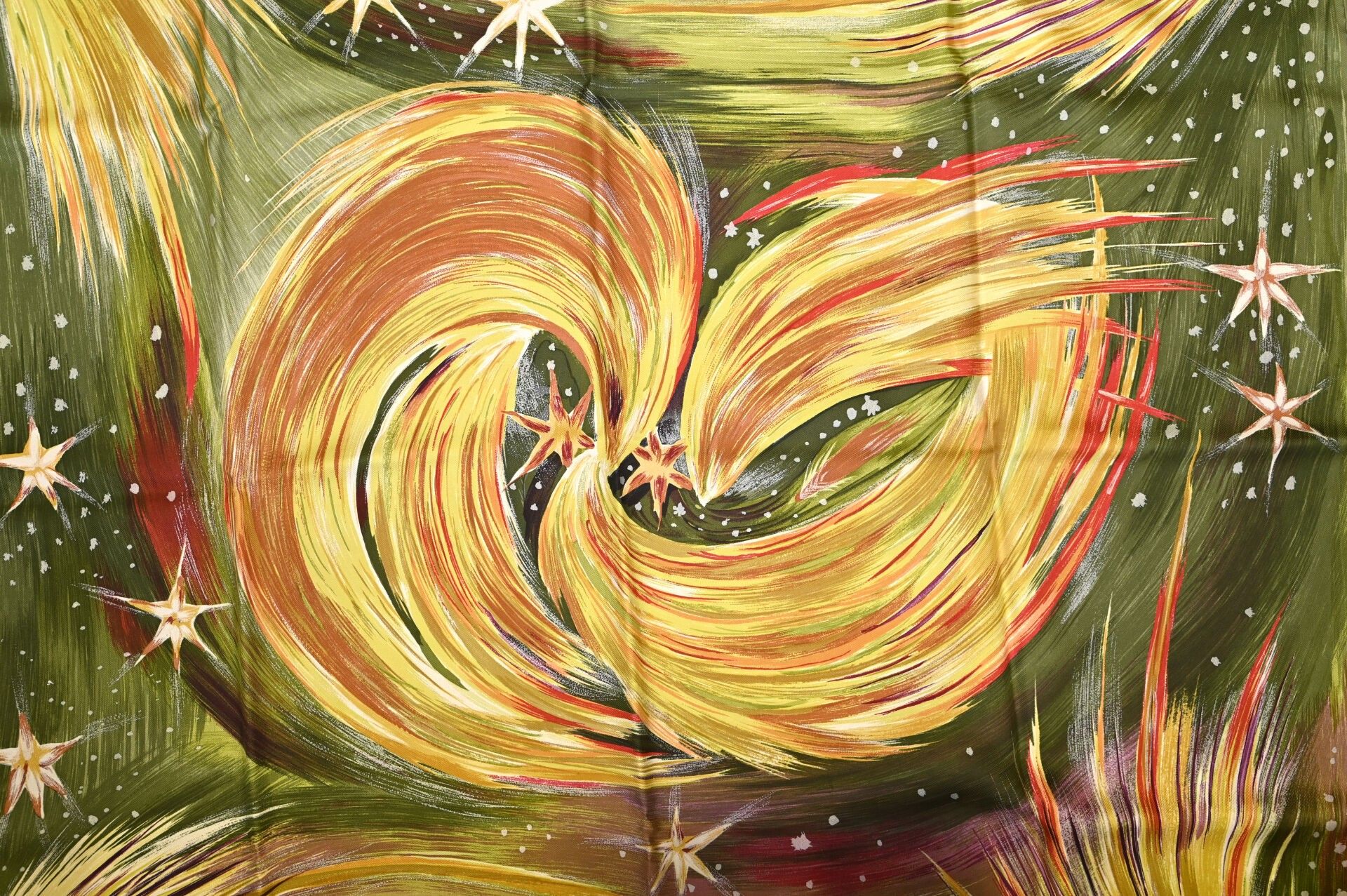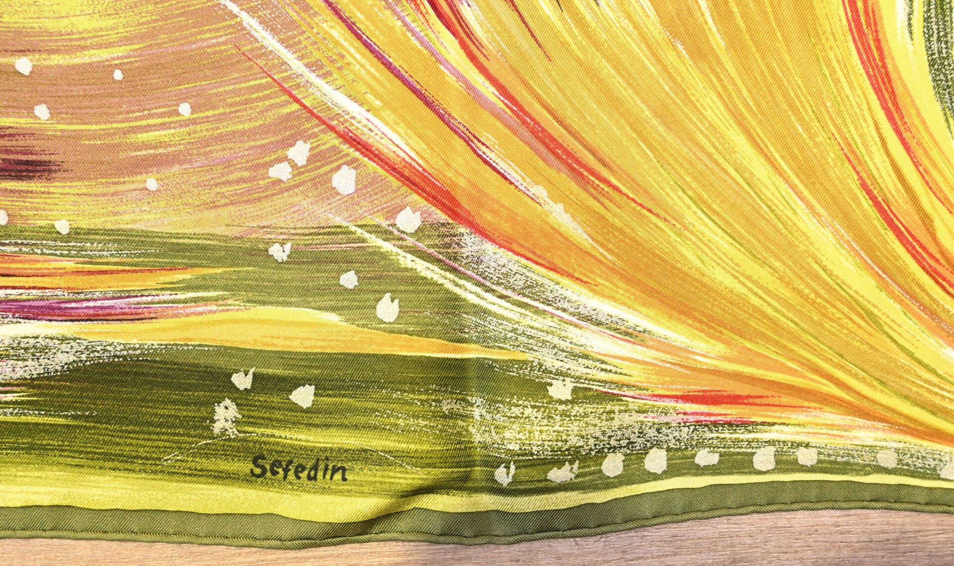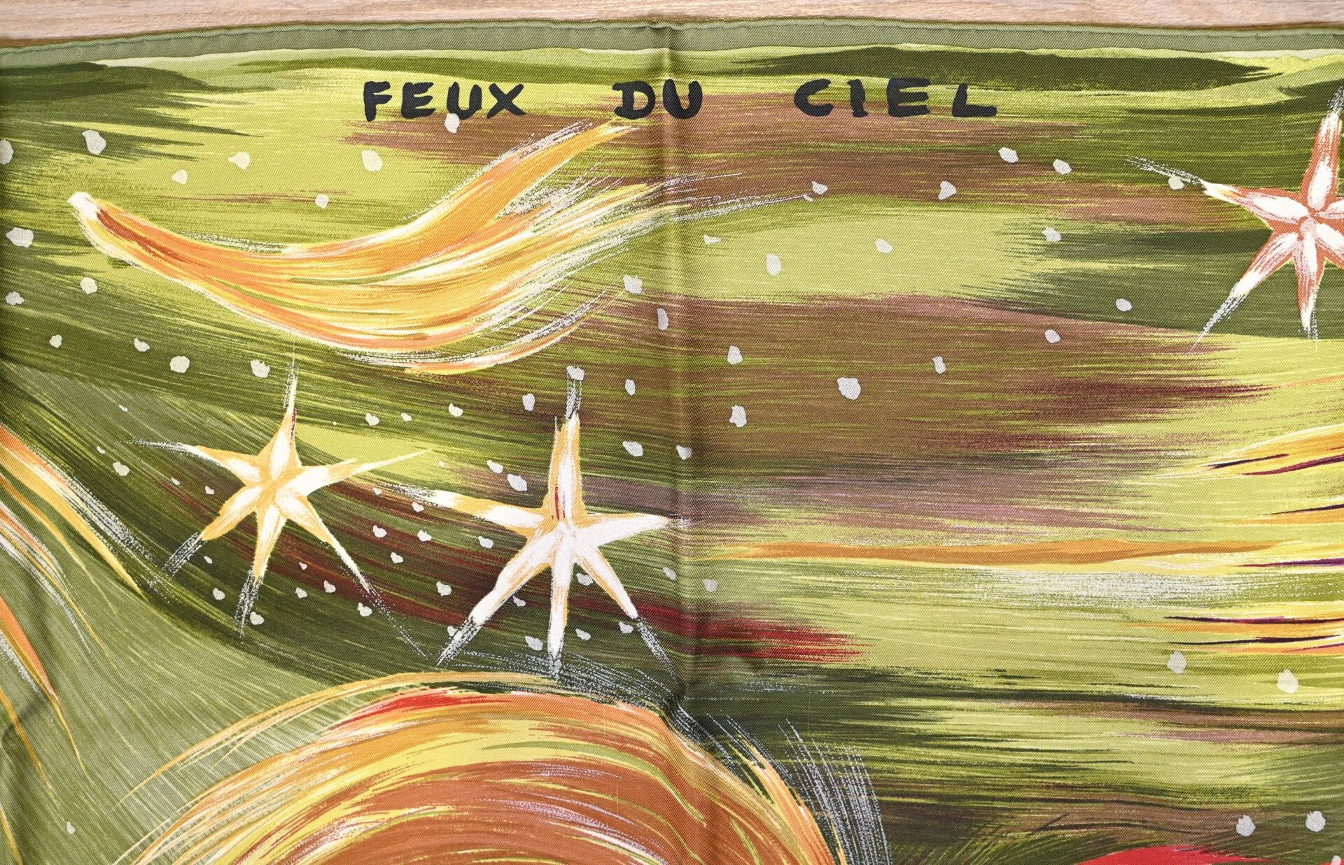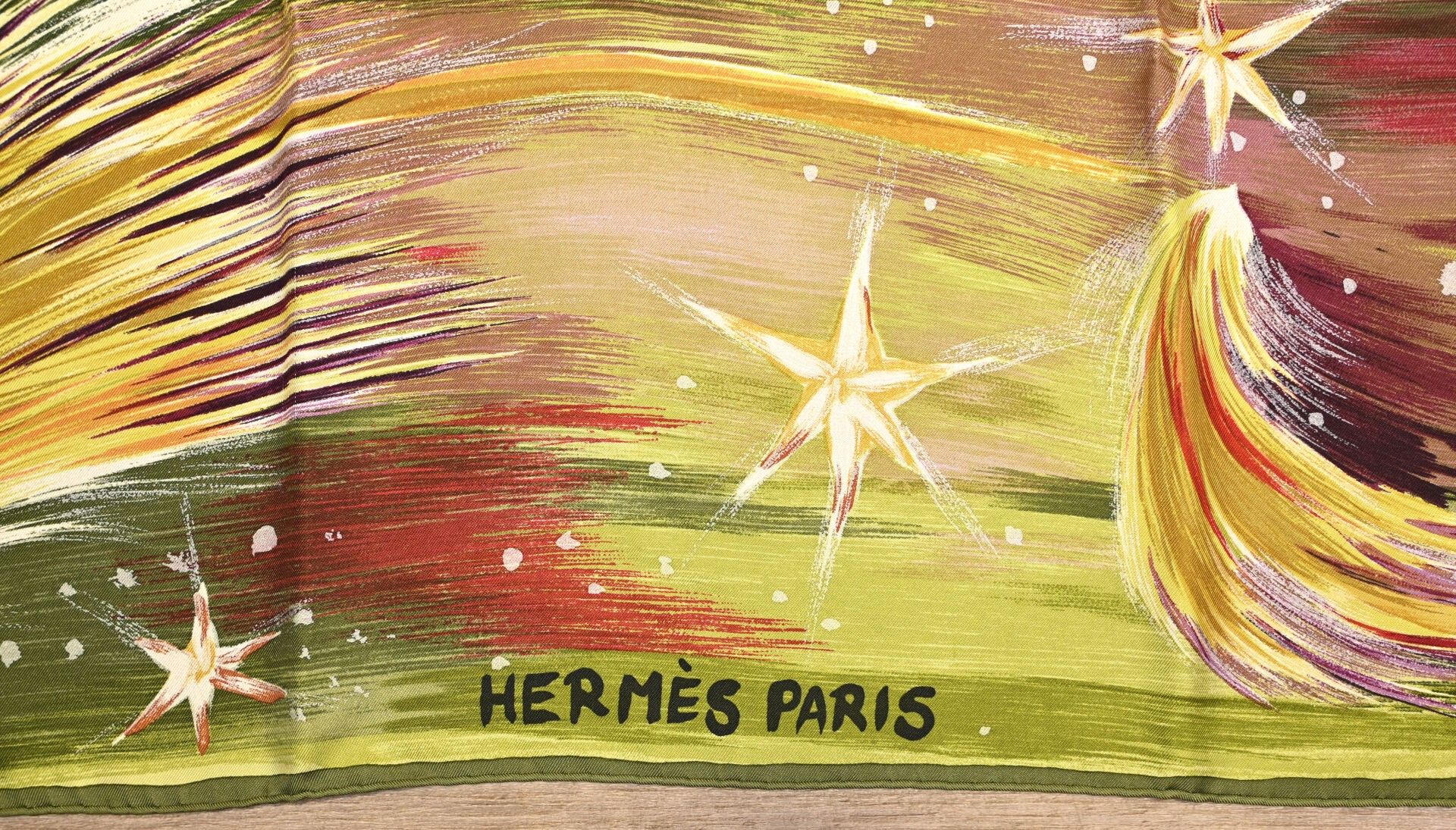 HERMES PARIS. Silk square model "Feux du ciel" signed Kwumi Sefedin (Sefedin Ibrahim Alamin) with ochre, teracota decoration on green background (small stains, some threads pulled). Marked. 90 x 90 cm. Boxed.