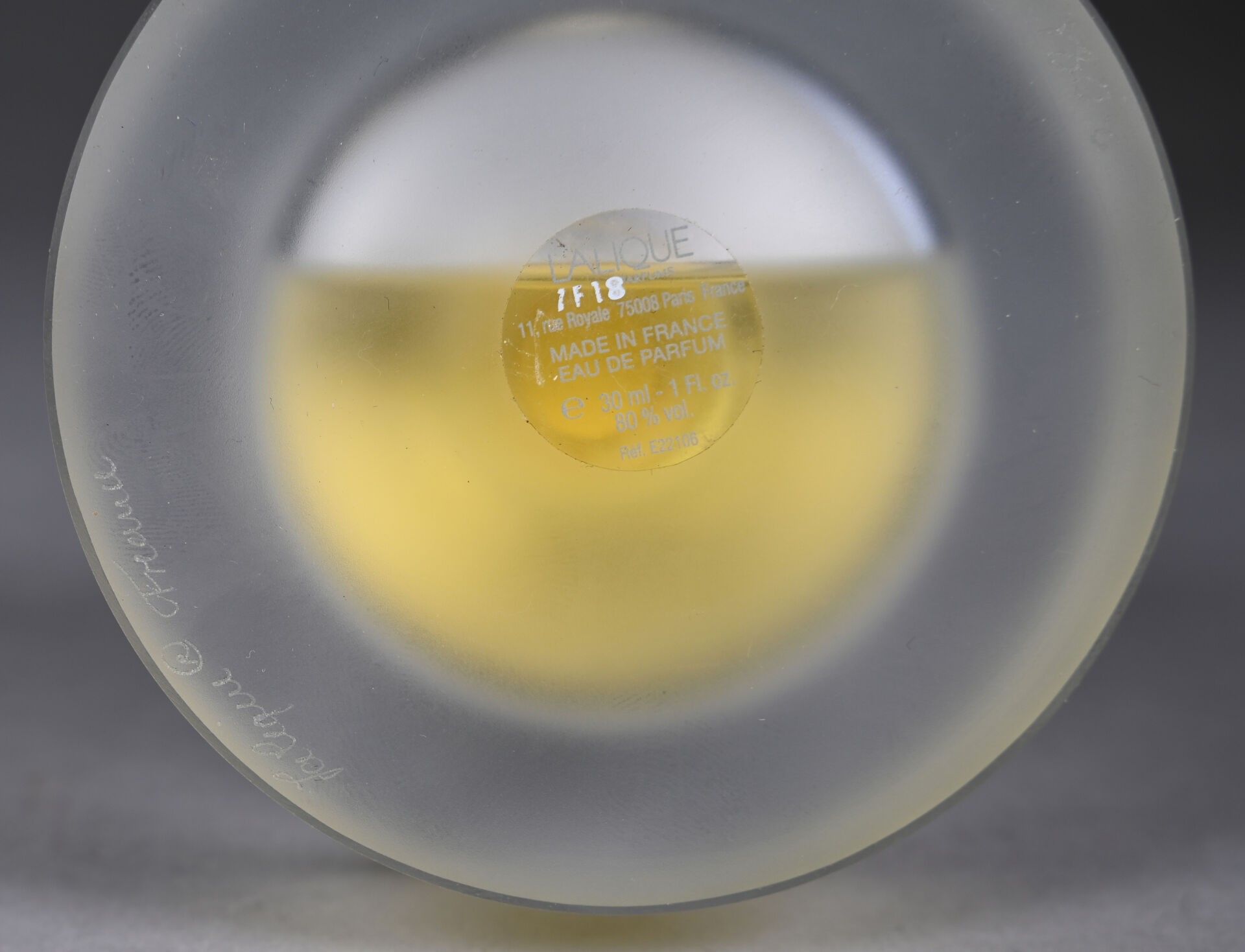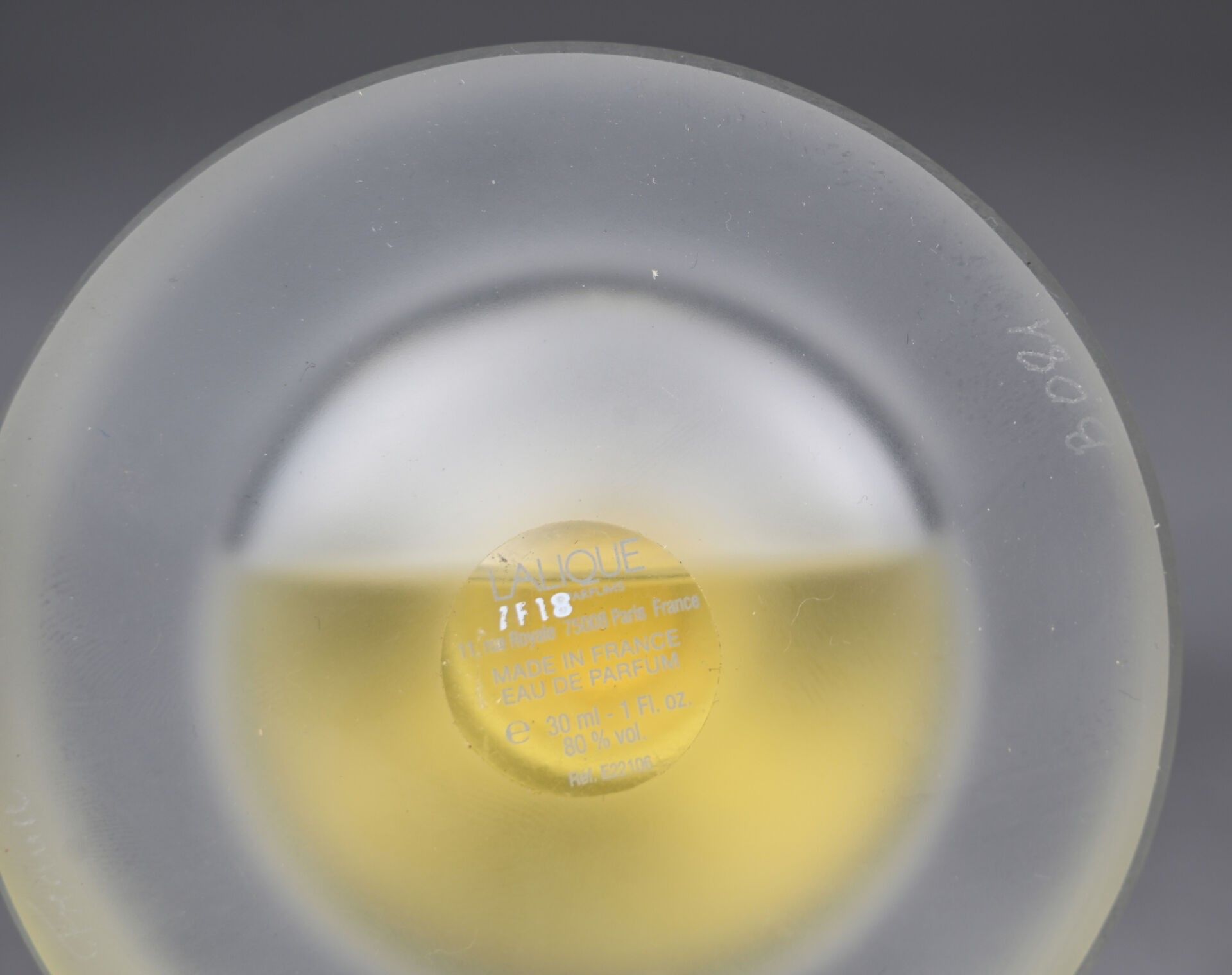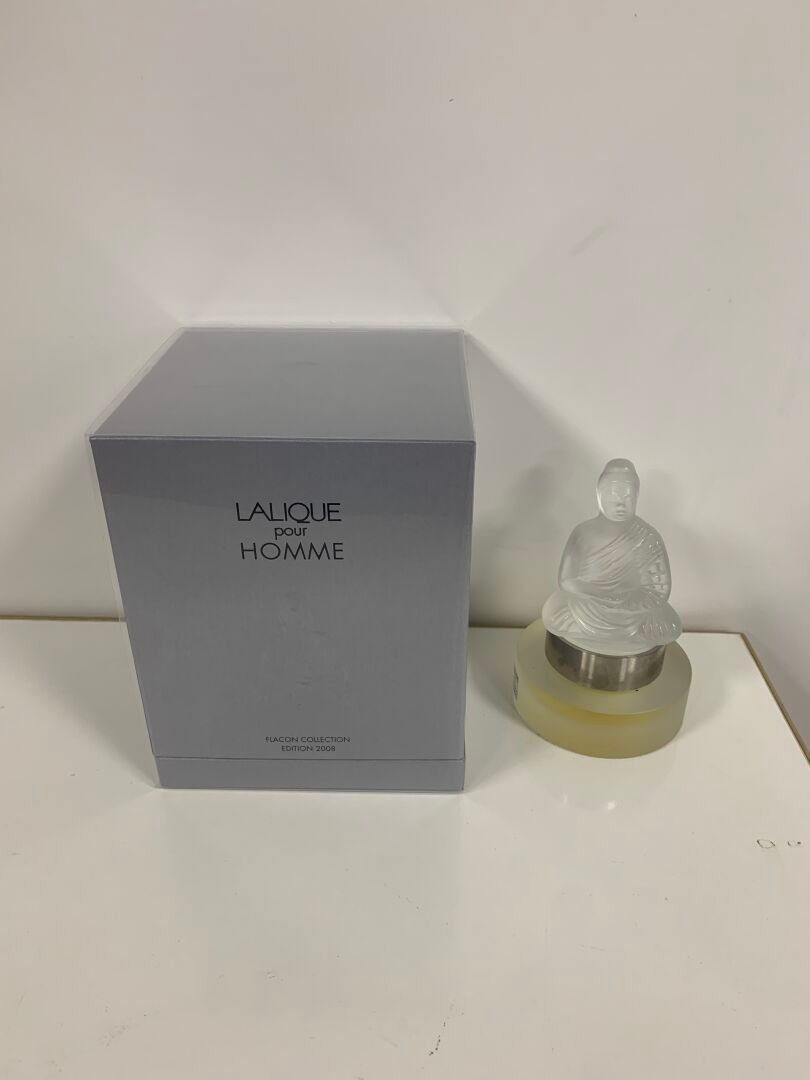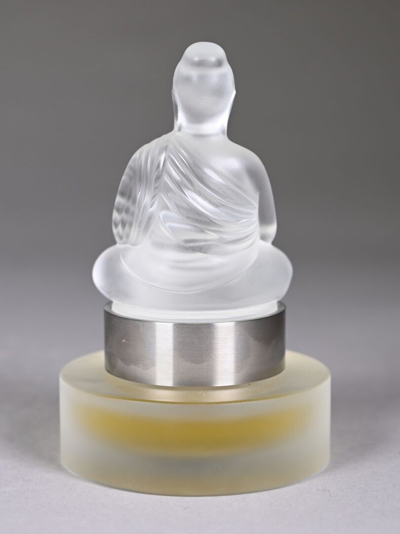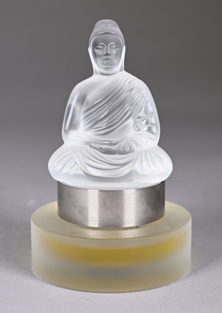 Mascot bottle in colourless and frosted pressed moulded crystal, cylindrical in cross-section, its stopper depicting a meditating Buddha containing 30 mL of eau de parfum. Numbered B081. Signed LALIQUE France. Height Height : 14 cm. Accompanied by its box.