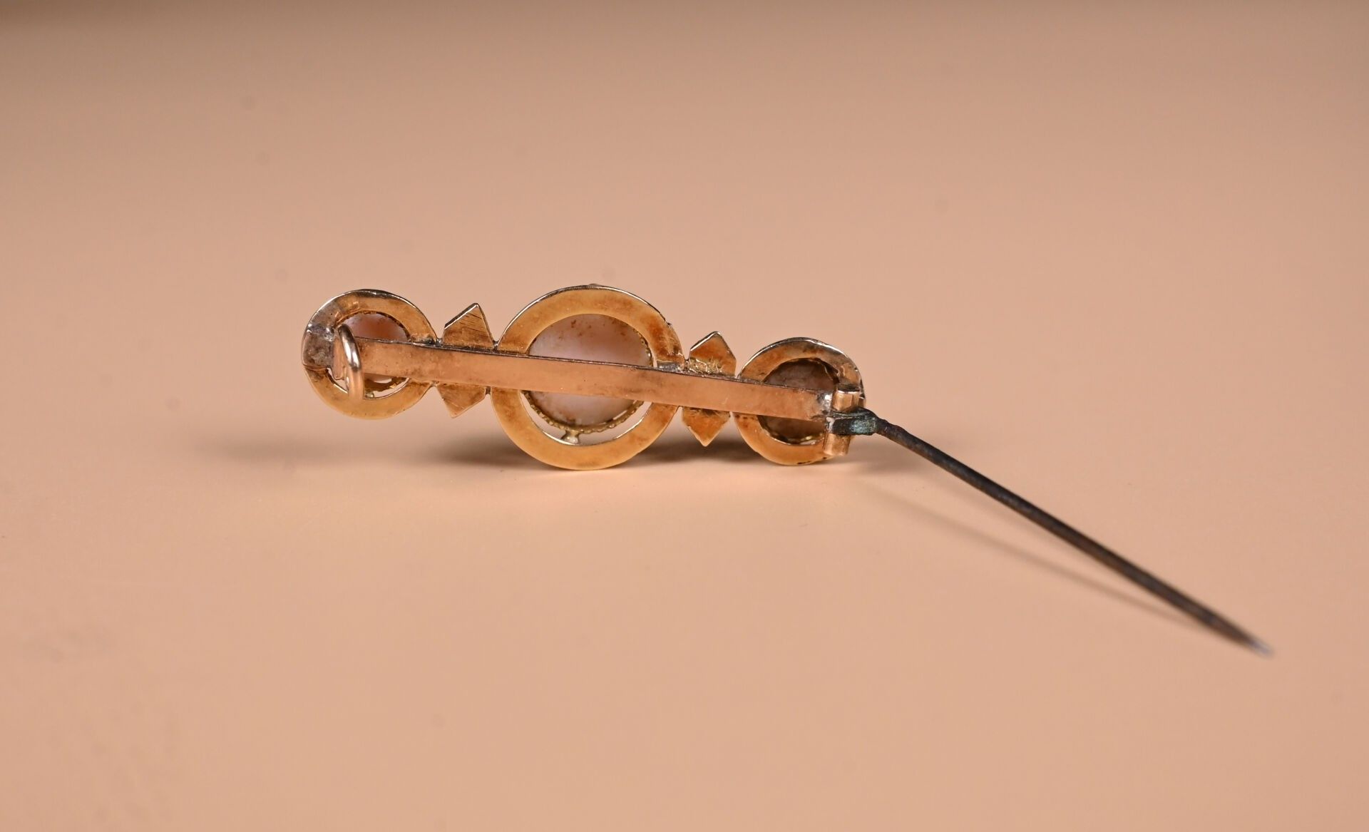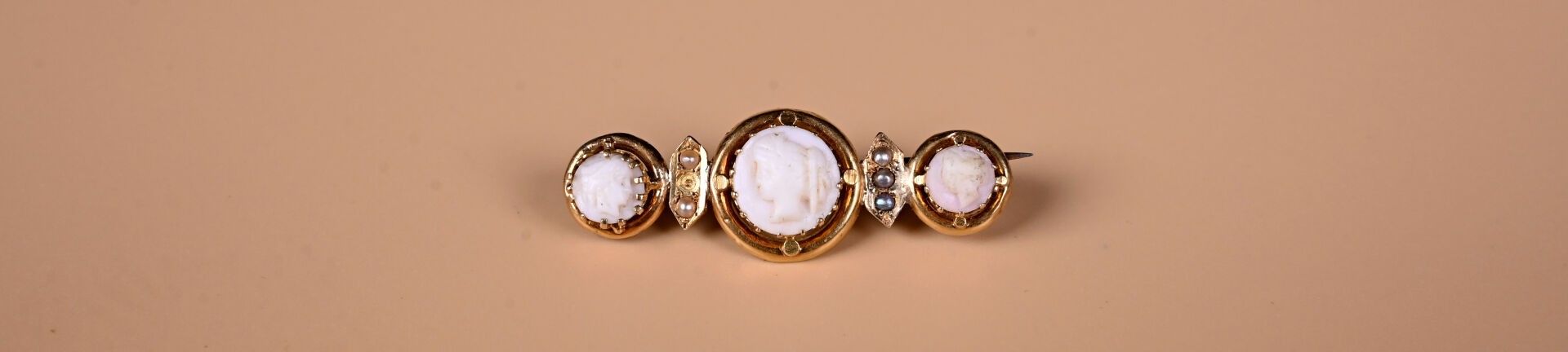 Antique brooch in 18k 750 thousandths gold with three round motifs with cameos (pink shell) and pearl seeds (one missing). Length: 4 cm. Metal needle. Gross weight: 3.4 g.