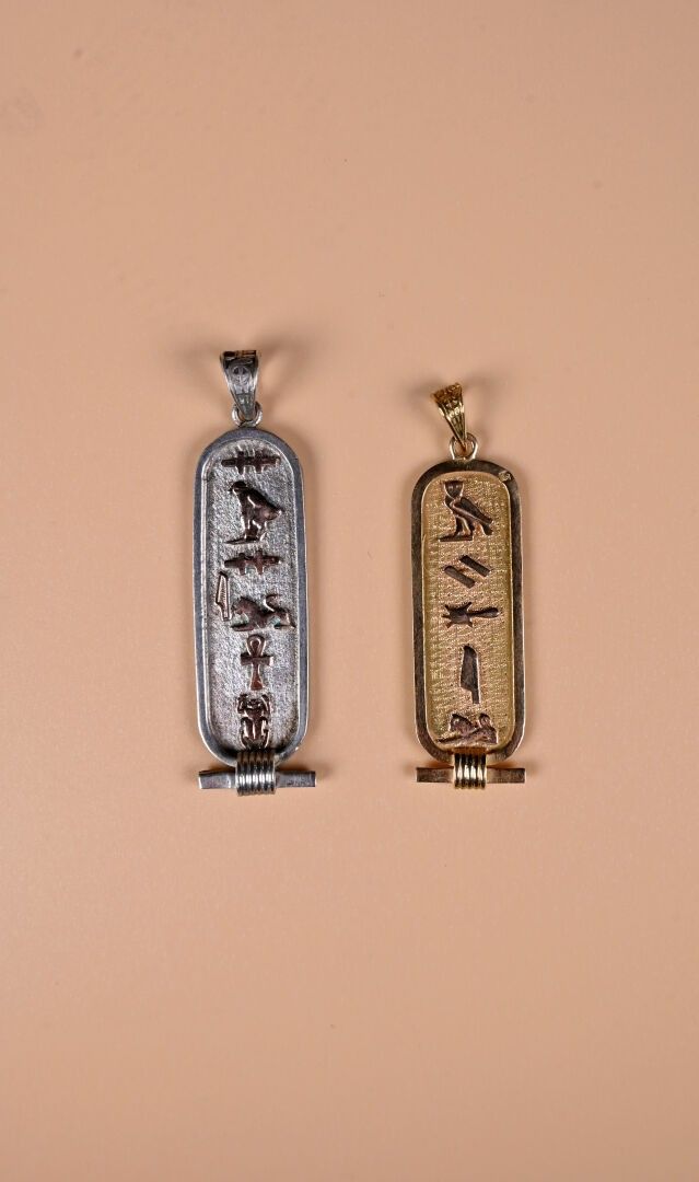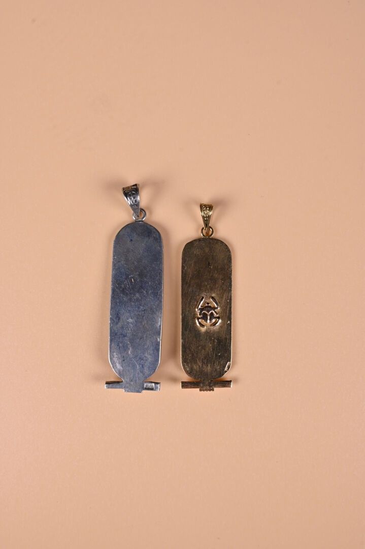 Egyptian cartouche pendant in 18K 750/1000 yellow gold. Length : 5 cm. Weight : 3,5 g. A silver 925/1000th cartouche pendant. Weight : 5,8 g.