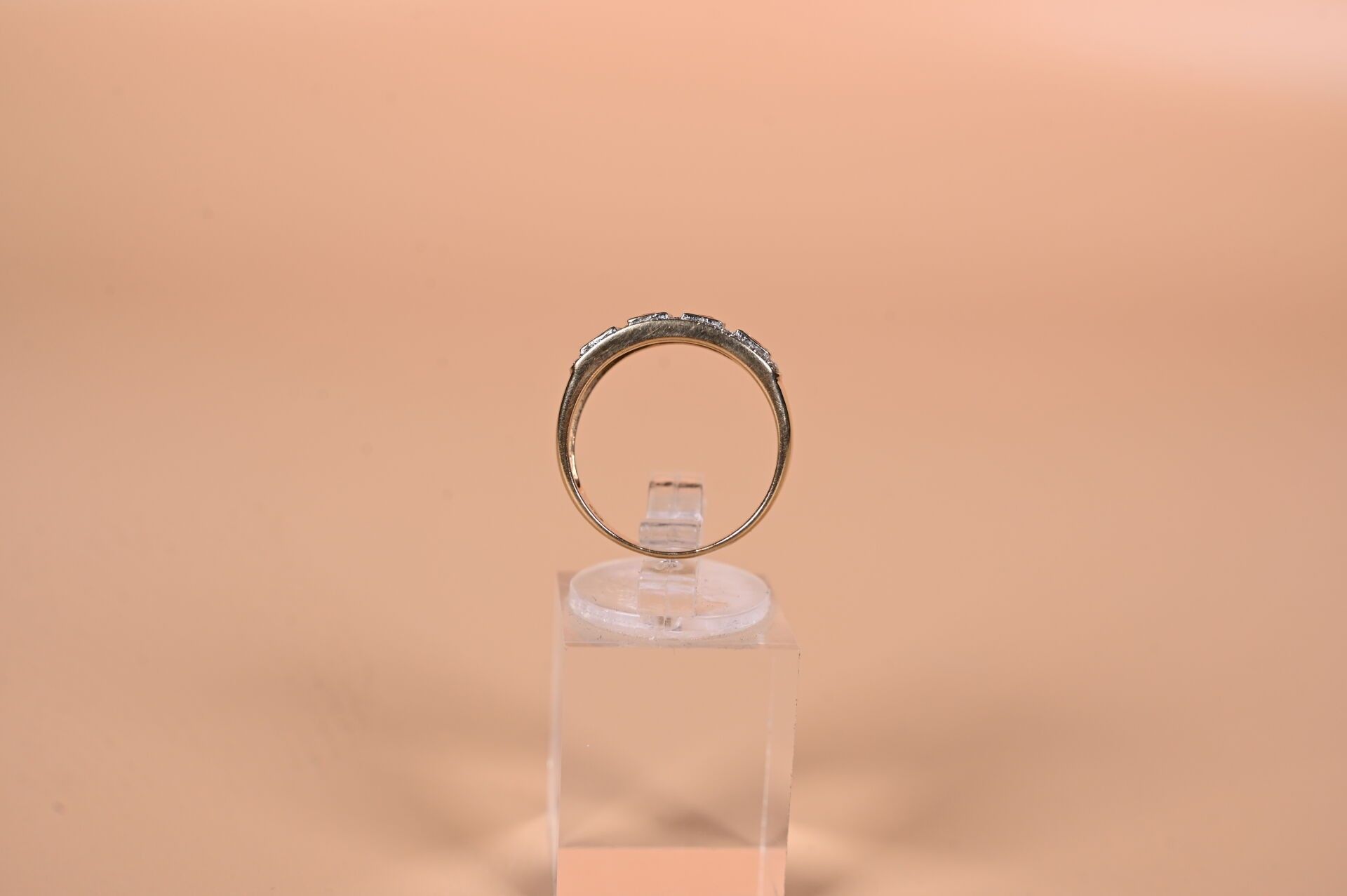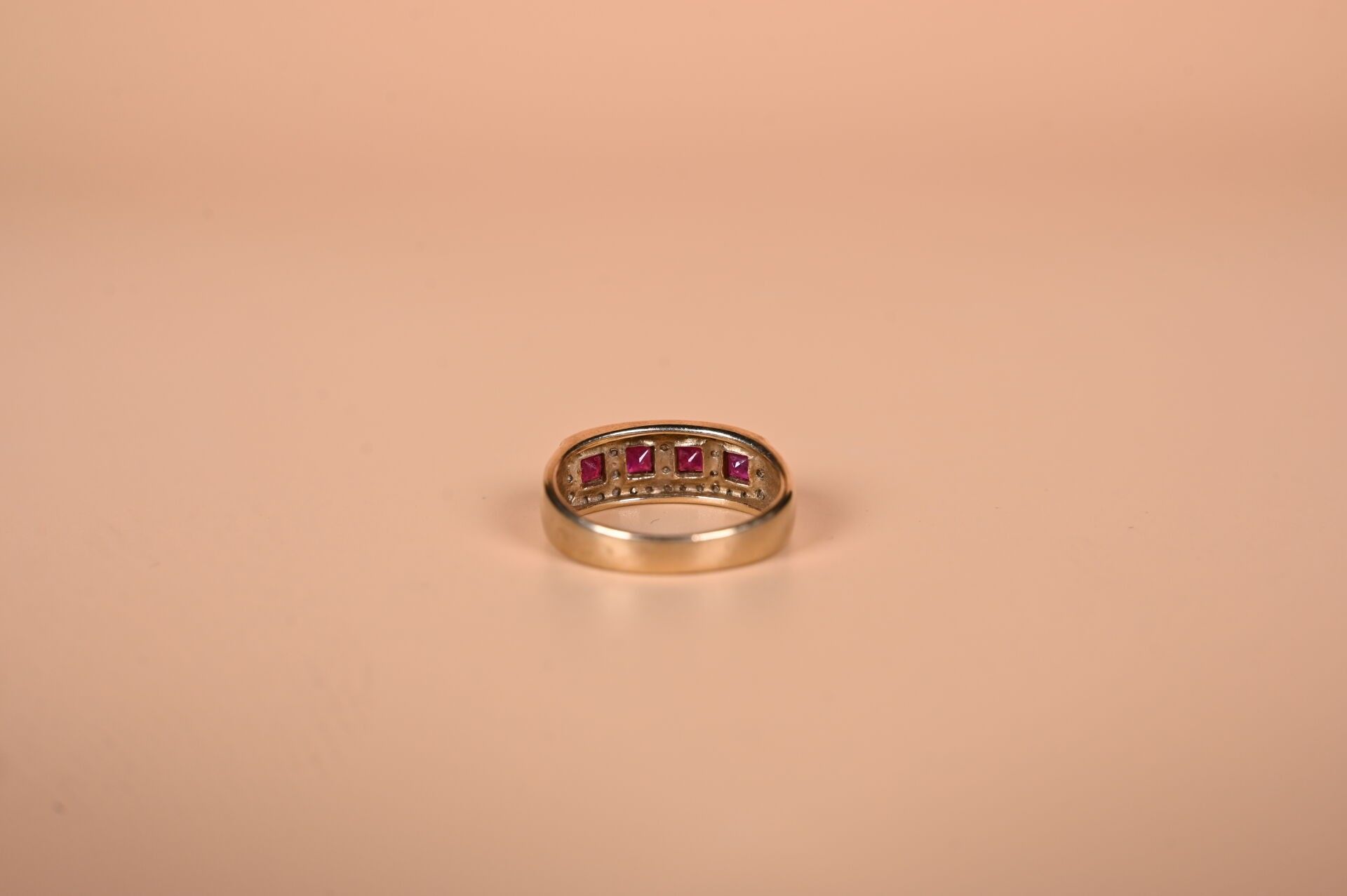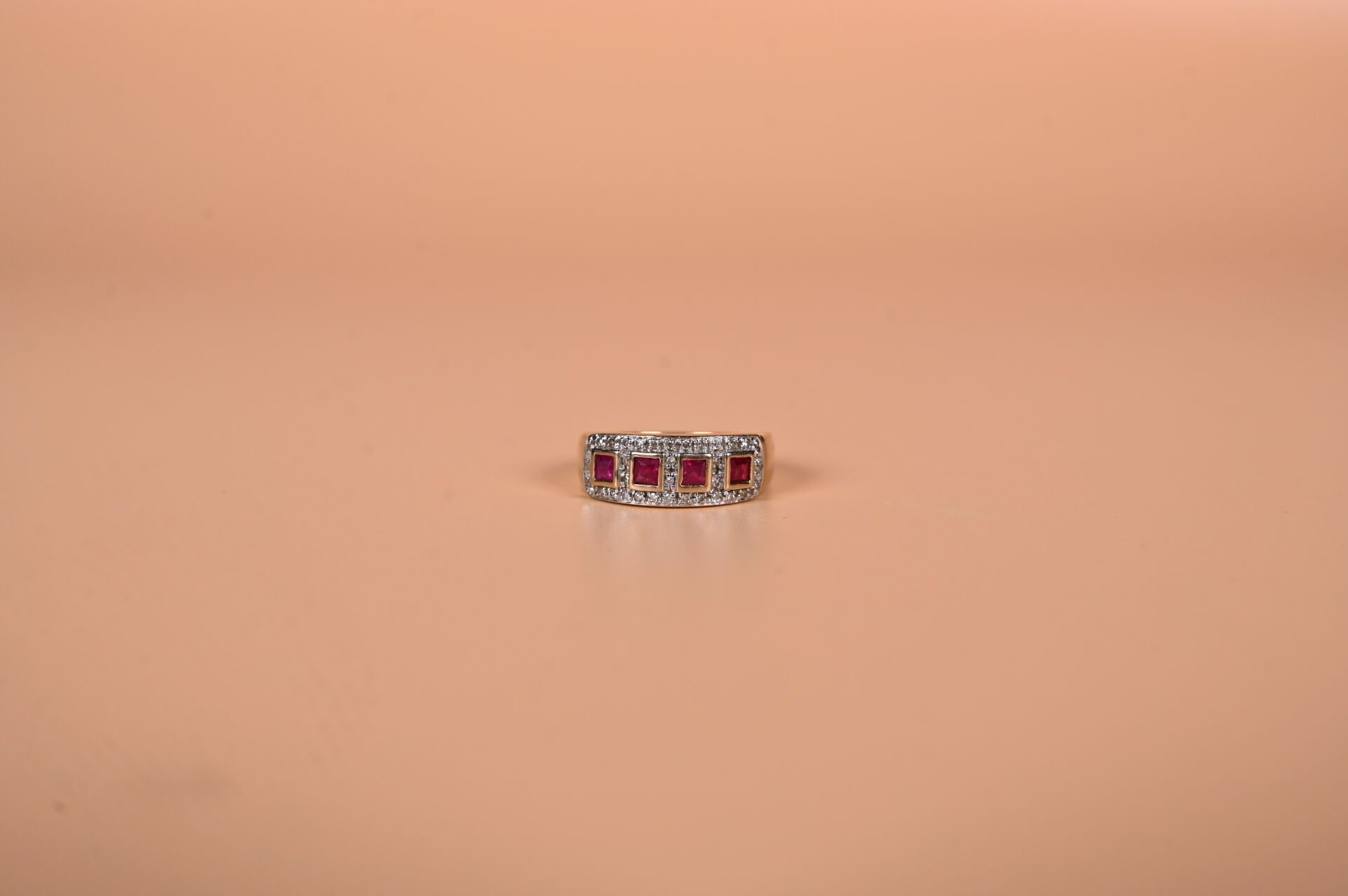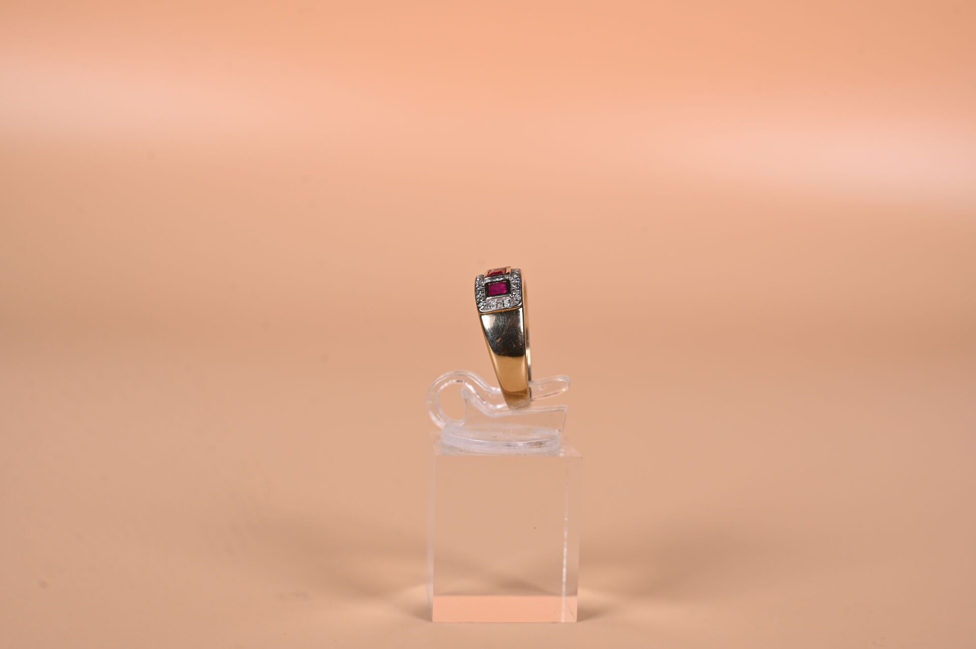 Ring in 373 thousandths (9k) yellow gold with calibrated synthetic rubies and small diamonds. TDD 56. Gross weight: 3.3 g. The lot will be hallmarked before the sale.