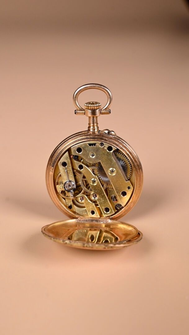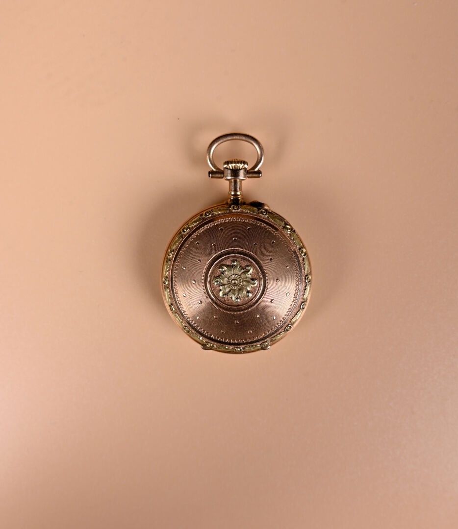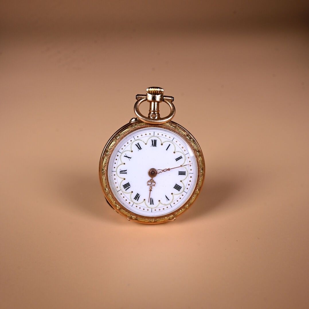 2 gold 18K 750/1000 collar watch with chased foliage decoration. Late 19th century. Gold dust cover. Gross weight : 20 g.