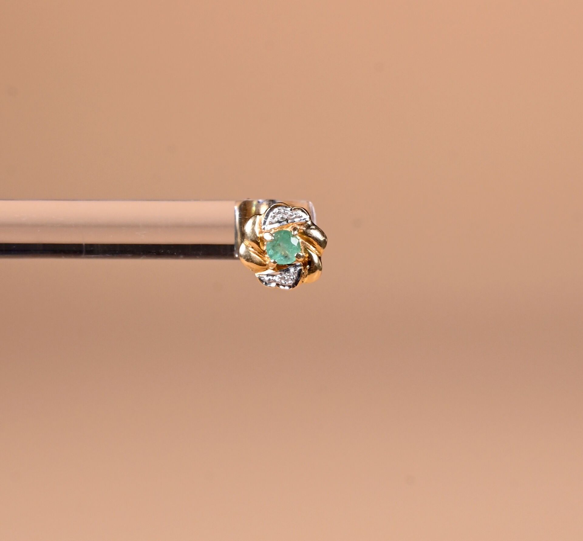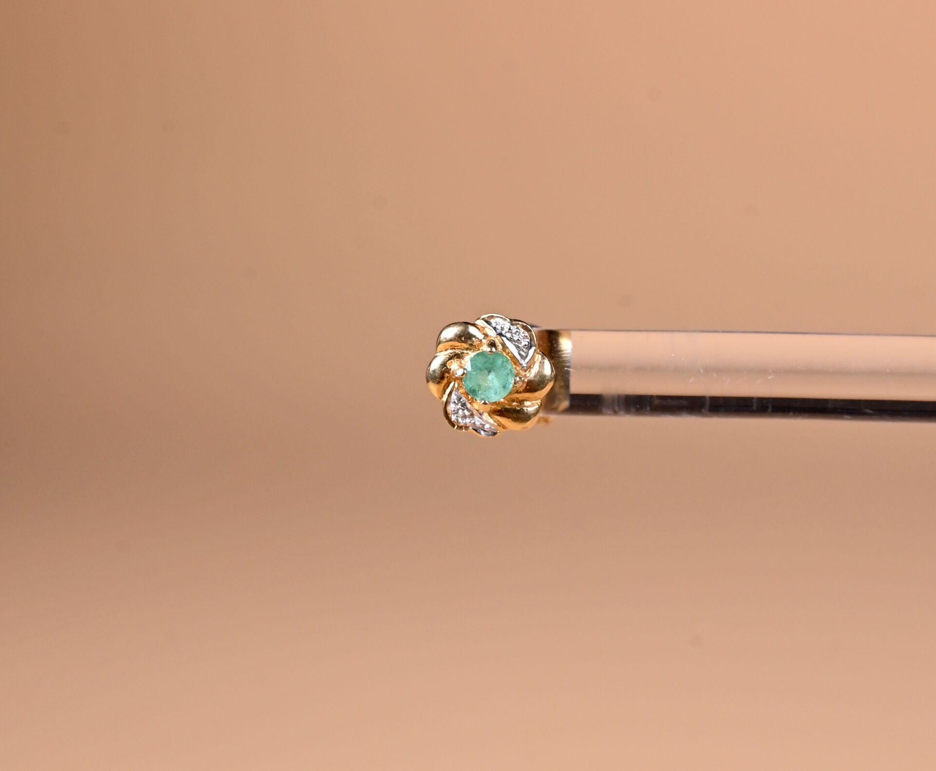 Pair of earrings in 18K yellow gold 750/1000e centred with an emerald. Gross weight : 1,2 g. Poussettes attached.