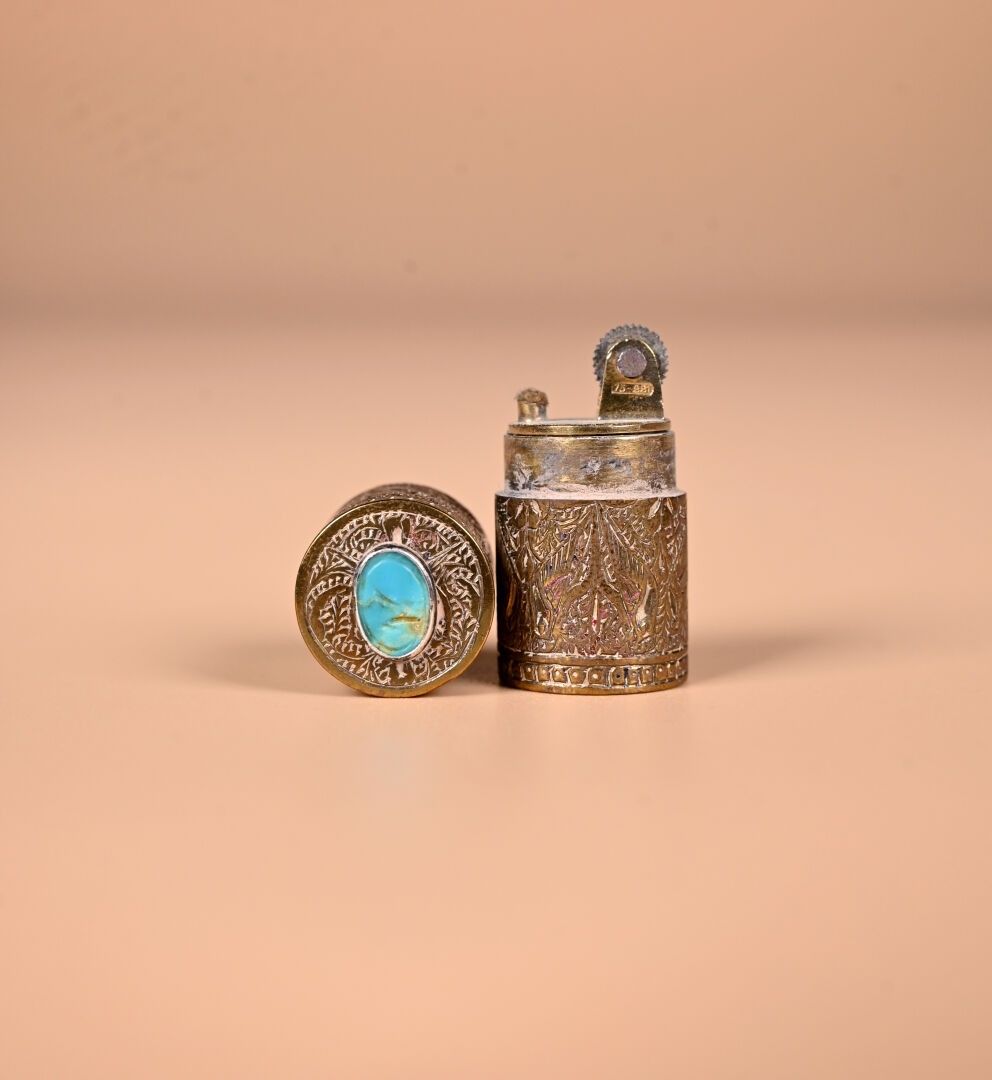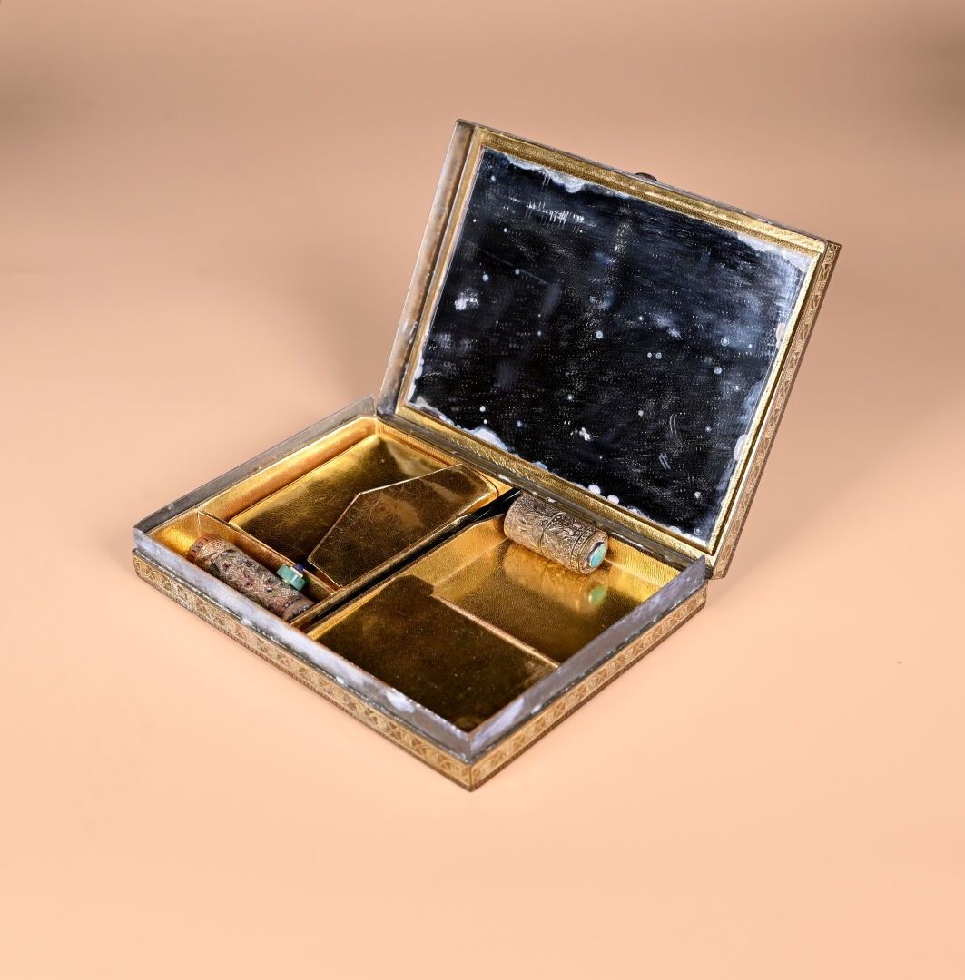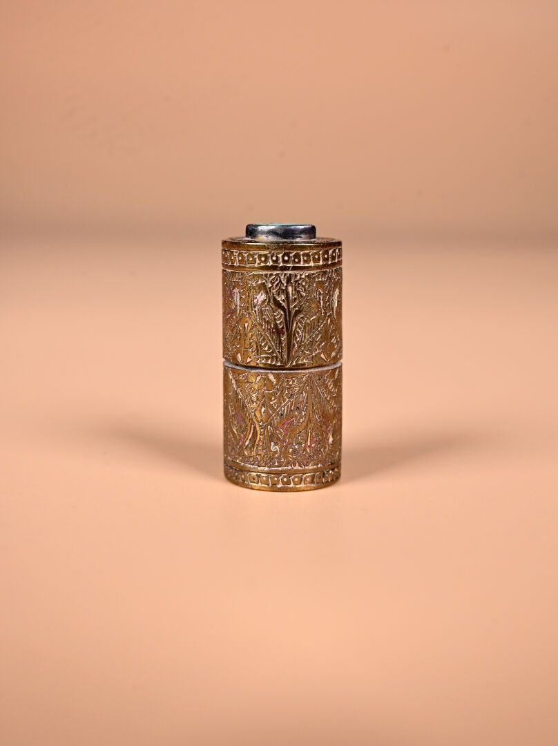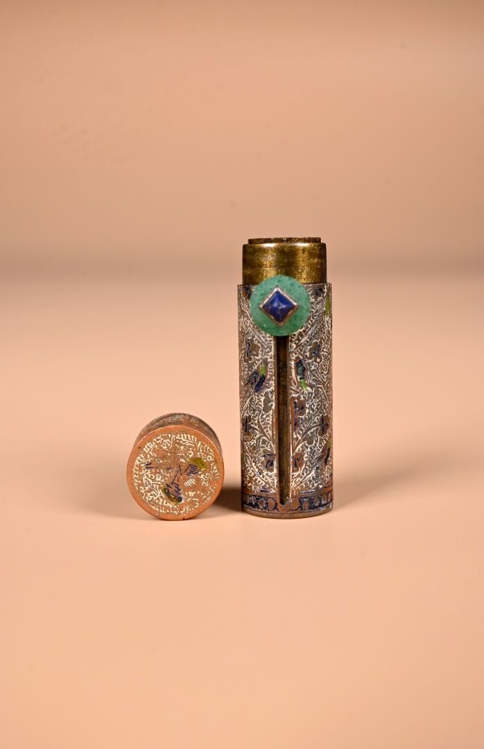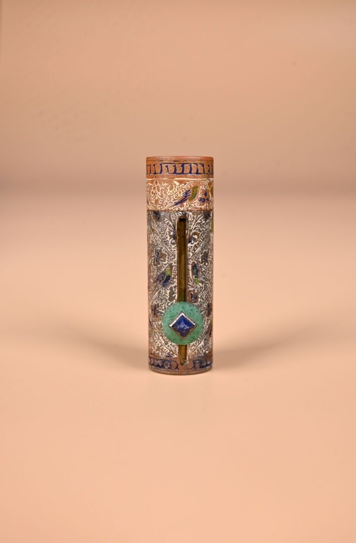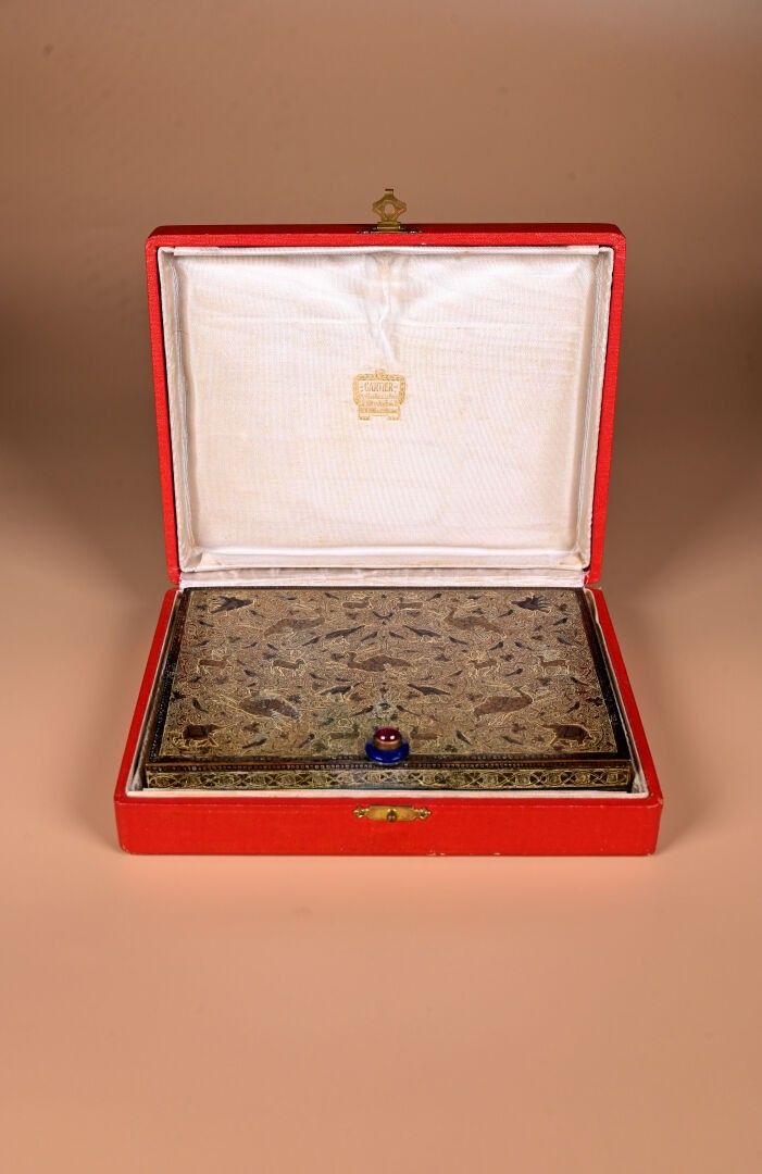 CARTIER. India Rajasthan. Copper minaudière with chased animal decoration. Cabochons of aventurine quartz, lapis and ruby coloured stones. With case for red and lighter. Original case. Circa 120. The card will be completed in the coming days.