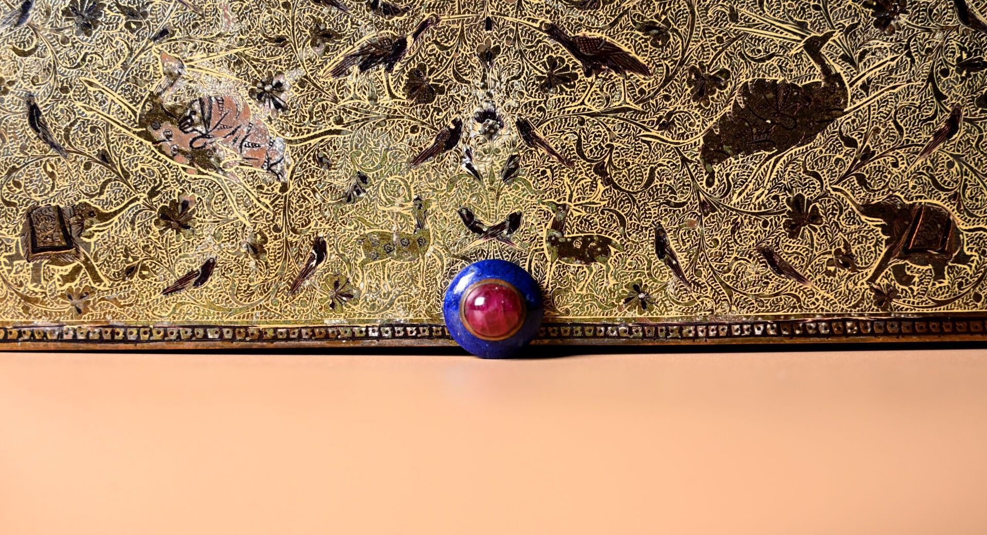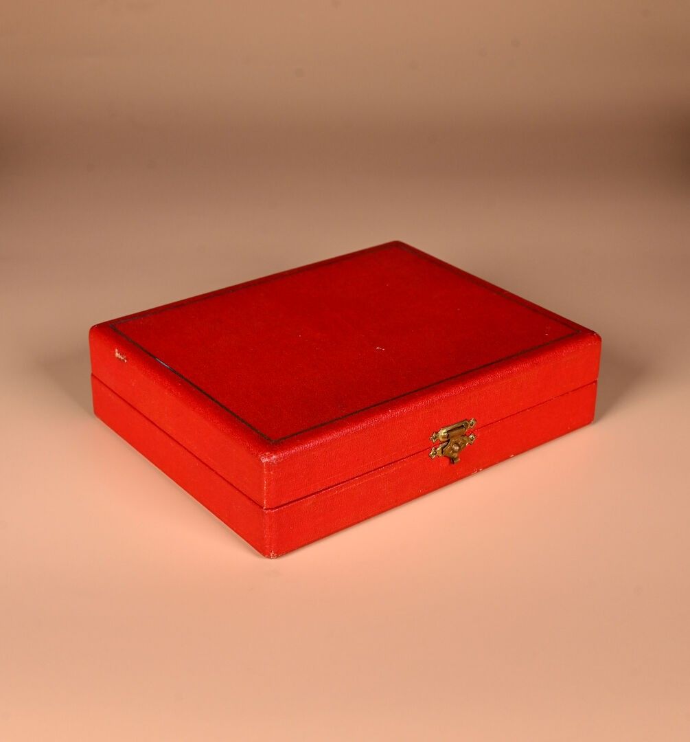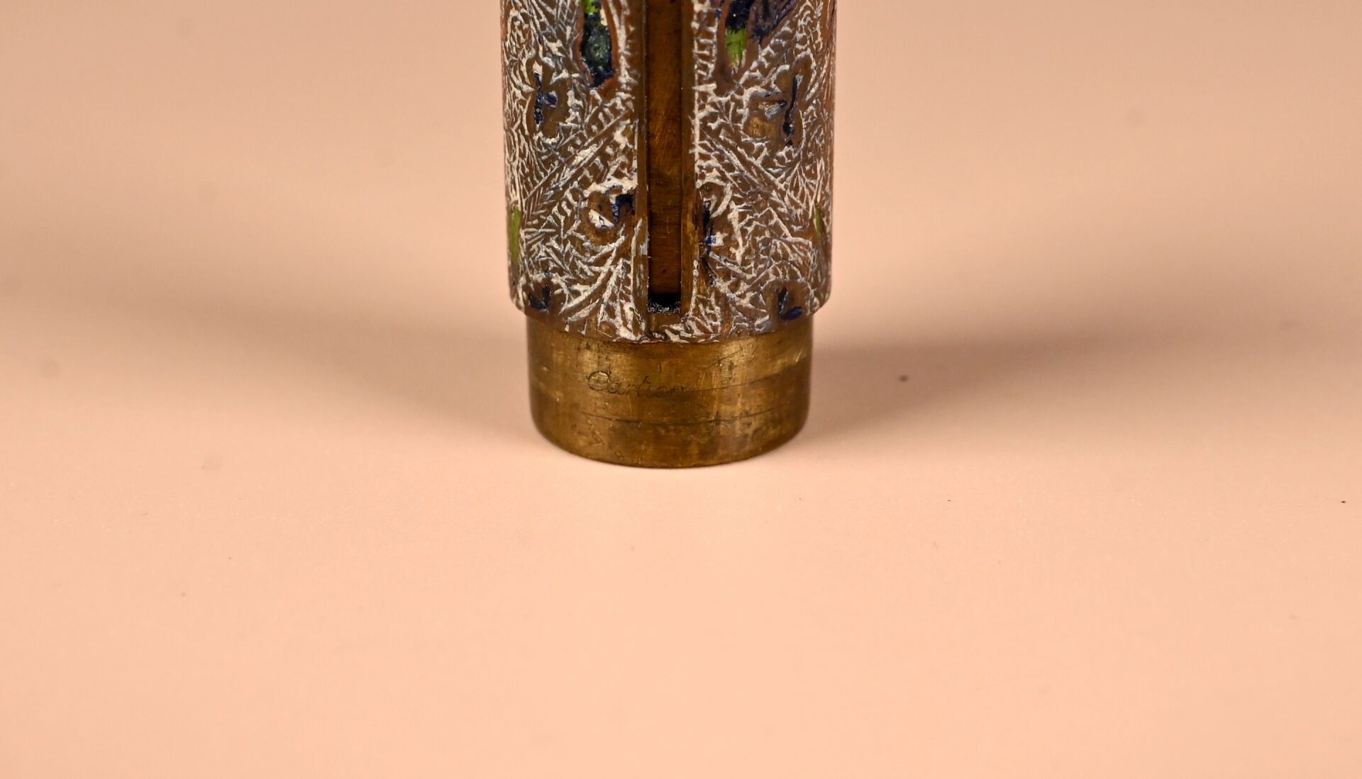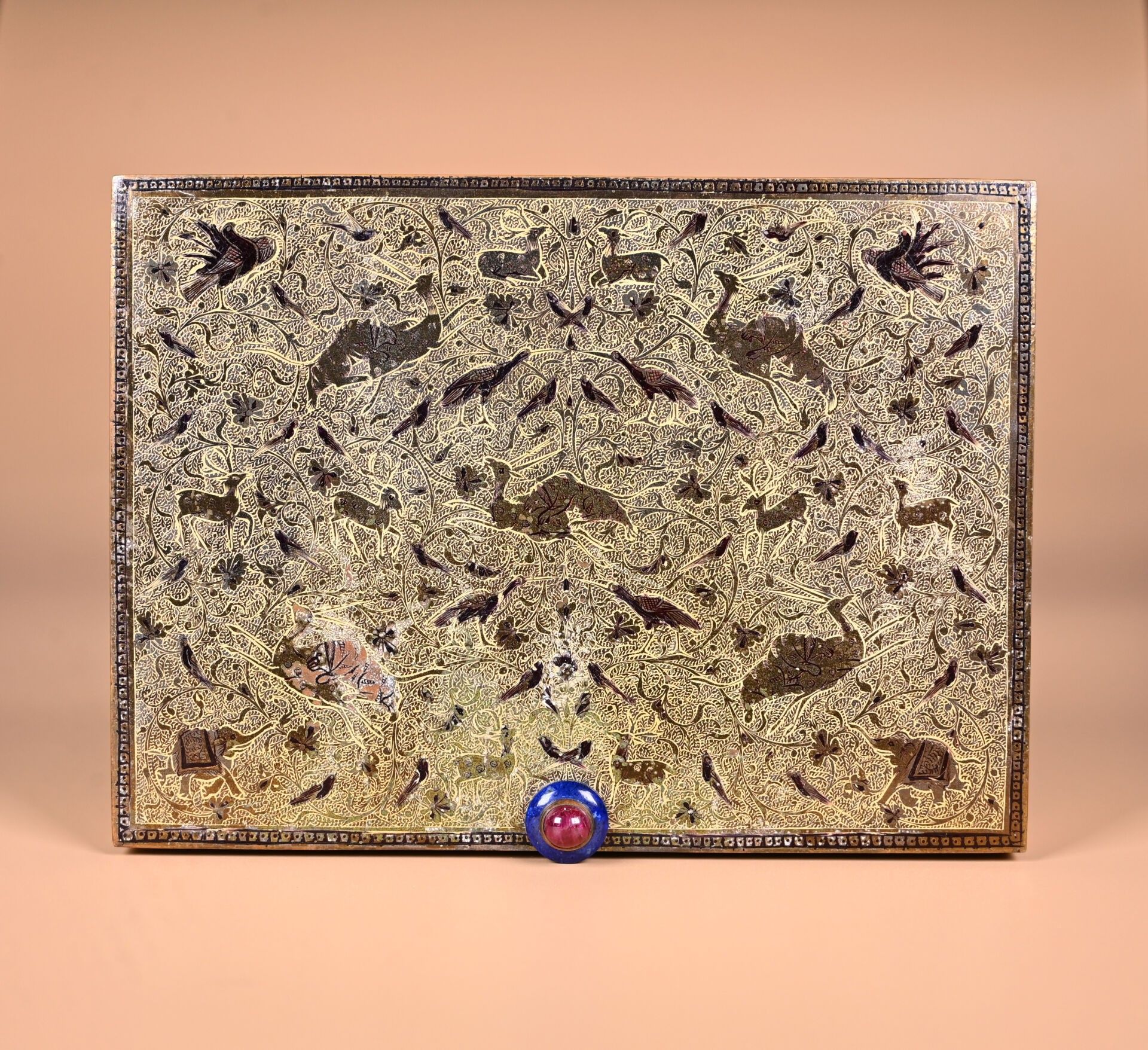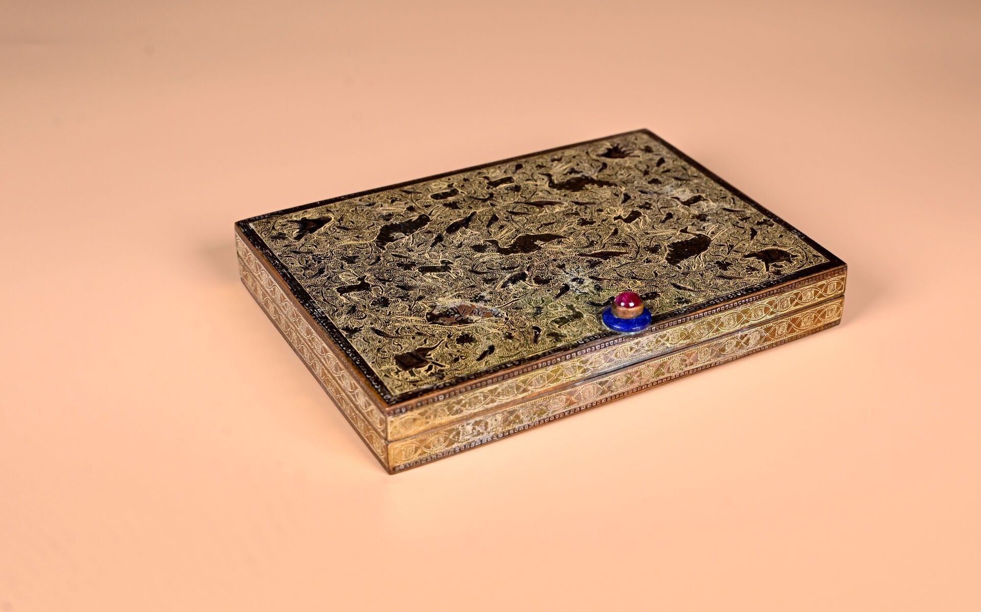 CARTIER. India Rajasthan. Copper minaudière with chased animal decoration. Cabochons of aventurine quartz, lapis and ruby coloured stones. With case for red and lighter. Original case. Circa 120. The card will be completed in the coming days.