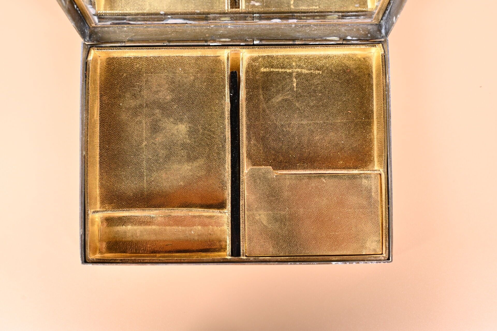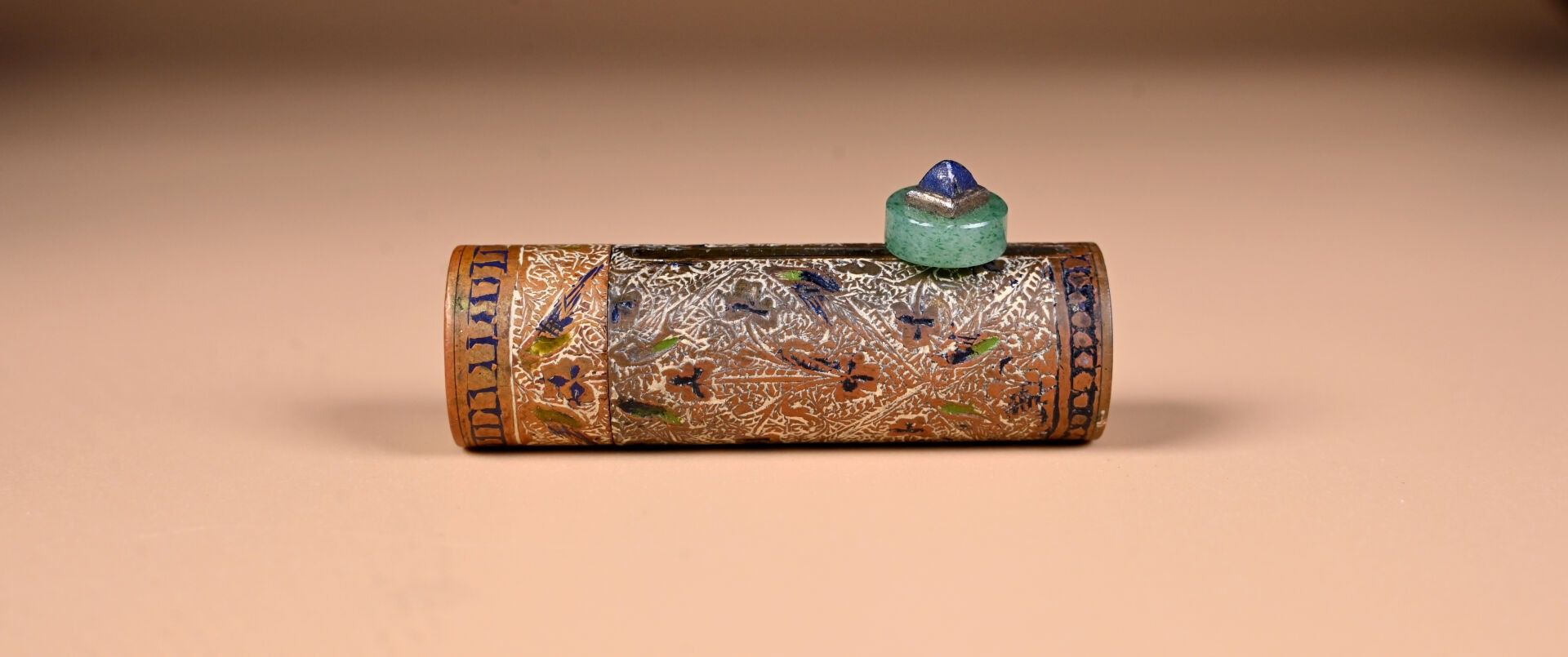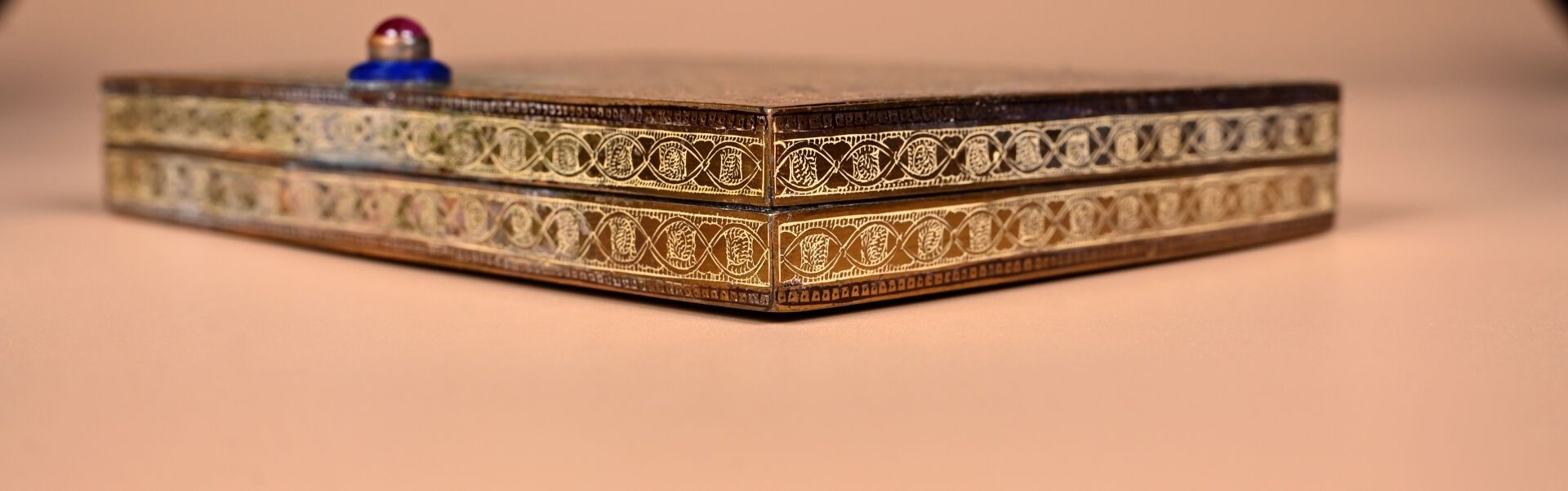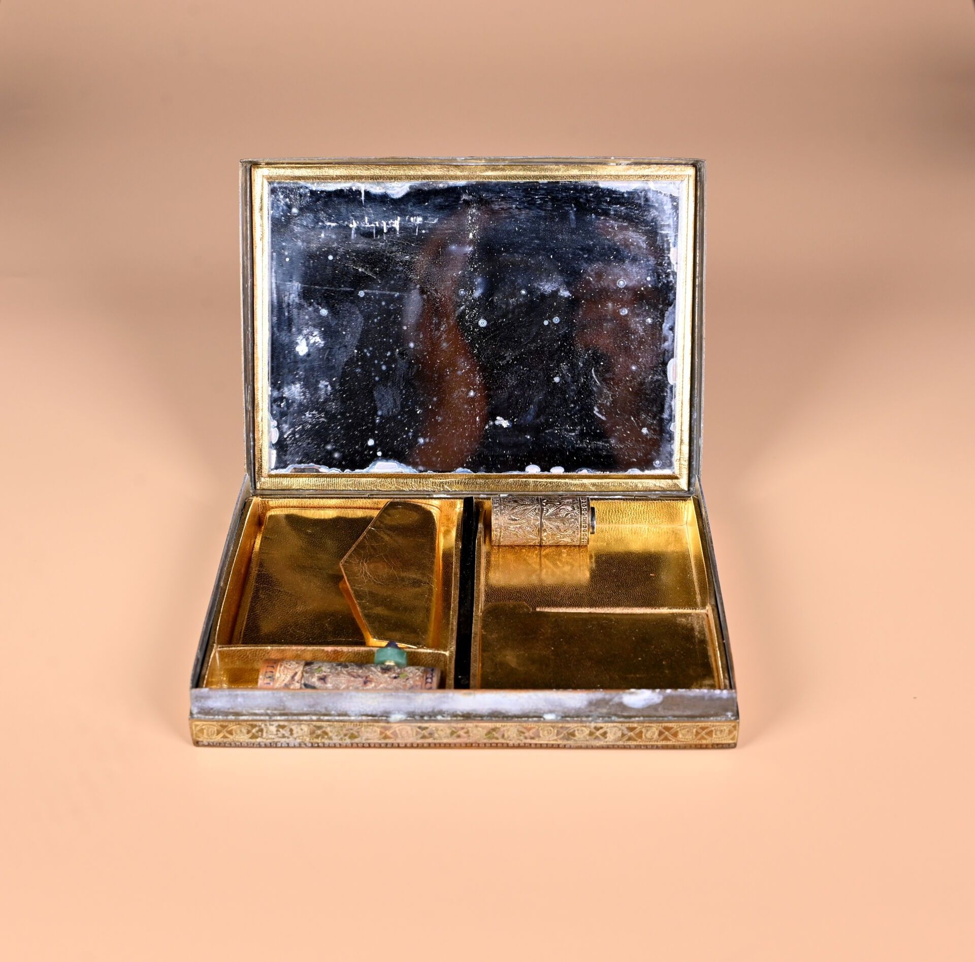 CARTIER. India Rajasthan. Copper minaudière with chased animal decoration. Cabochons of aventurine quartz, lapis and ruby coloured stones. With case for red and lighter. Original case. Circa 120. The card will be completed in the coming days.