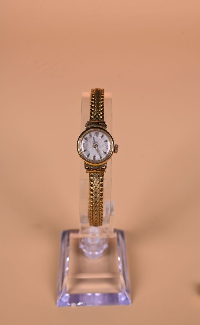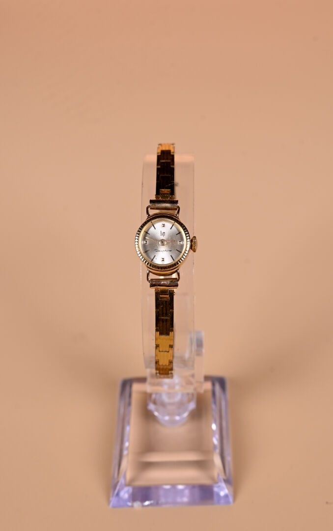 Two ladies' wristwatches with 18K 750/1000th yellow gold cases and metal bracelets, one of which is a LIP Dauphine model (worn and scratched). Mechanical movements (not working). An 18K yellow gold push-piece is included. Total gross weight : 33,84 g.