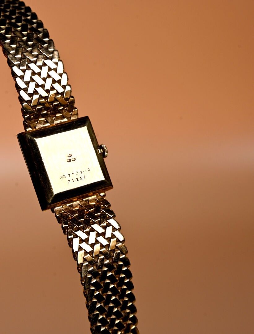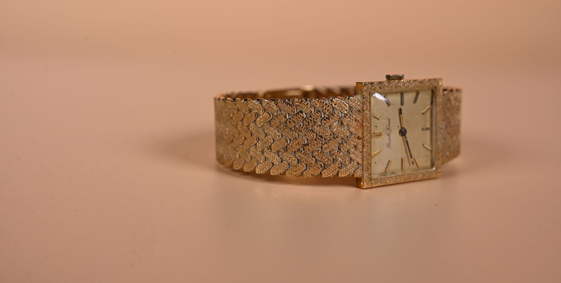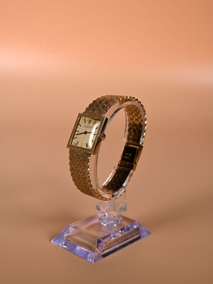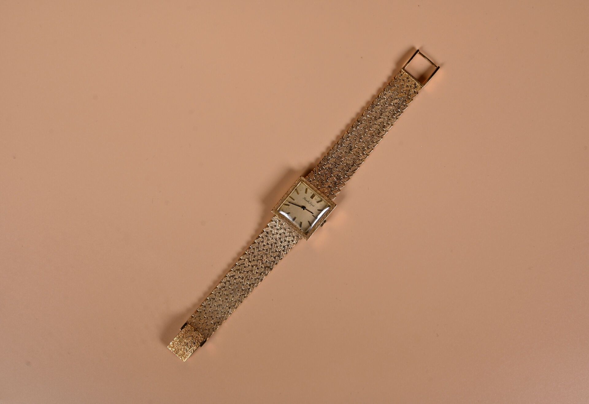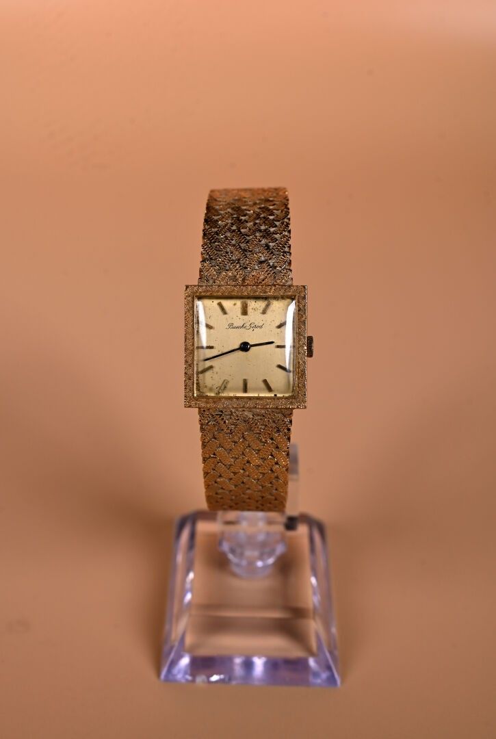 BUECHE-GIROD. Men's watch in 750 thousandths (18k) yellow gold. Cream dial with gold baton hour markers and partly black enamelled hands. Signed hand-wound mechanical movement. Textured plaited mesh bracelet. Length: 18 cm. Width: 1.5 cm. Case: 22 mm. Gross weight: 64 g. Functional (missing enamel on the hands, dial stained at the edge).