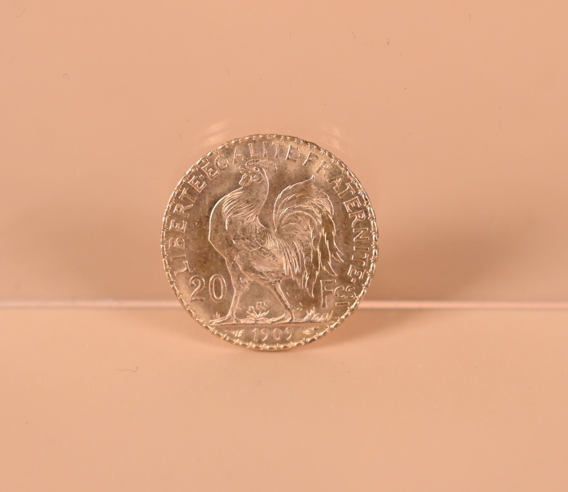 1 Coin of 20 Francs gold 1909 with rooster. Weight: 6.44 g.