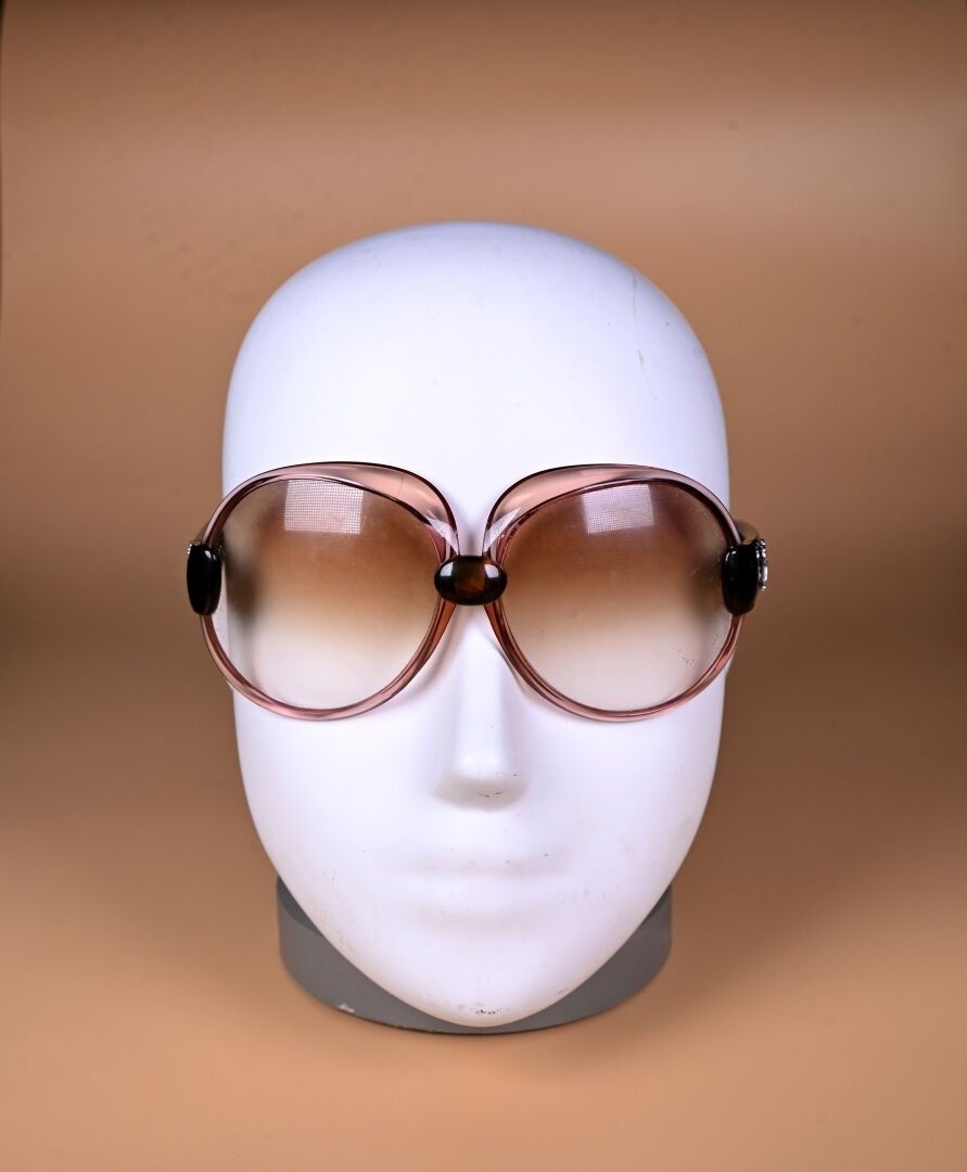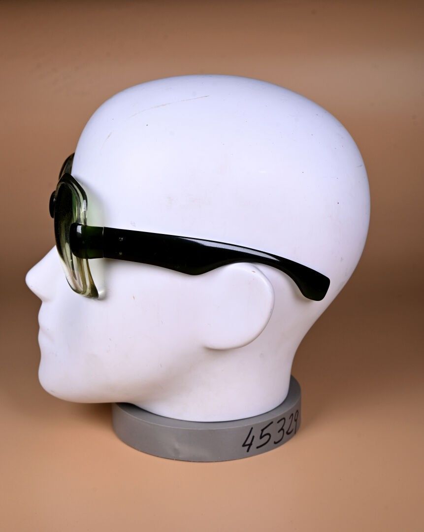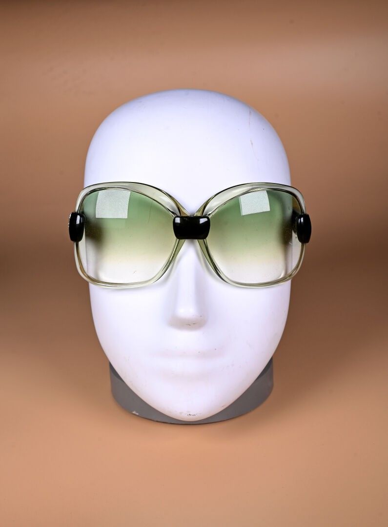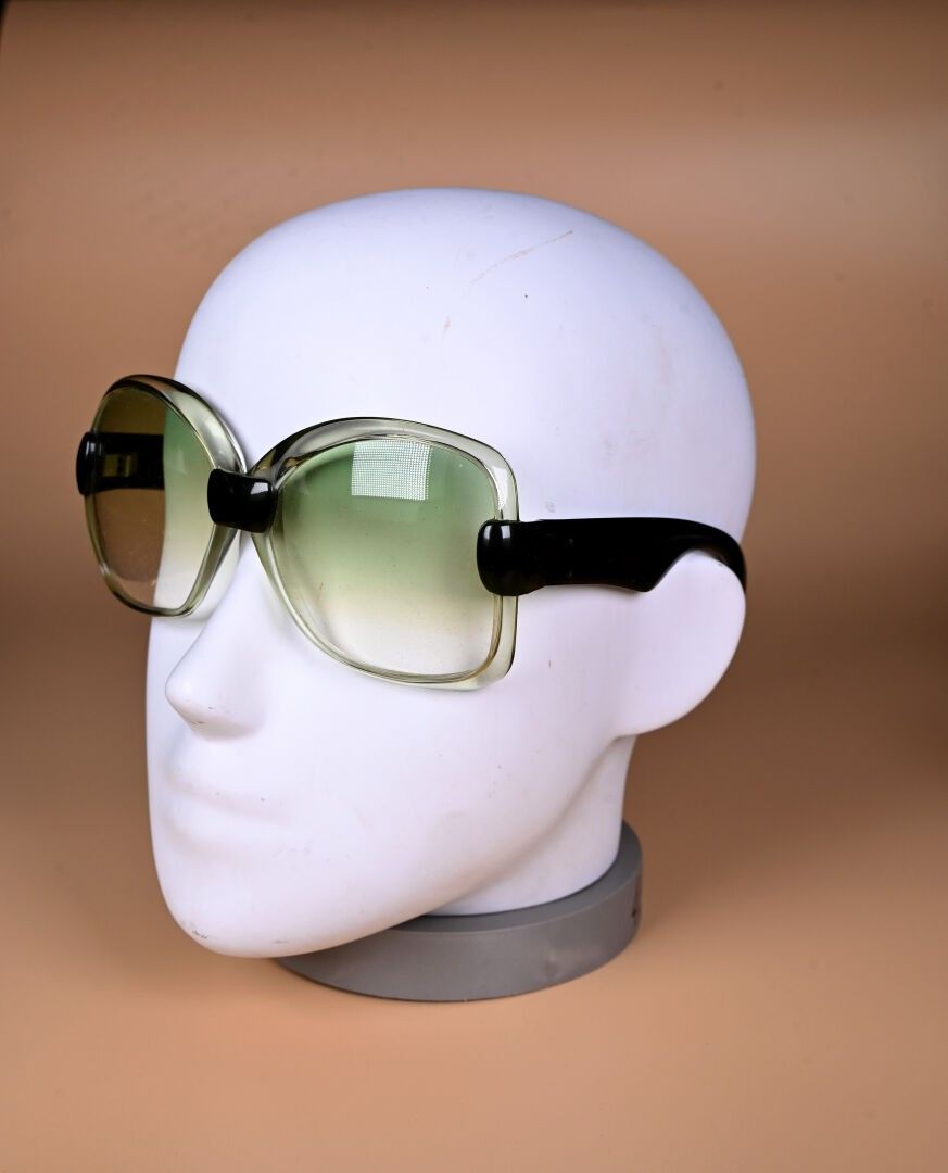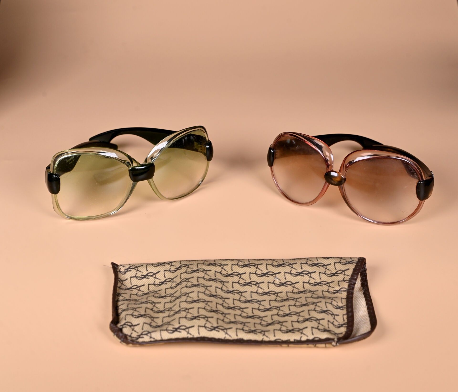 YVES SAINT LAURENT. Two pairs of green and burgundy plastic sunglasses (missing logo on one stem, scratches). Circa 1970. One canvas case.