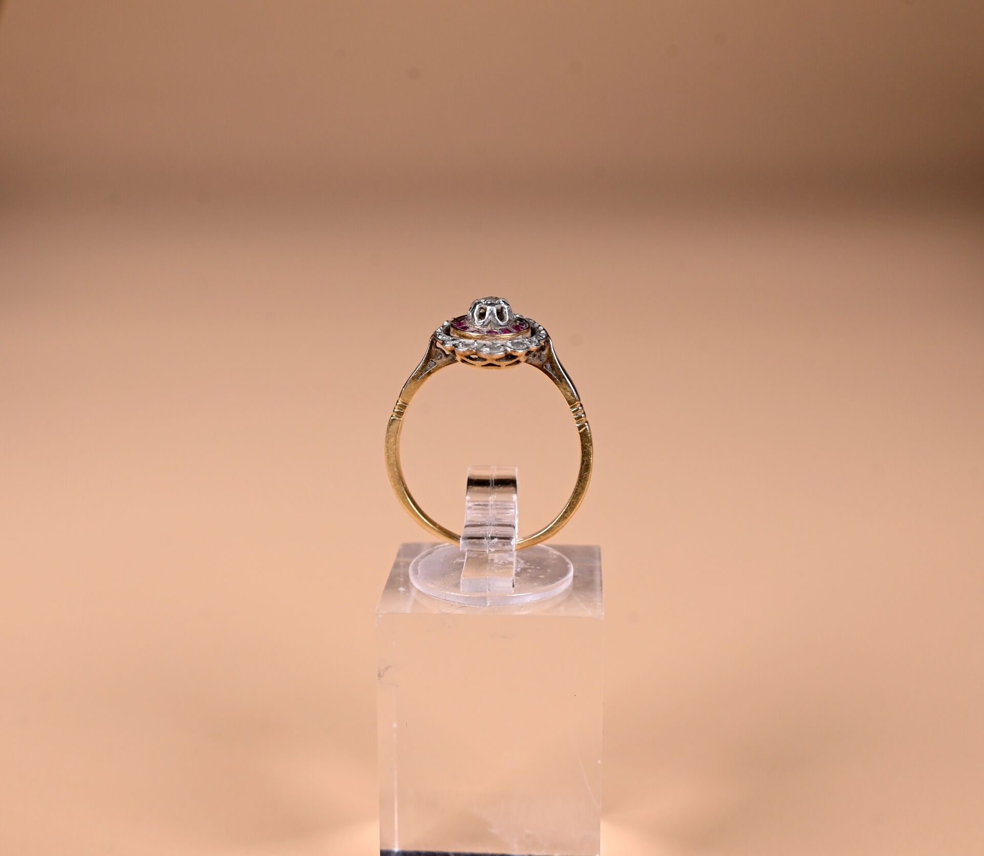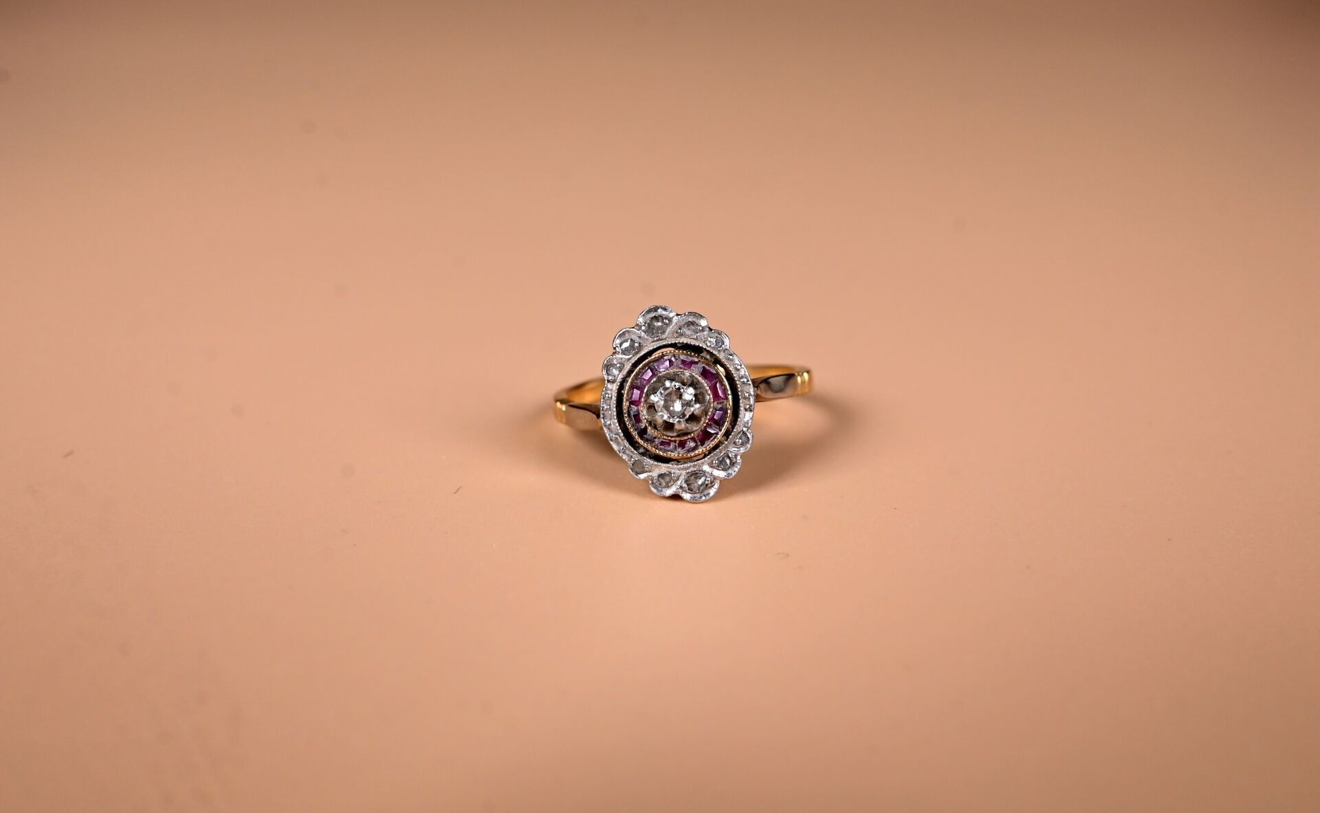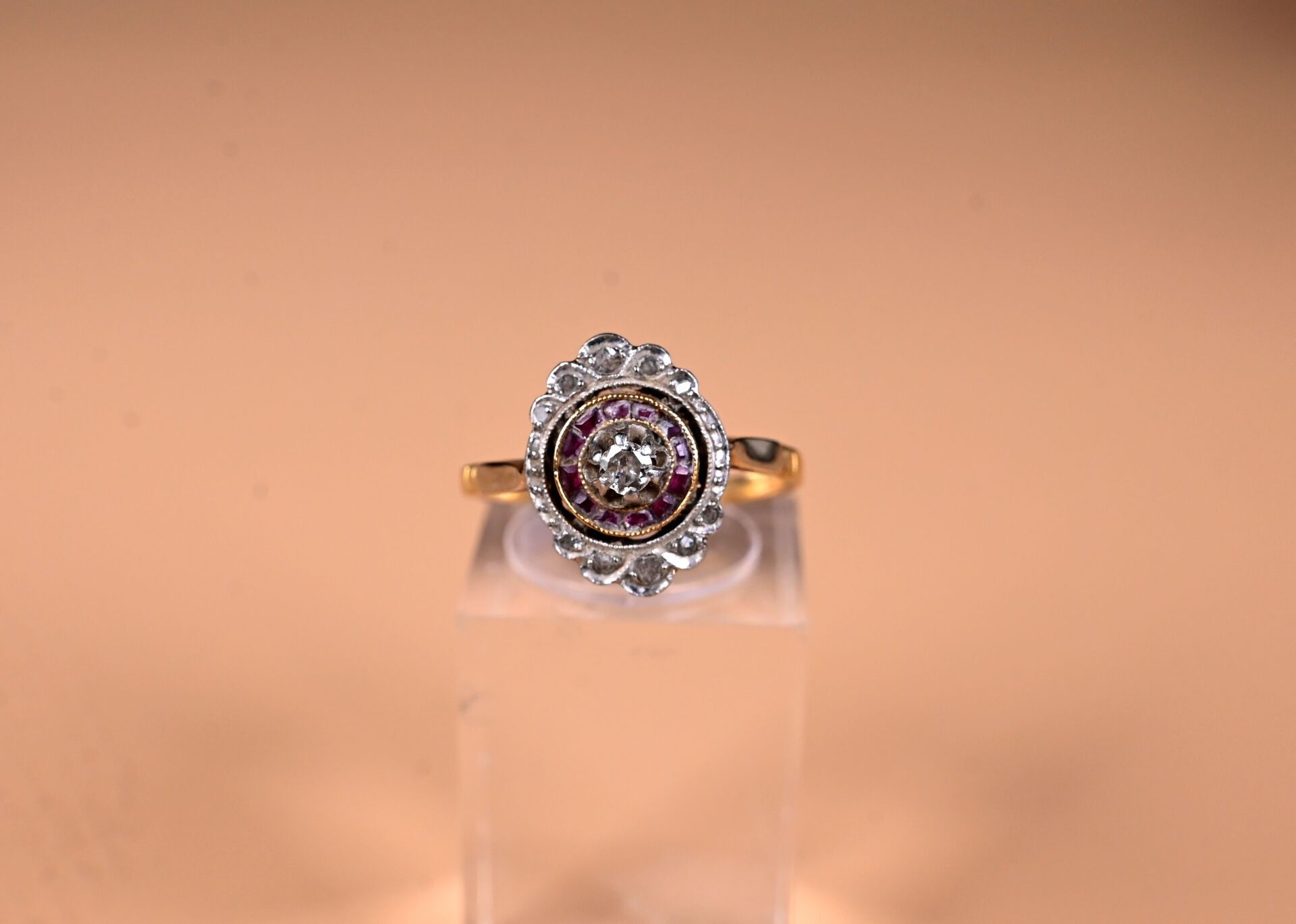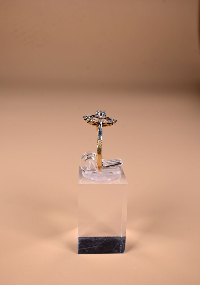 Ring in 18K yellow gold 750/1000th with a worked platinum 850/1000th top set with calibrated synthetic rubies and diamonds (twisted top). TDD 54. Gross weight : 2,6 g.