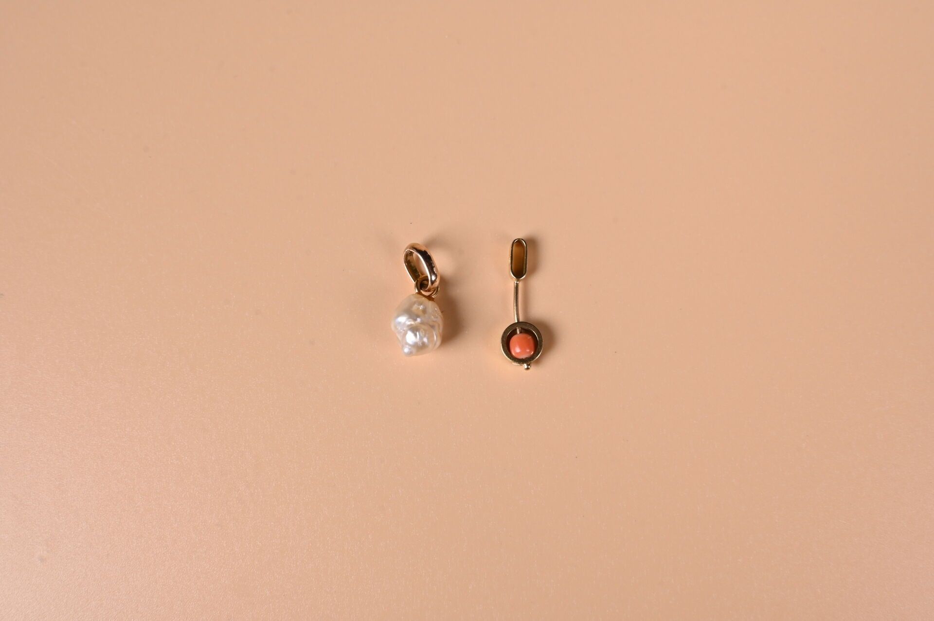 Two pendants in 18K yellow gold 750/1000, coral beads and pearl sulphides. Gross weight : 1,5 g.