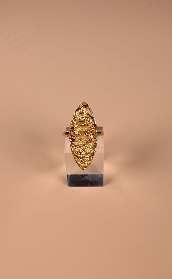 Marquise ring in 18K yellow gold 750/1000e with a dragon. Foreign work (reassembly) Indochina. TDD 58. Gross weight : 5,4 g. The lot will be hallmarked before the sale.