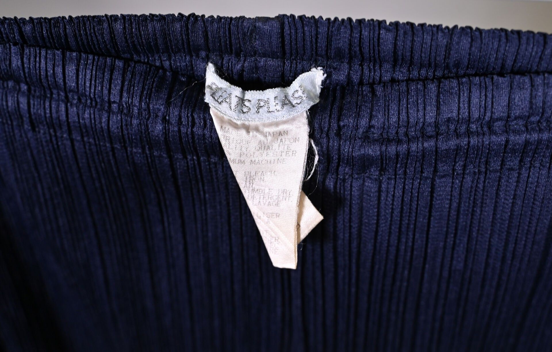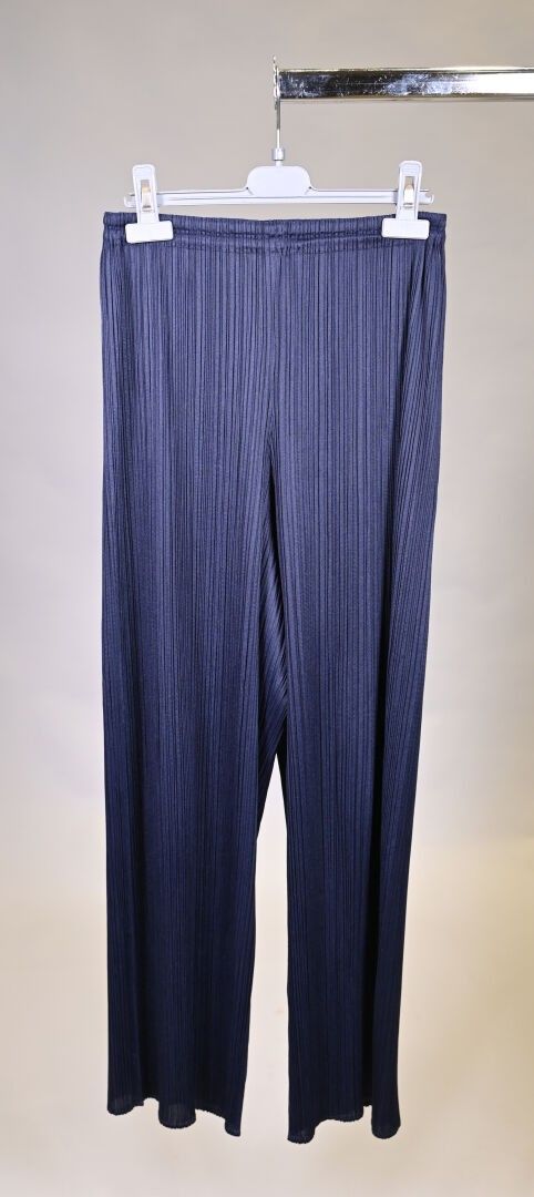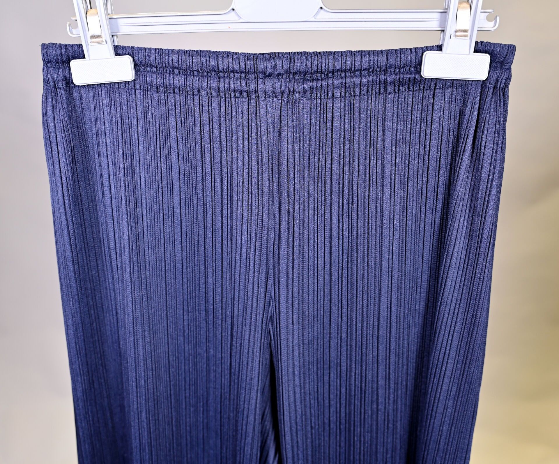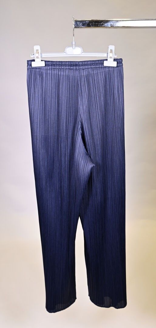 PLEATS PLEASE. Navy blue pleated polyester trousers. Size: 34. 100 cm long.