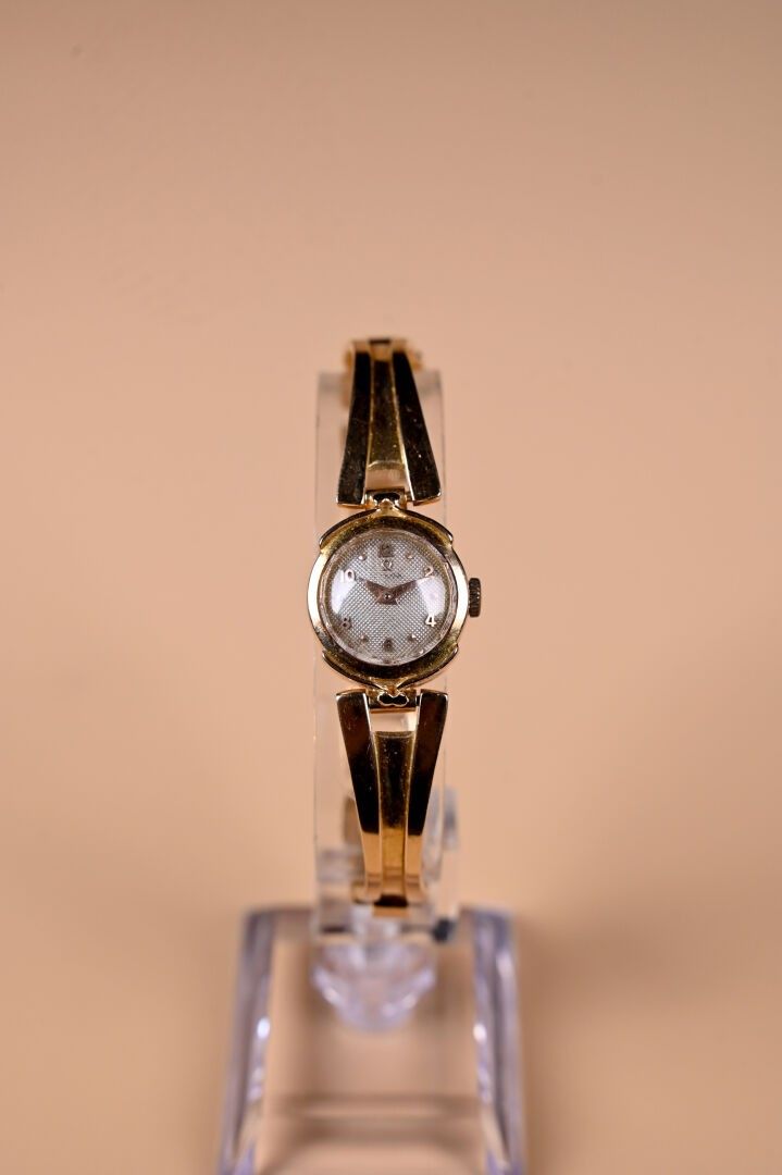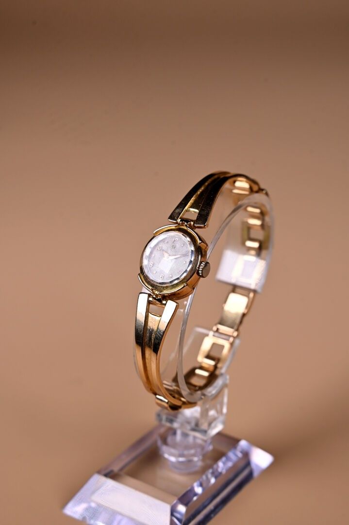 OMEGA. Ladies' wristwatch in 18k 750/1000 gold. Hand-wound mechanical movement. Articulated bracelet. Diameter: 16 mm. Gross weight : 34 g. Starts. Metal winding mechanism.