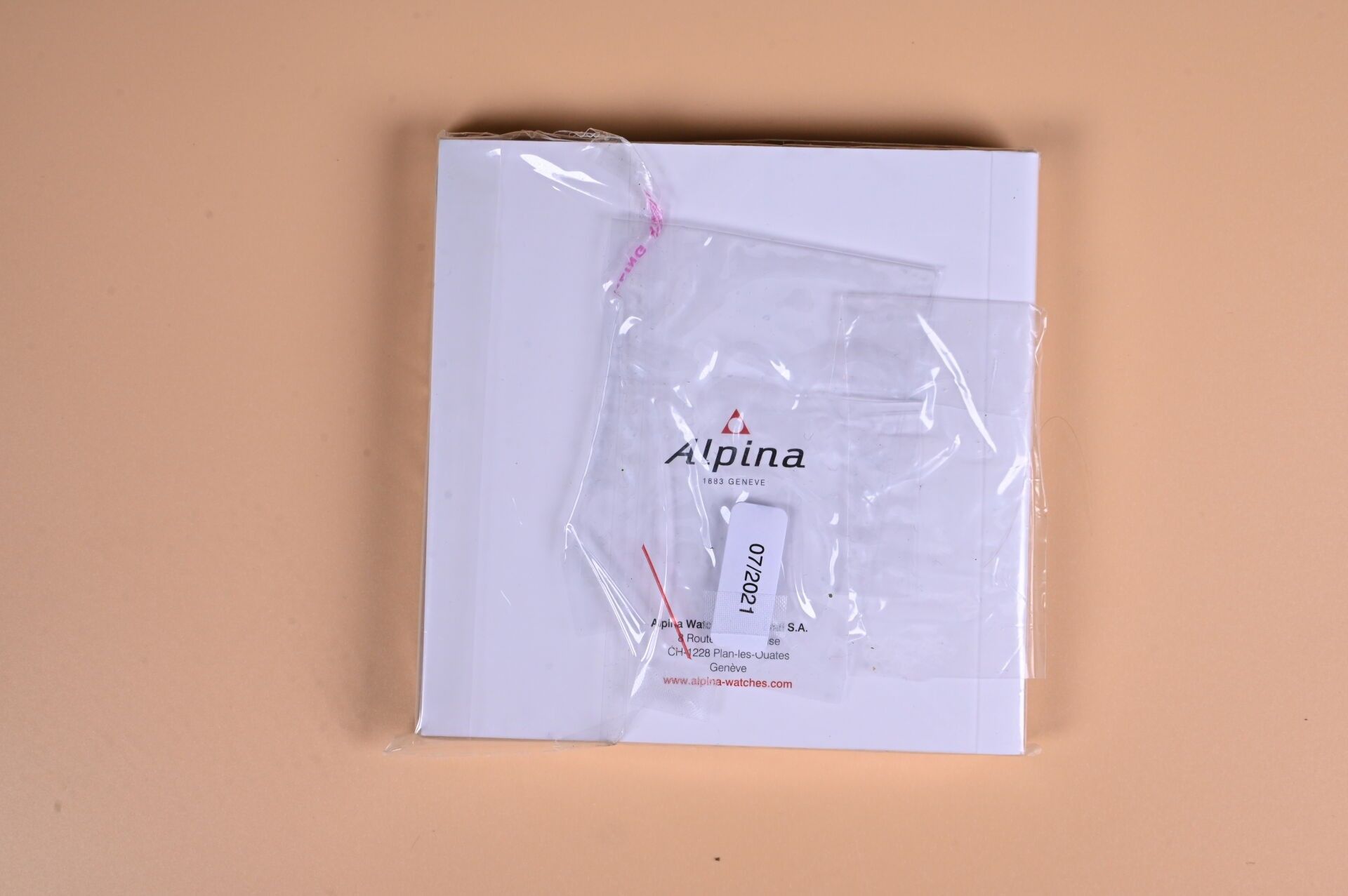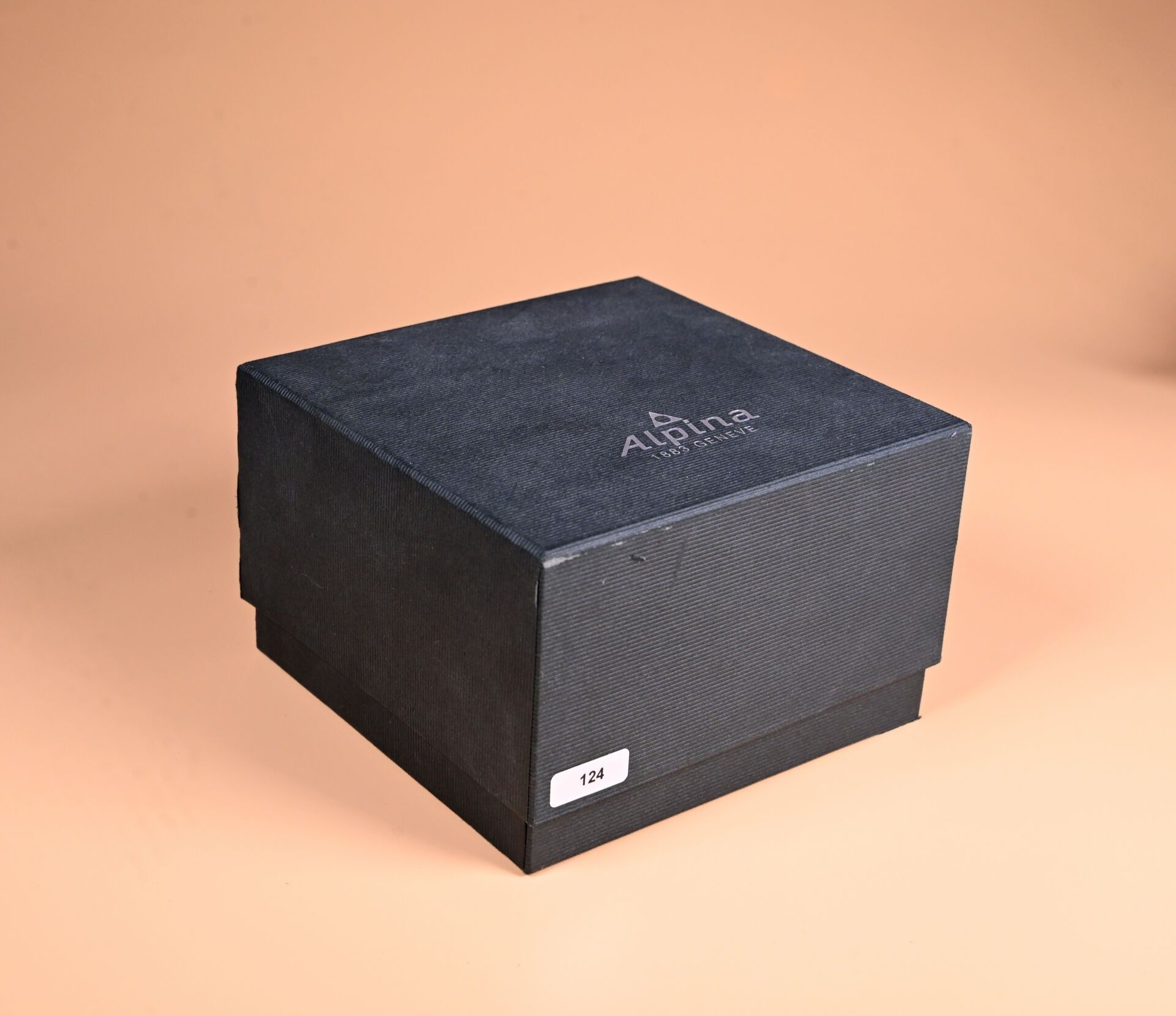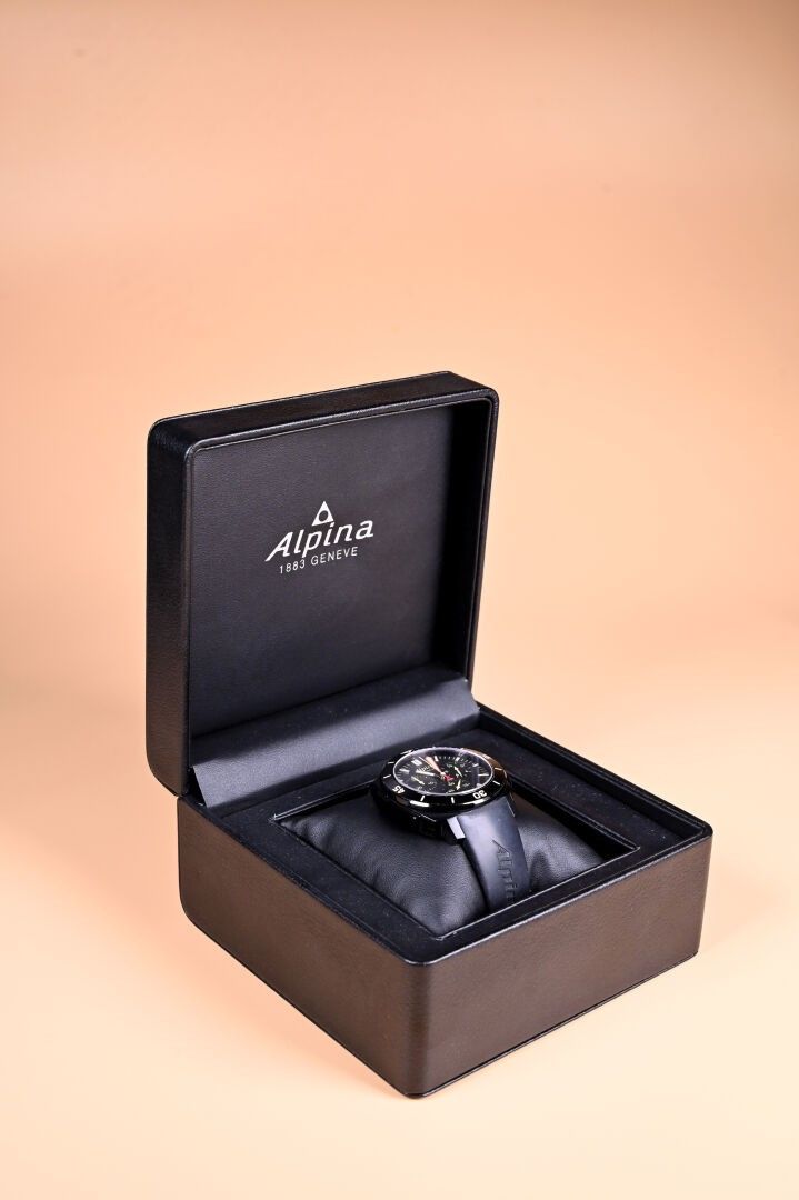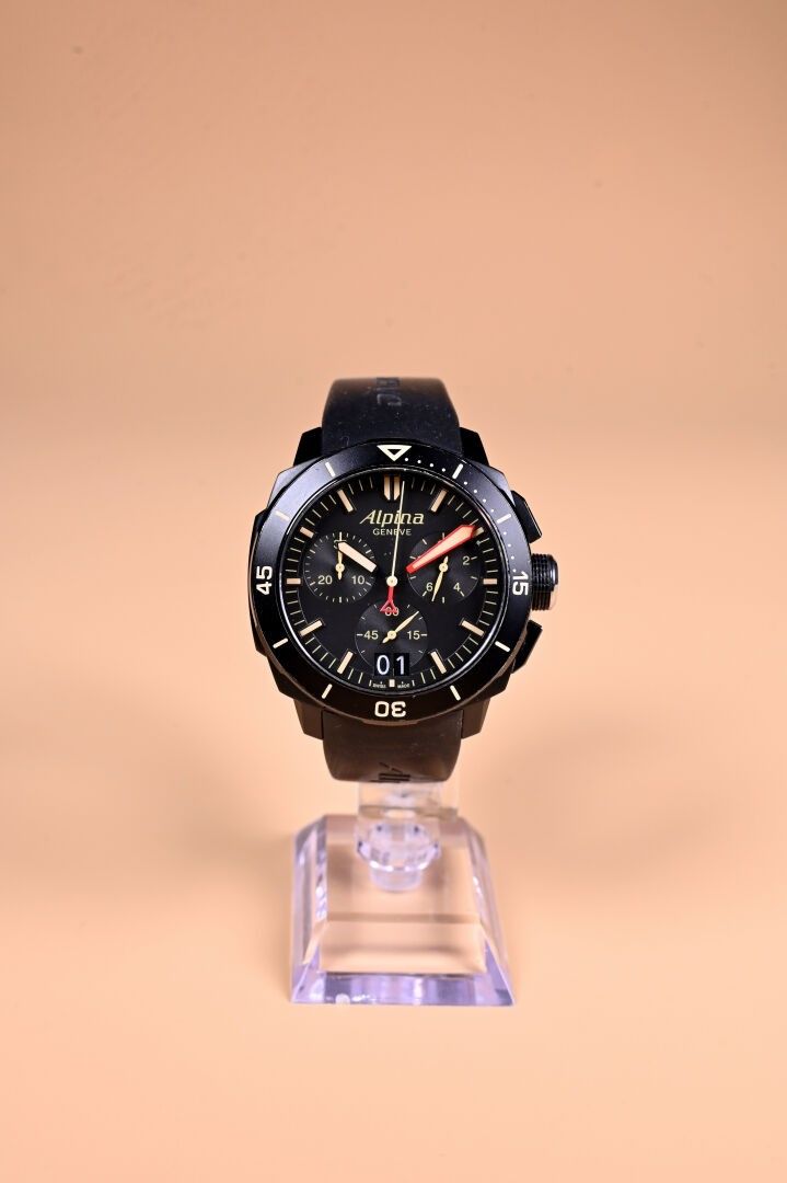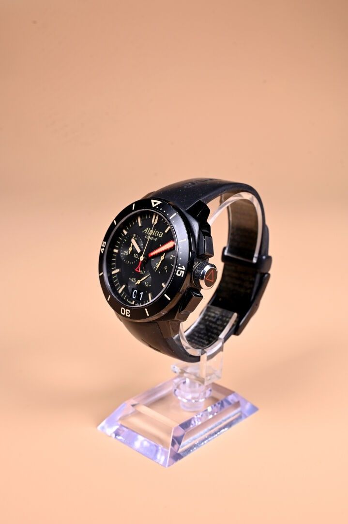ALPINA. Men's wristwatch with blackened steel case, signed dial with 3 black backs and large date at 6 o'clock. Quartz movement. Original rubber strap on pin buckle. To be revised. Rubbed. Diameter: 42 mm. With box and paper.