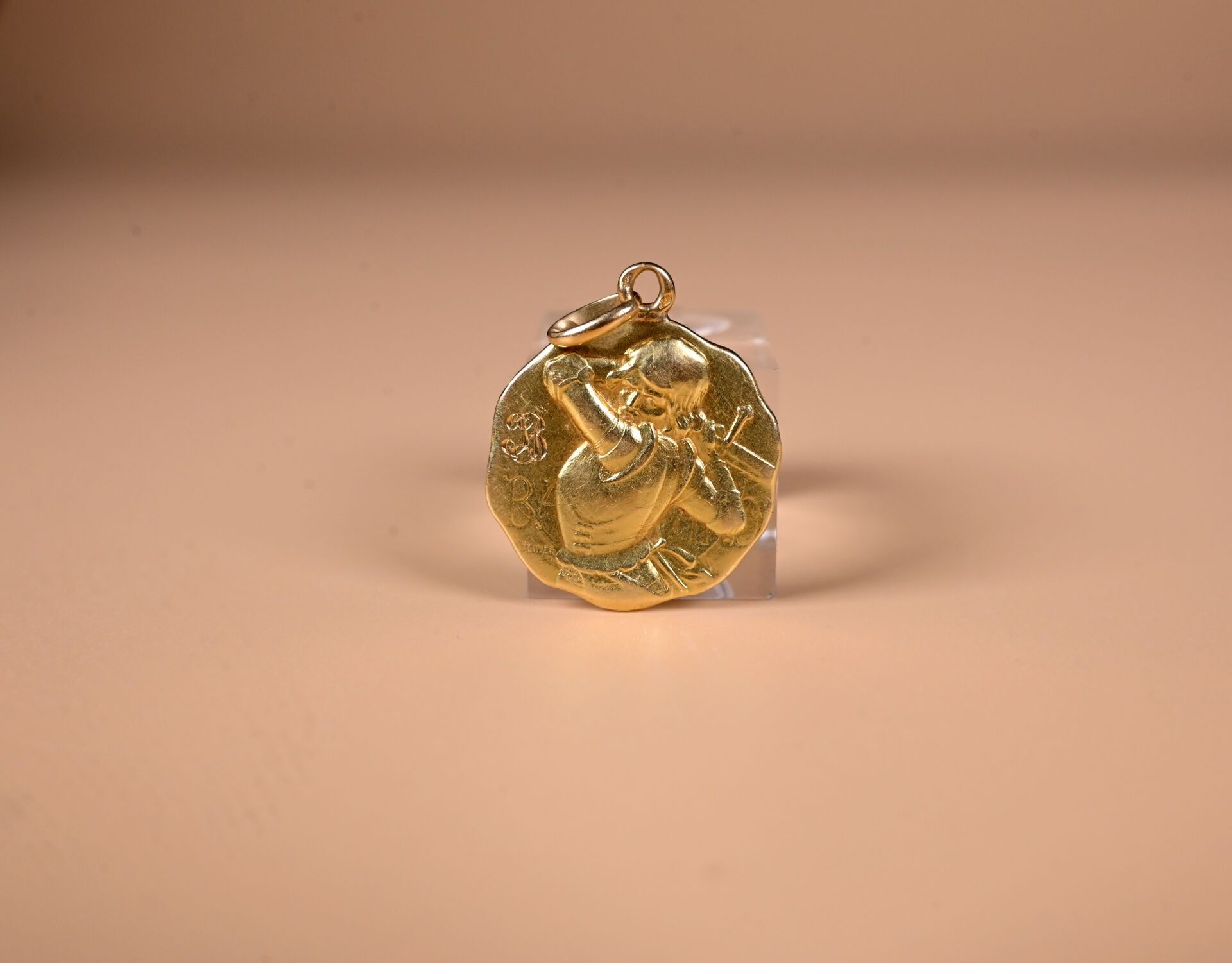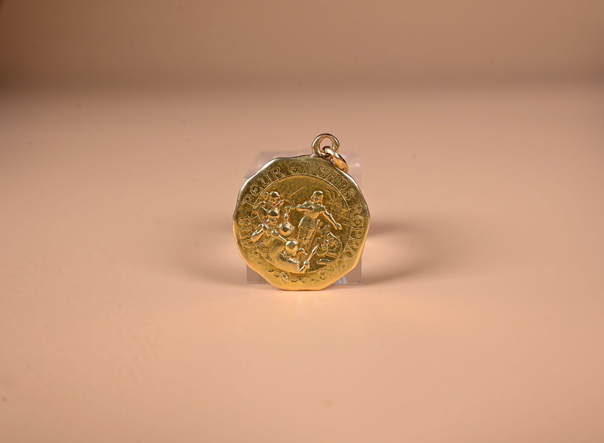 Medal pendant in 18K yellow gold 750/1000e, double-sided, decorated with the Chevalier BAYARD. Work of the engraver STEINER, engraved. Height Height : 3 cm. Weight: 8.8 g.
