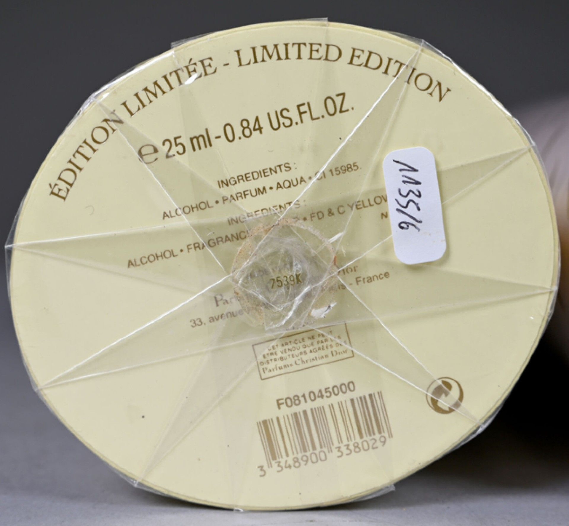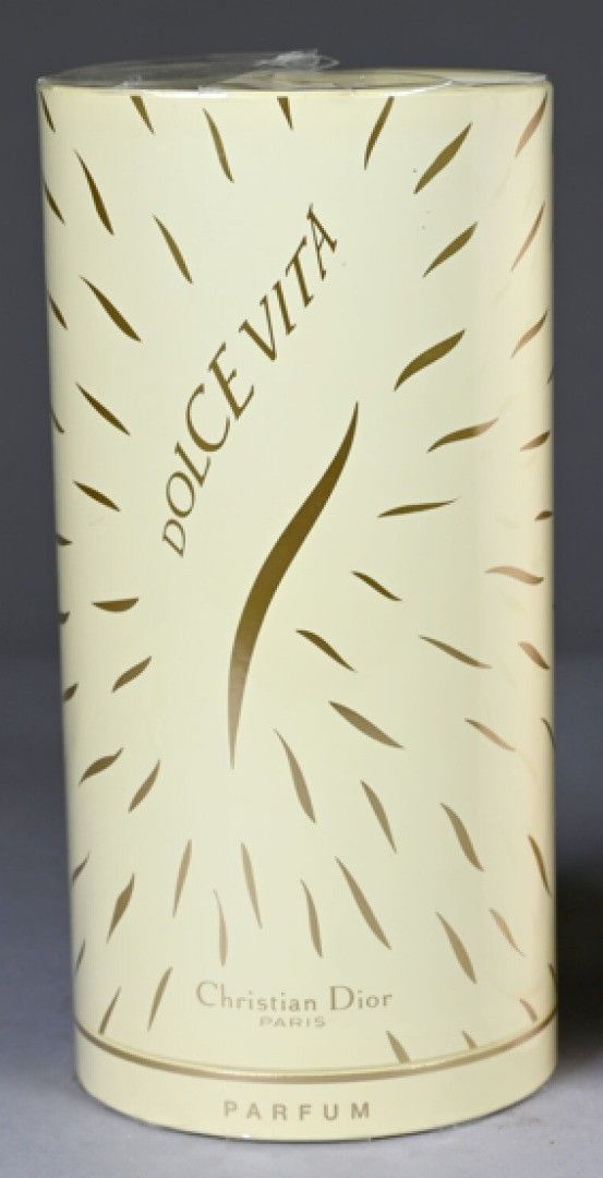 Hervé Van der Straeten for "Dolce Vita" by Christian Dior - (1995). Limited edition dating from the 2000s: Presented in its oval cardboard box covered in paper illustrated with gold feathers, titled, slightly asymmetrical moulded colourless glass amphora bottle topped with its tinted glass "flame" stopper, containing 25ml of extract. Sealed and cellophane-coated.