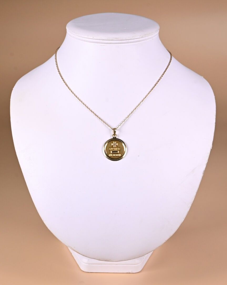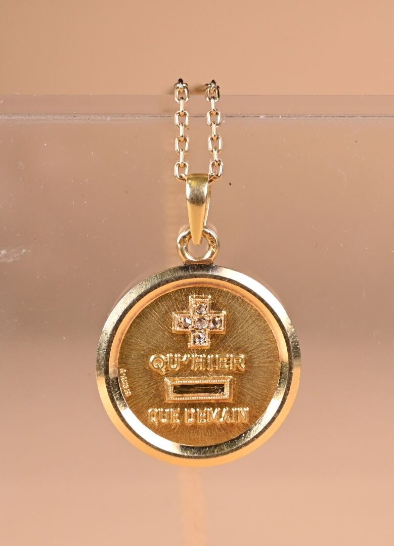 Set in 18K yellow gold 750/1000, comprising a forçat chain and a medallion + qu'hier et - que demain with diamond chips. Chain length: 45.5 cm. Total gross weight: 10.32 g.