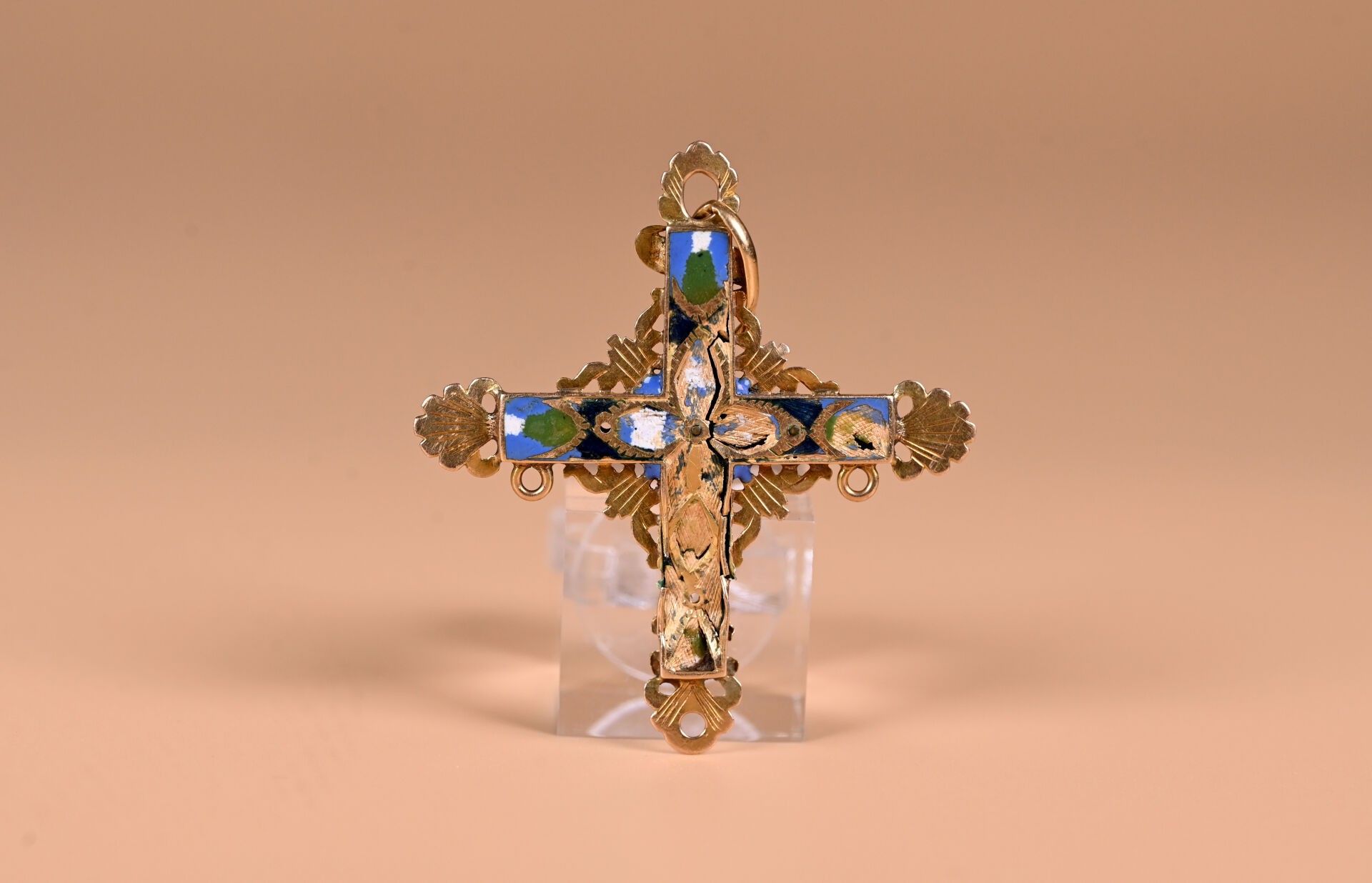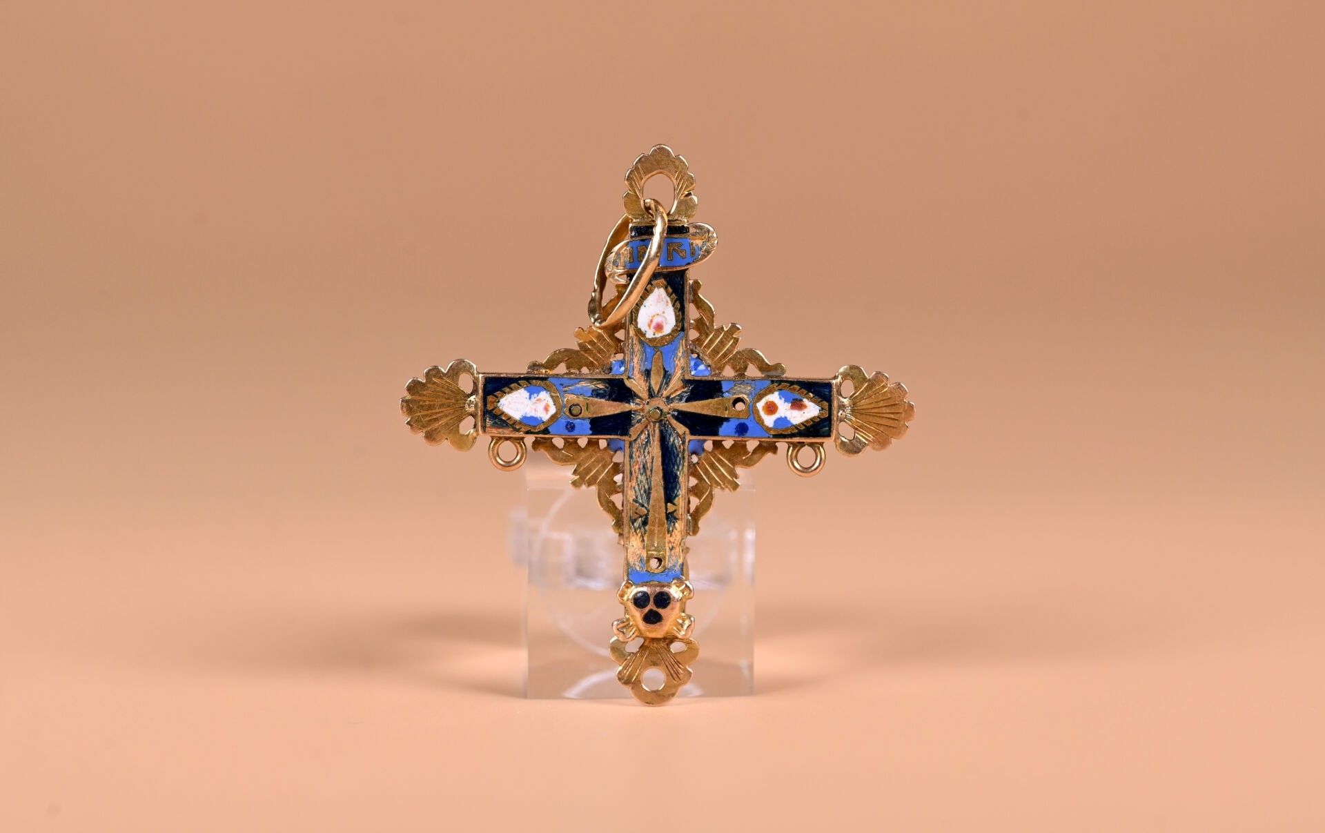 Puy-en-Velay regional cross pendant in 18k 750 gold with polychrome enamel work. Double rings with missing charms. Height: 5 cm (without clasp). Width: 4.5 cm. First half of the 19th century. Gross weight: 4.6 g (accidents and dents, missing enamel).