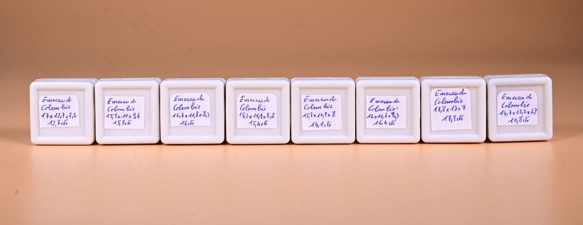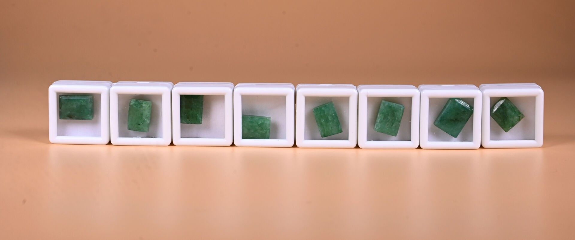 8 rectangular emeralds (Colombia, partly opaque).
