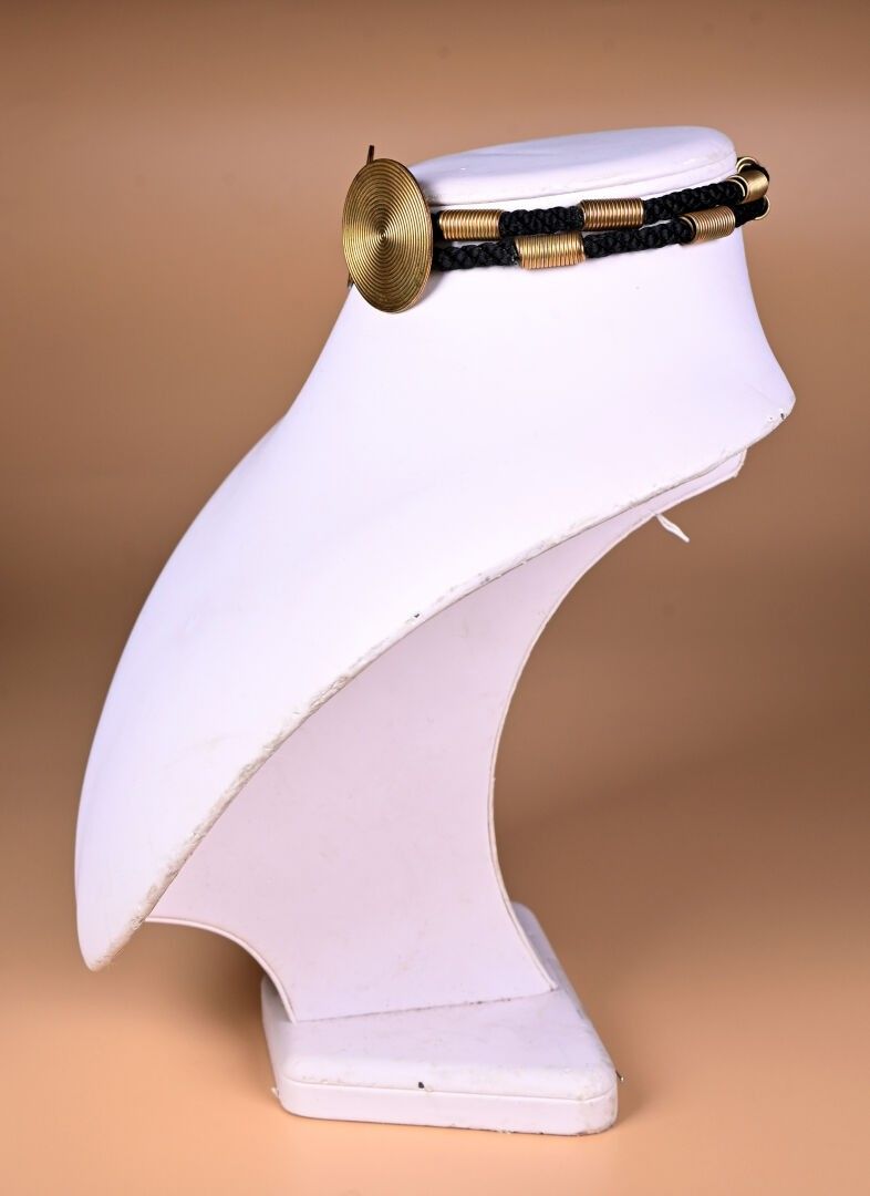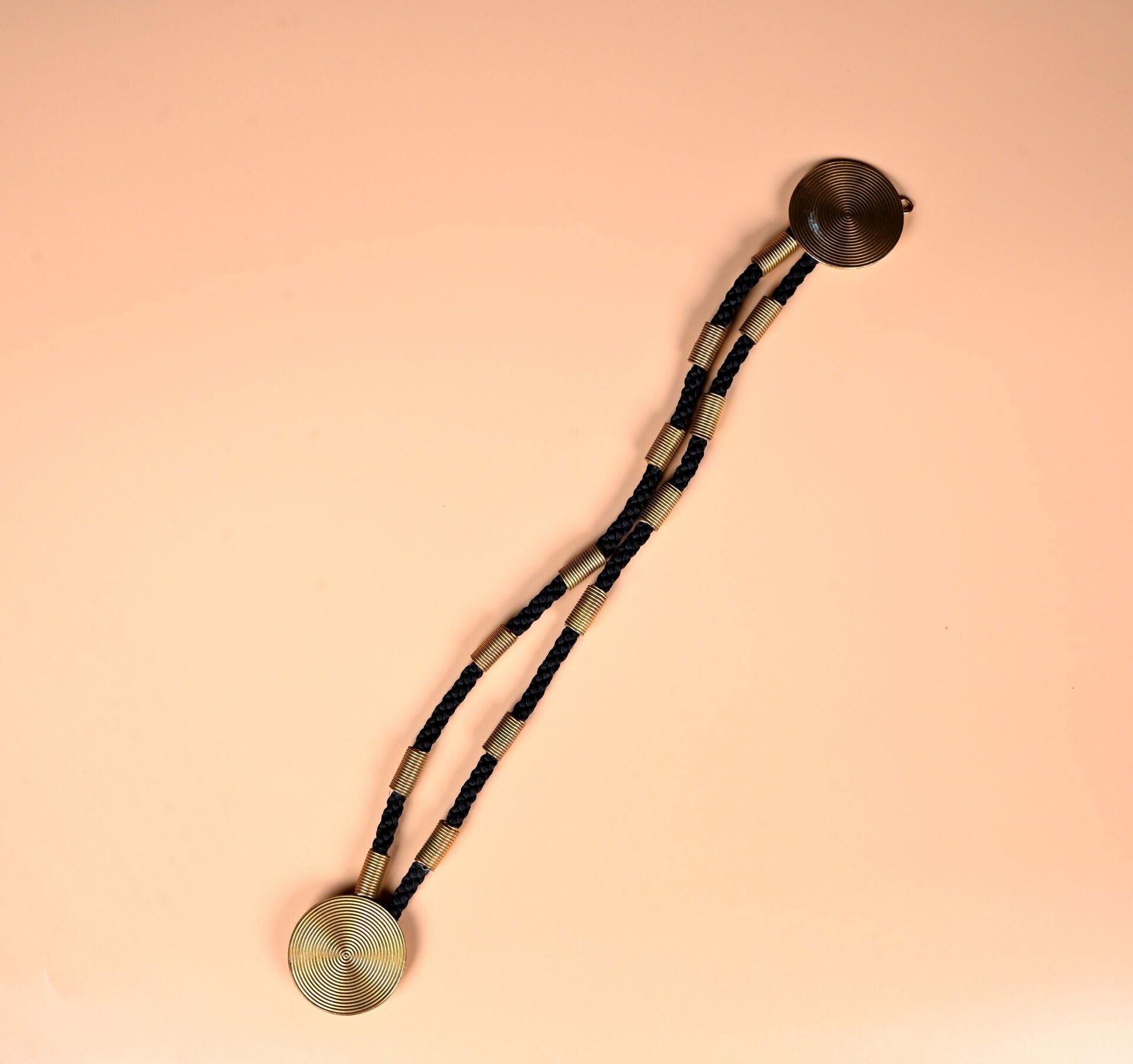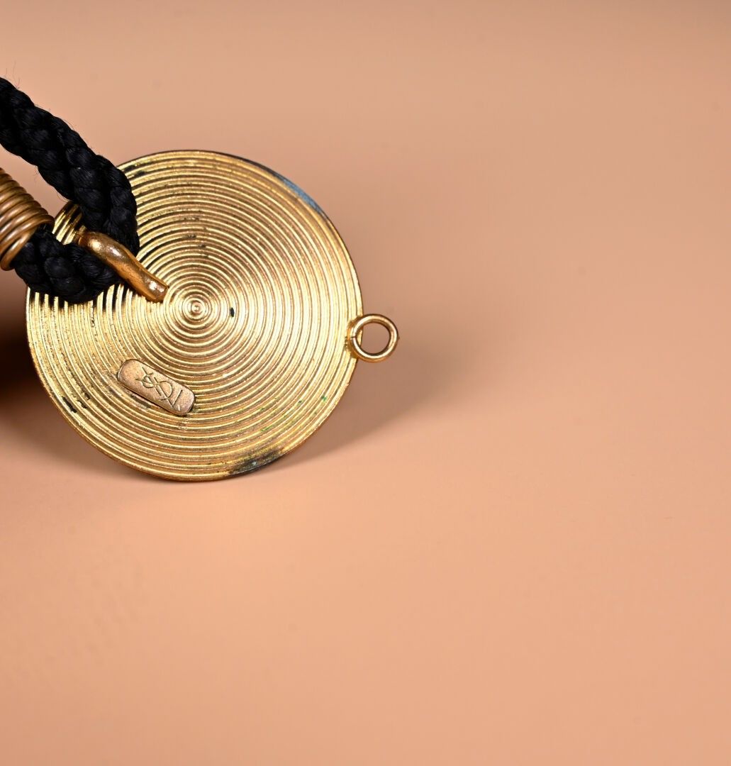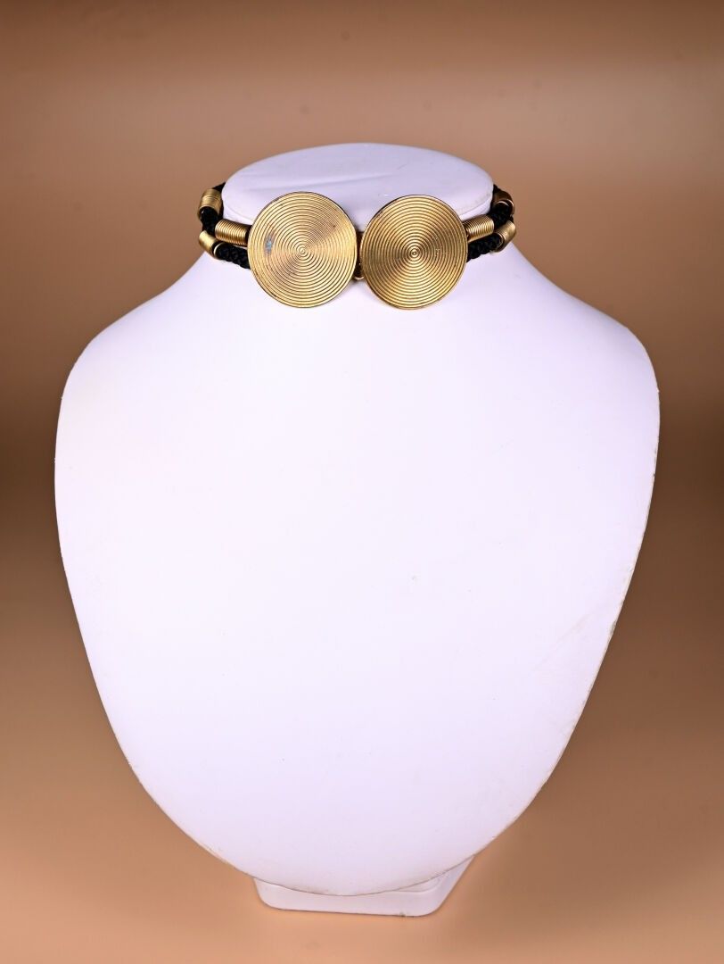 YVES SAINT LAURENT. Gold-plated metal and black braided cord choker necklace with two discs. Length: 34 cm. Minor oxidation.