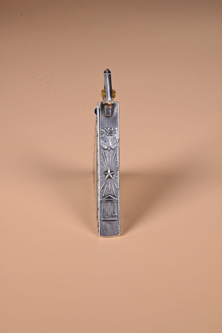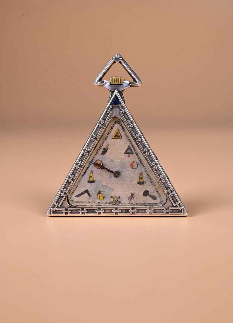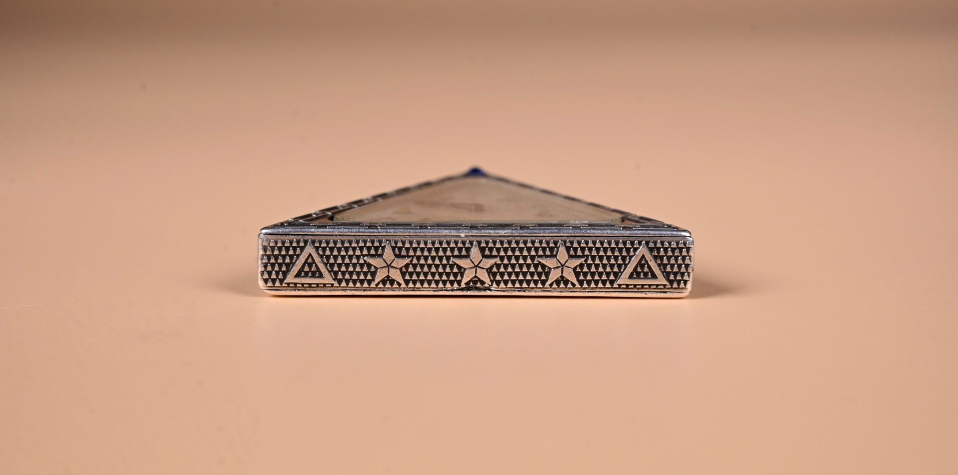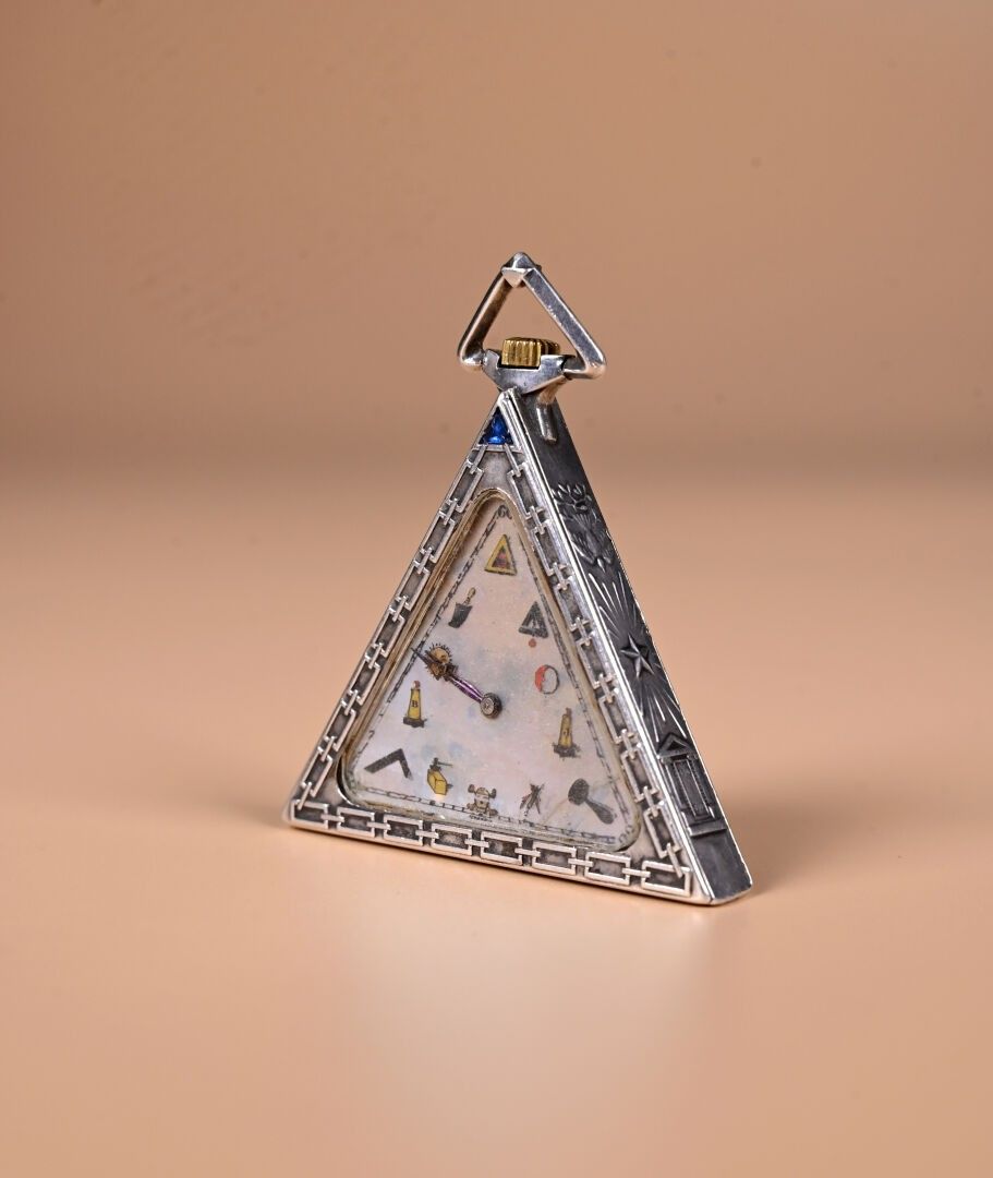 SCHWAB-LOEILLET. Triangular masonic pocket watch in silver 925/1000. Case worked in repoussé, monogrammed BJ on the back. Mother-of-pearl dial with hour markers featuring coloured freemasonry attributes. Hand-wound mechanical movement. 6 x 5 cm. Gross weight : 53 g. Starts but needs servicing. Slight crack on the dial.