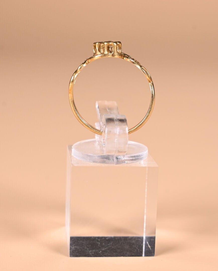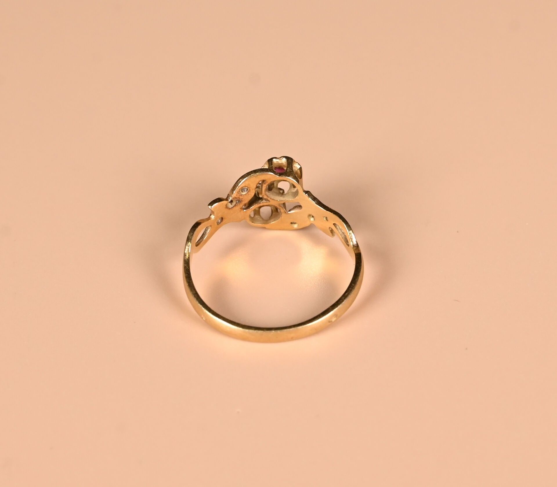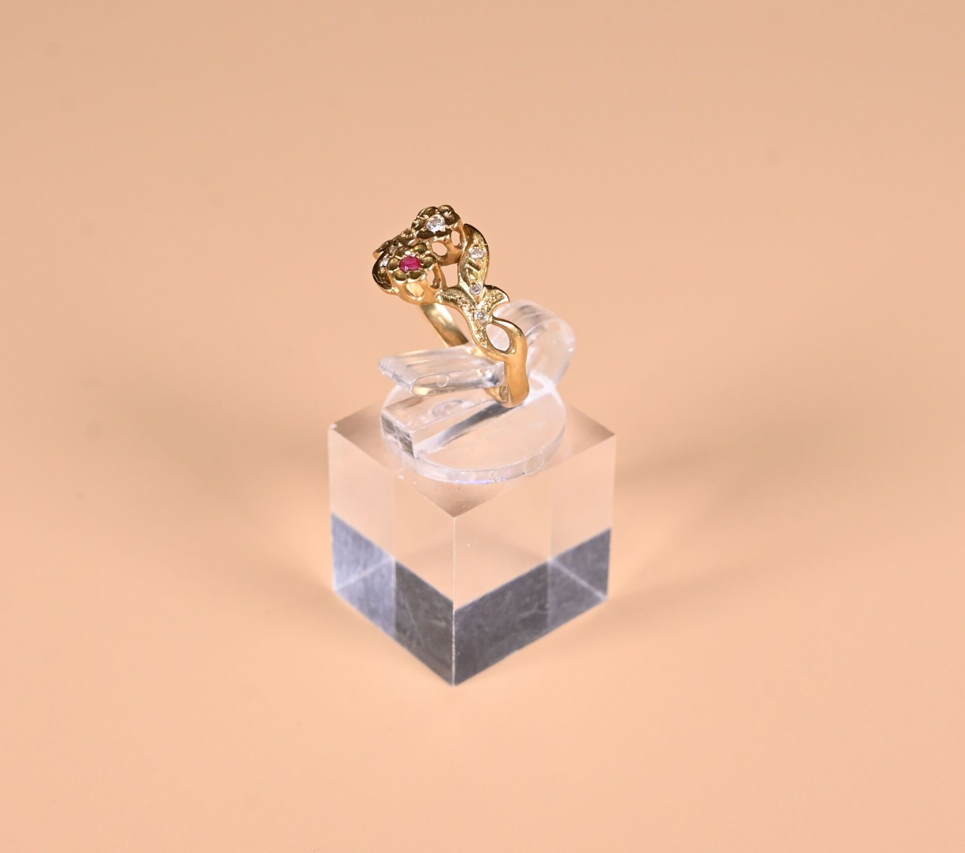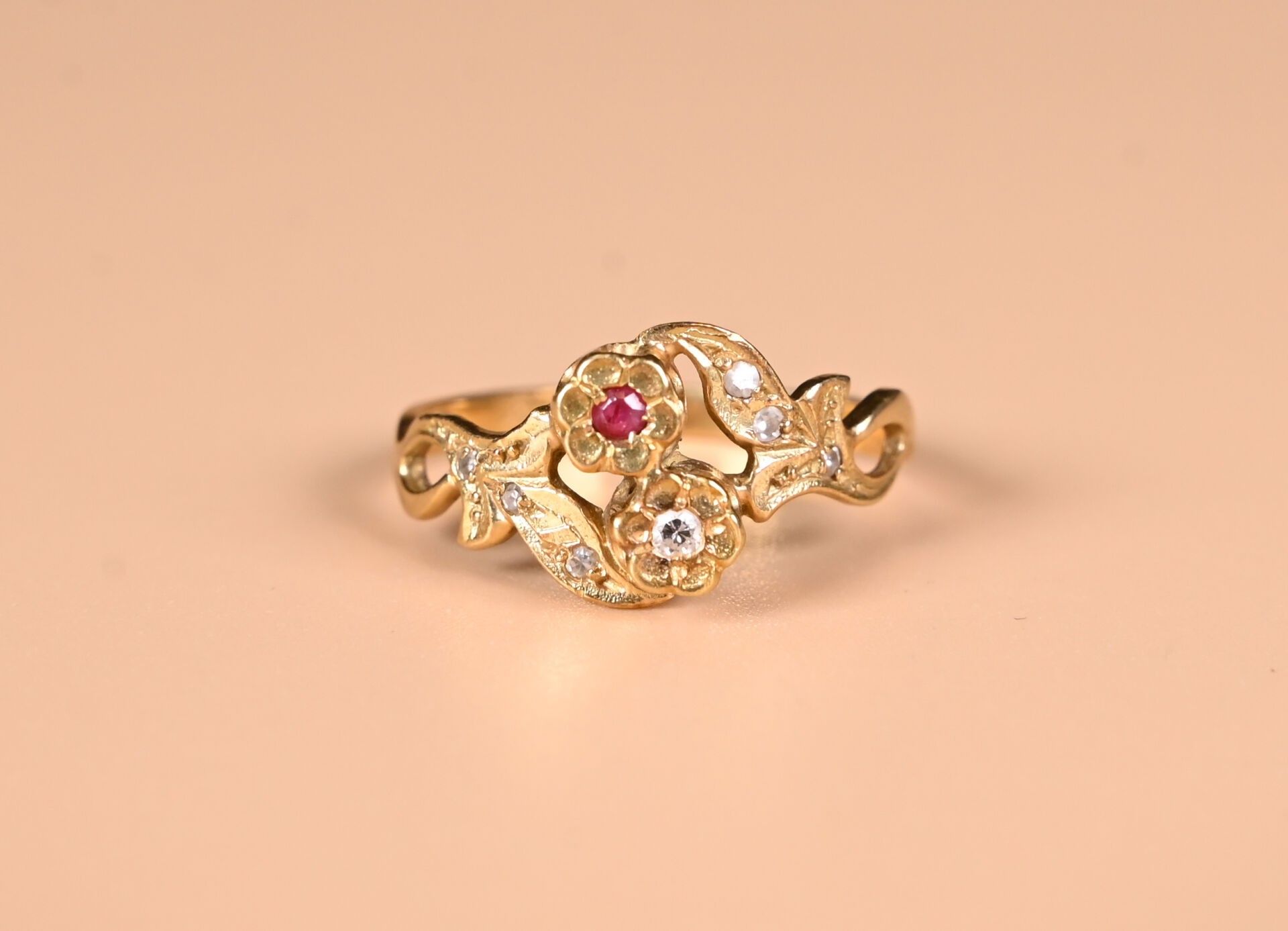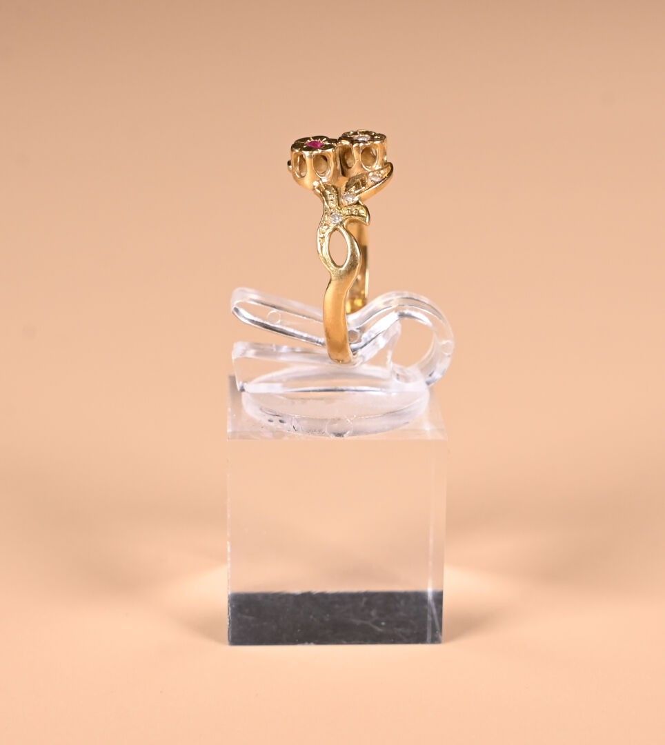 toi & moi ring in 18K yellow gold 750/1000th, set with diamond and ruby chips in a foliage design. TDD. : 54. Gross weight : 2,49 g.
