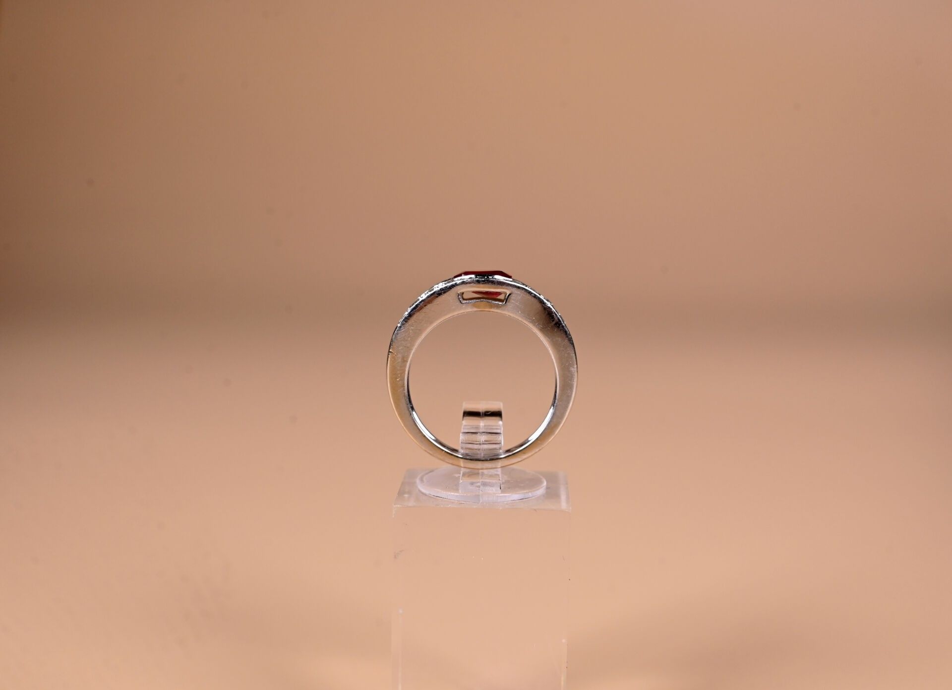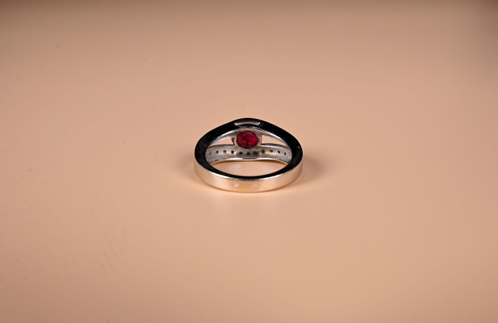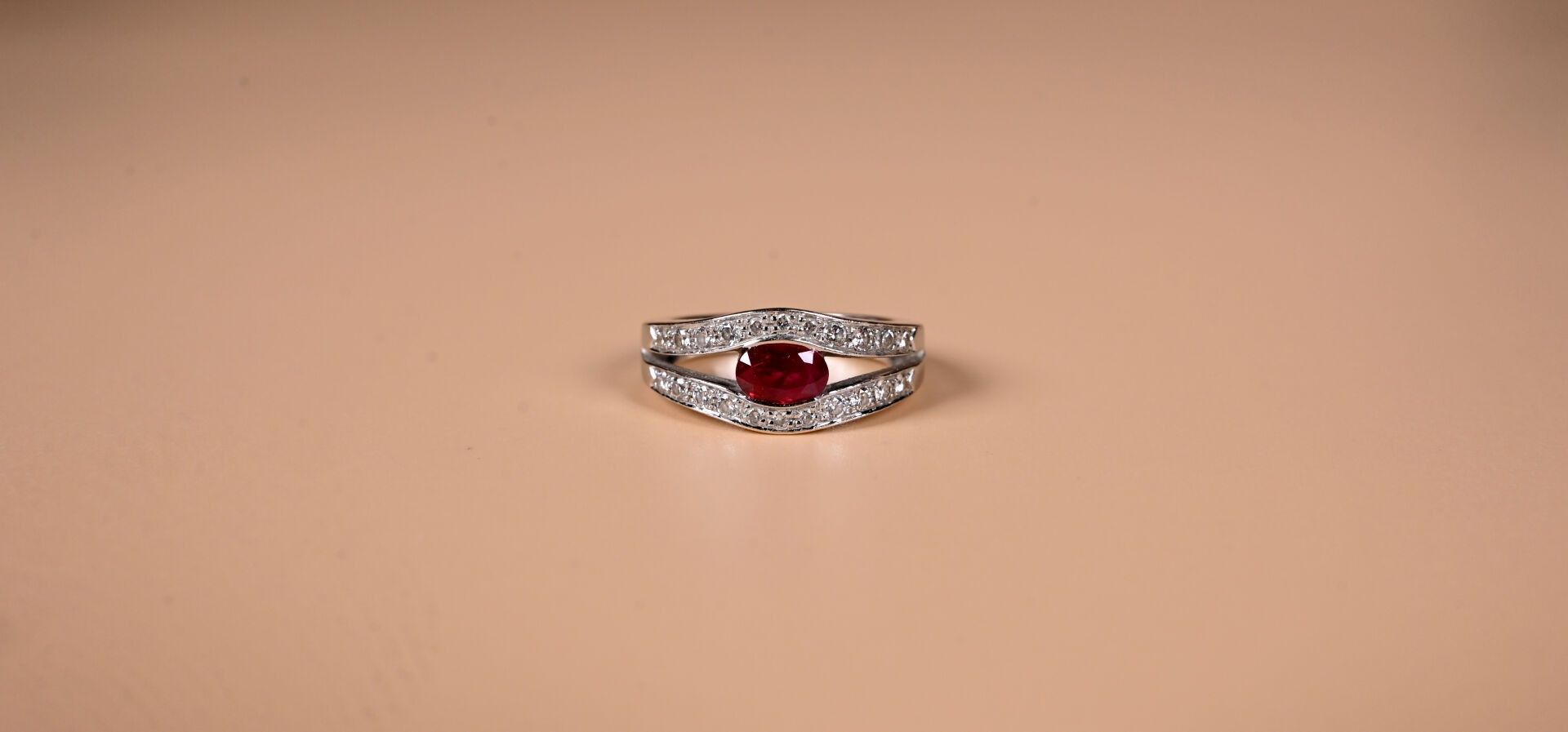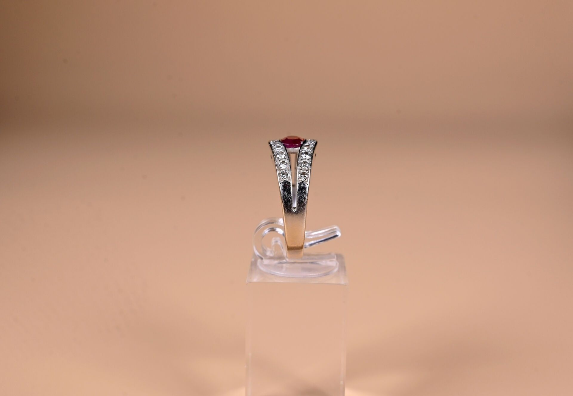 Modern 18k white gold ring presenting two diamond rings linked by an oval ruby (treated). TDD 55. Gross weight: 6.9 g.