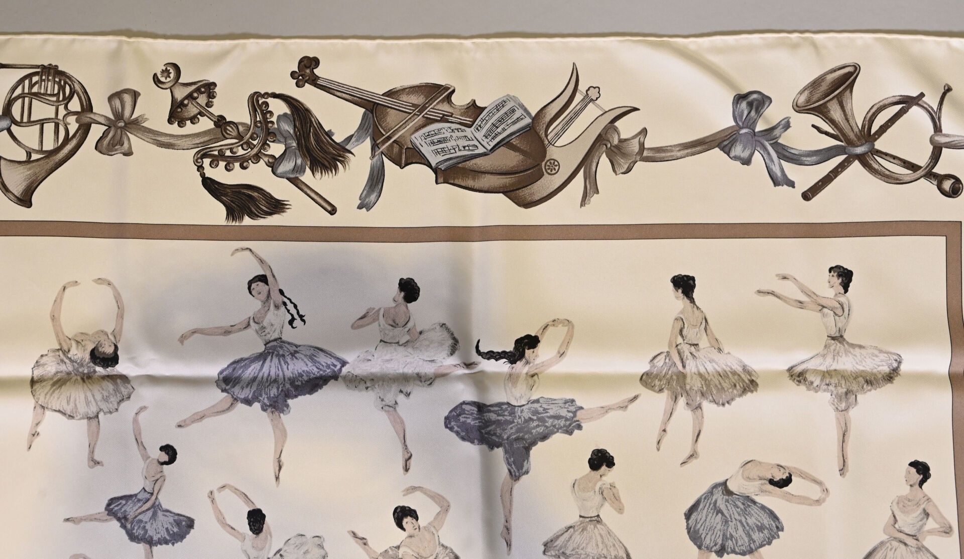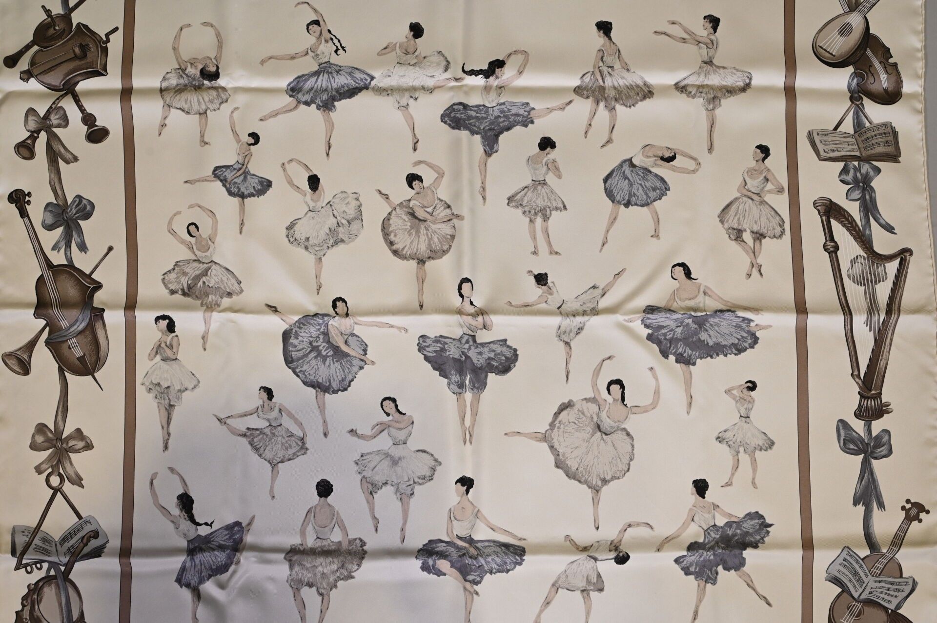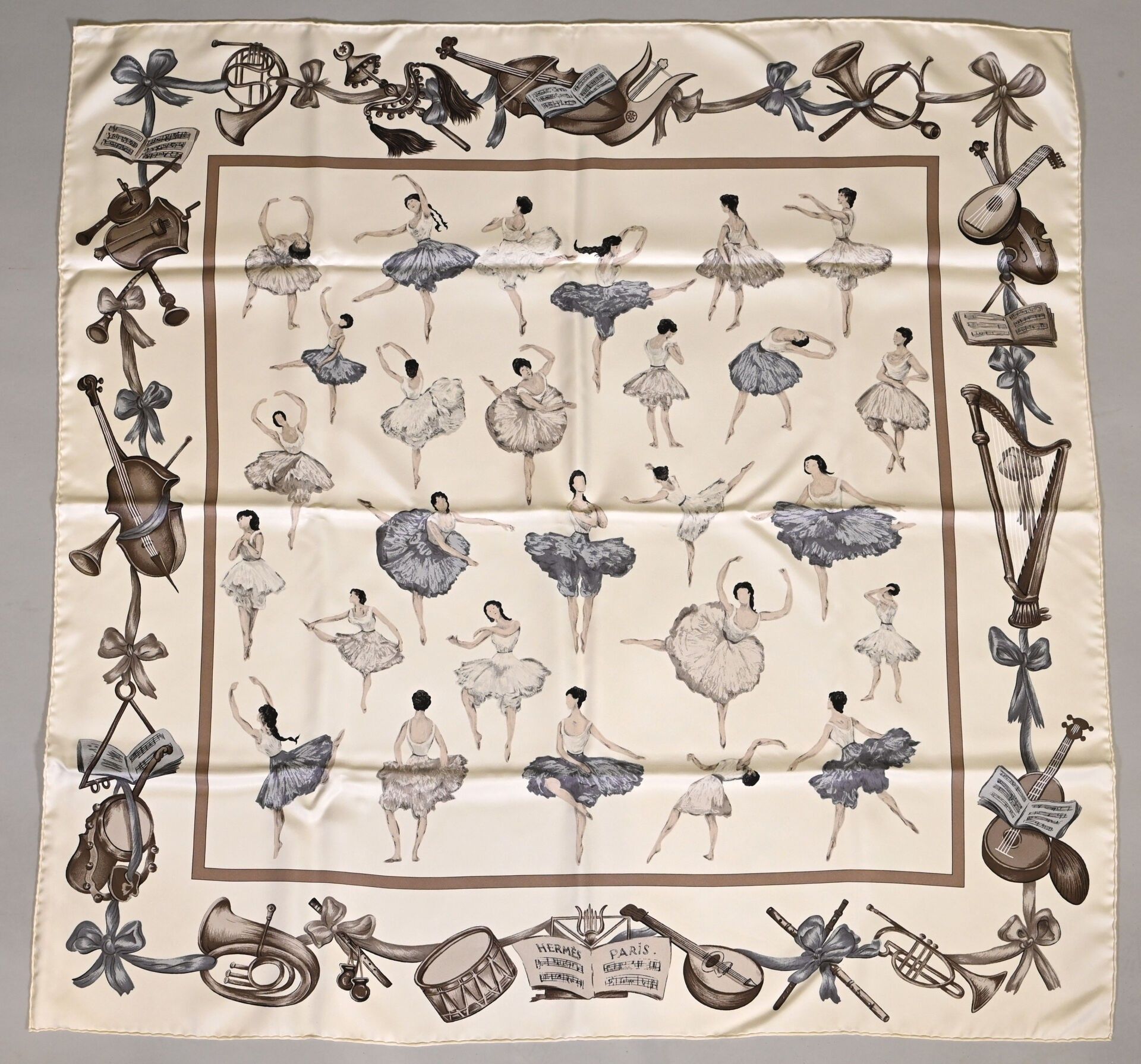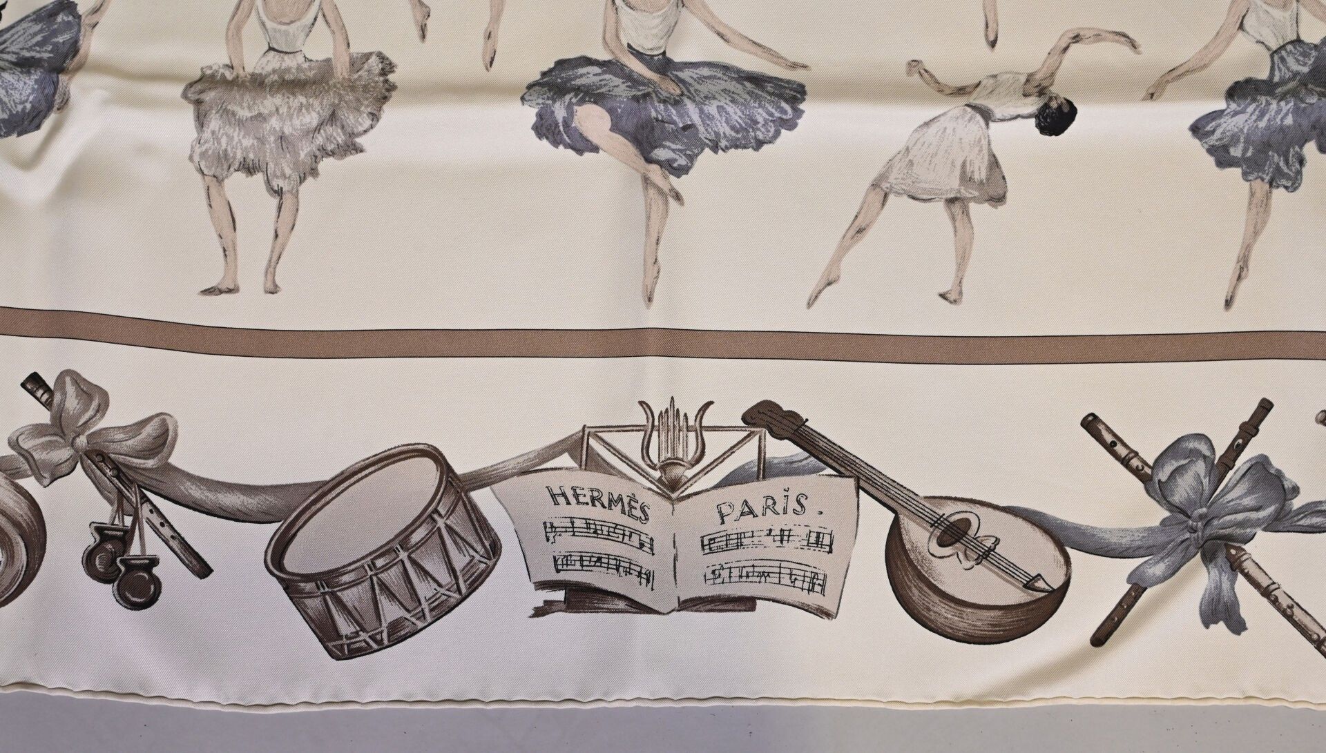 HERMES PARIS. Silk twill square decorated with ballerinas in taupe on a cream background. 90 x 90 cm. Box.
