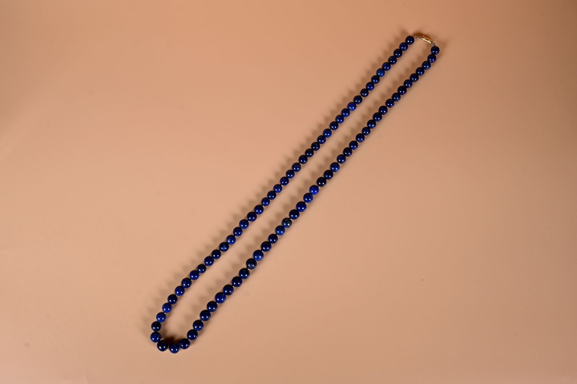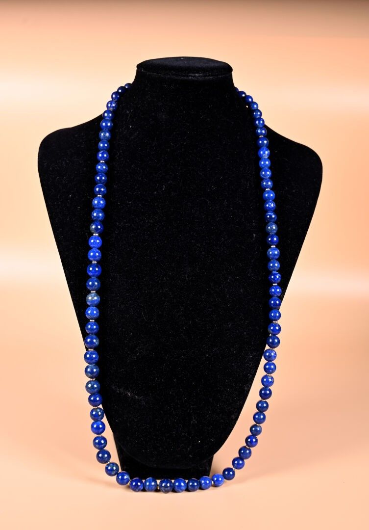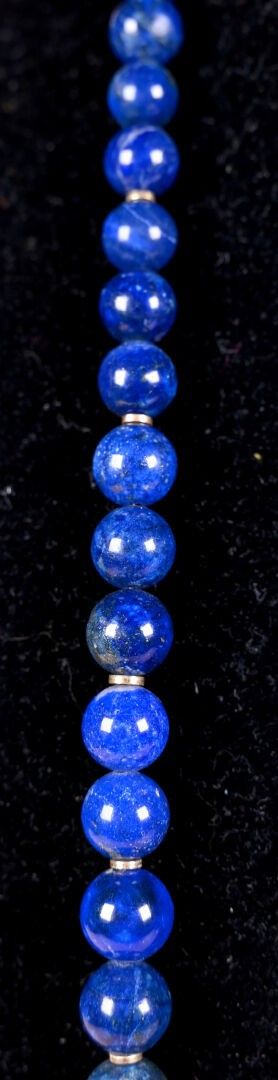 Long necklace with falling lapis lazuli balls. Gilt metal clasp and small rings. Length: 81 cm. Balls from 8.5 to 10 mm.