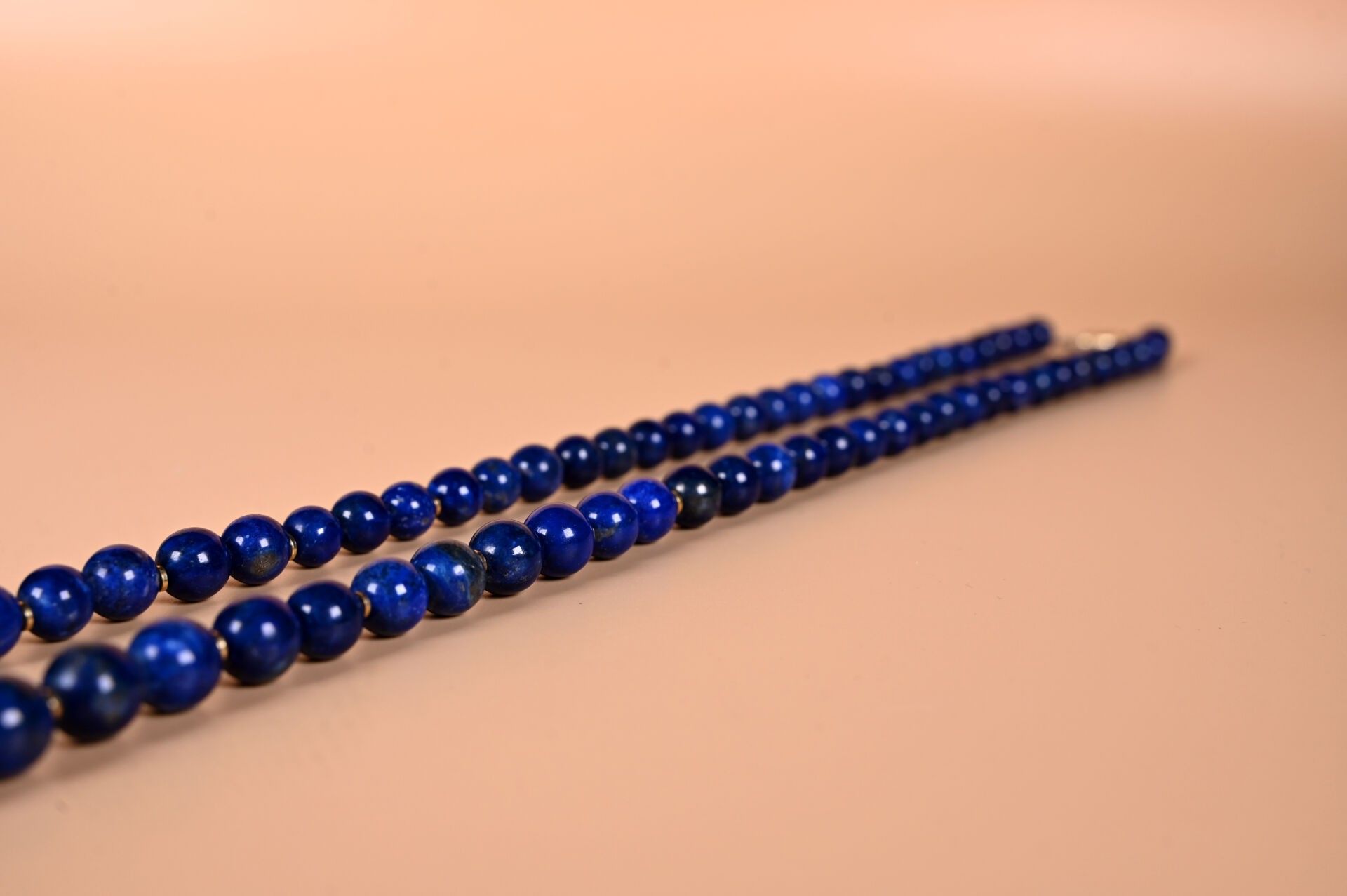 Long necklace with falling lapis lazuli balls.