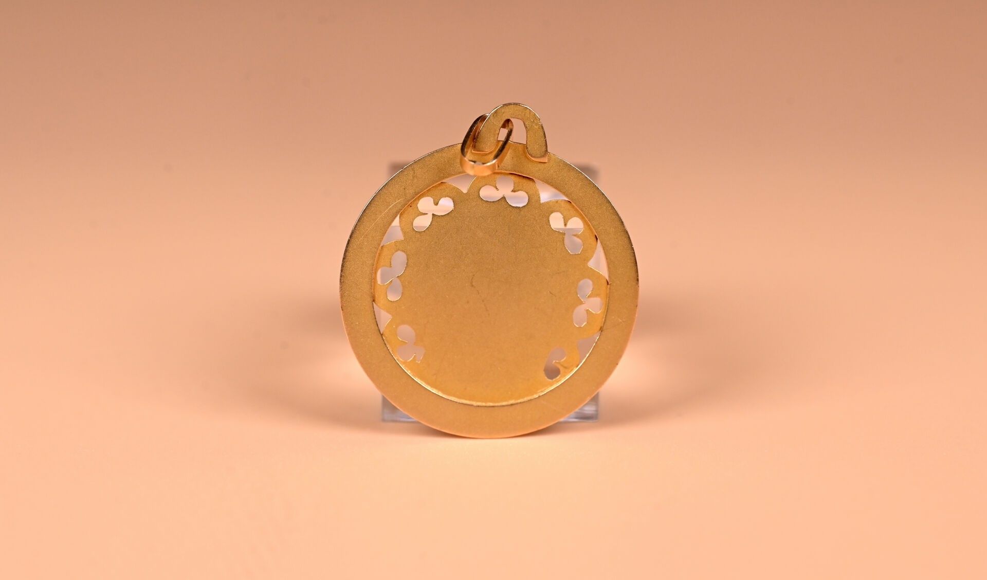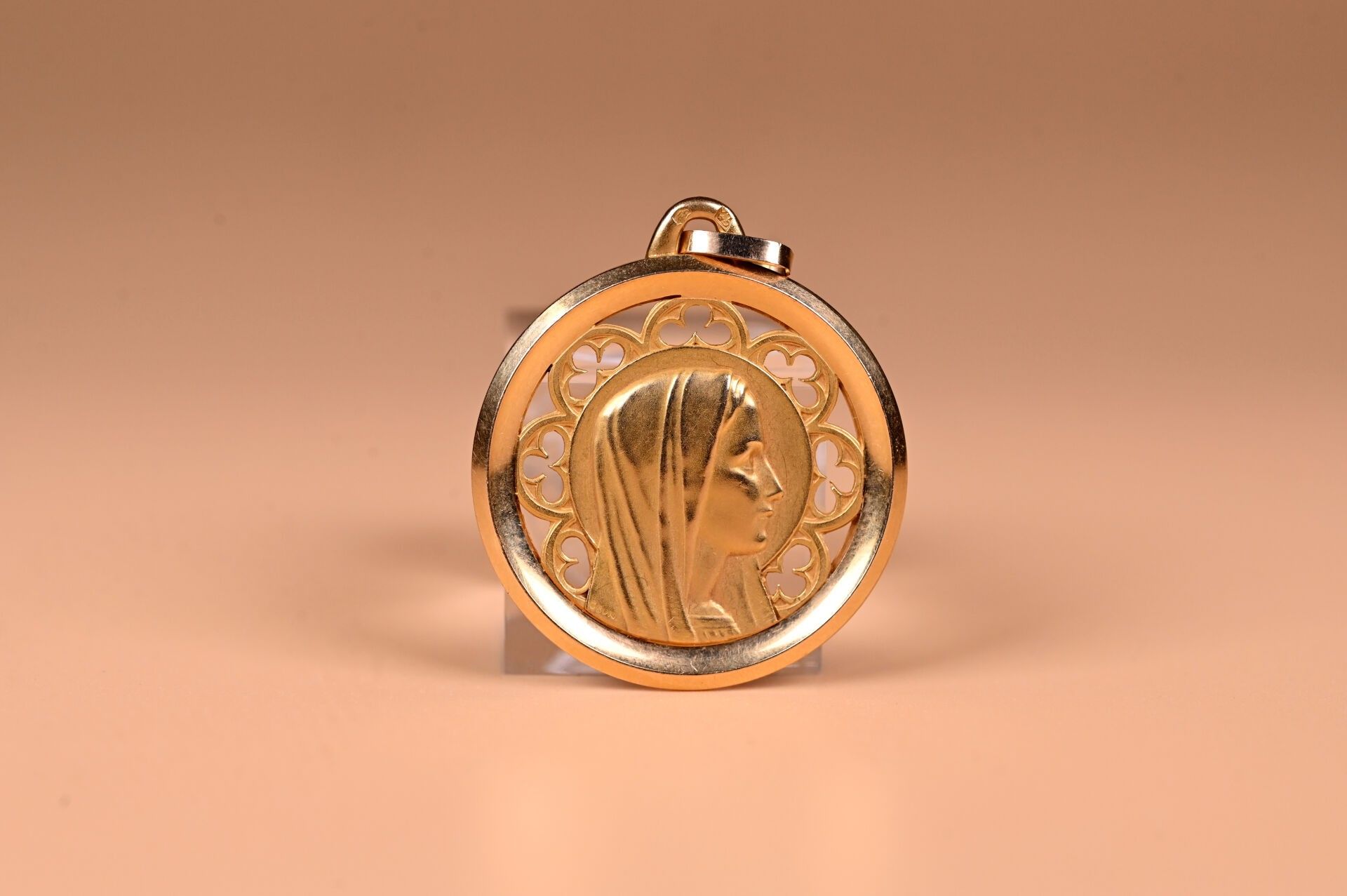 Large medal with the Virgin Mary in 18K yellow gold 750/1000e in an openwork setting. Height: 3.5 cm. Not engraved. Weight : 4,8 g.