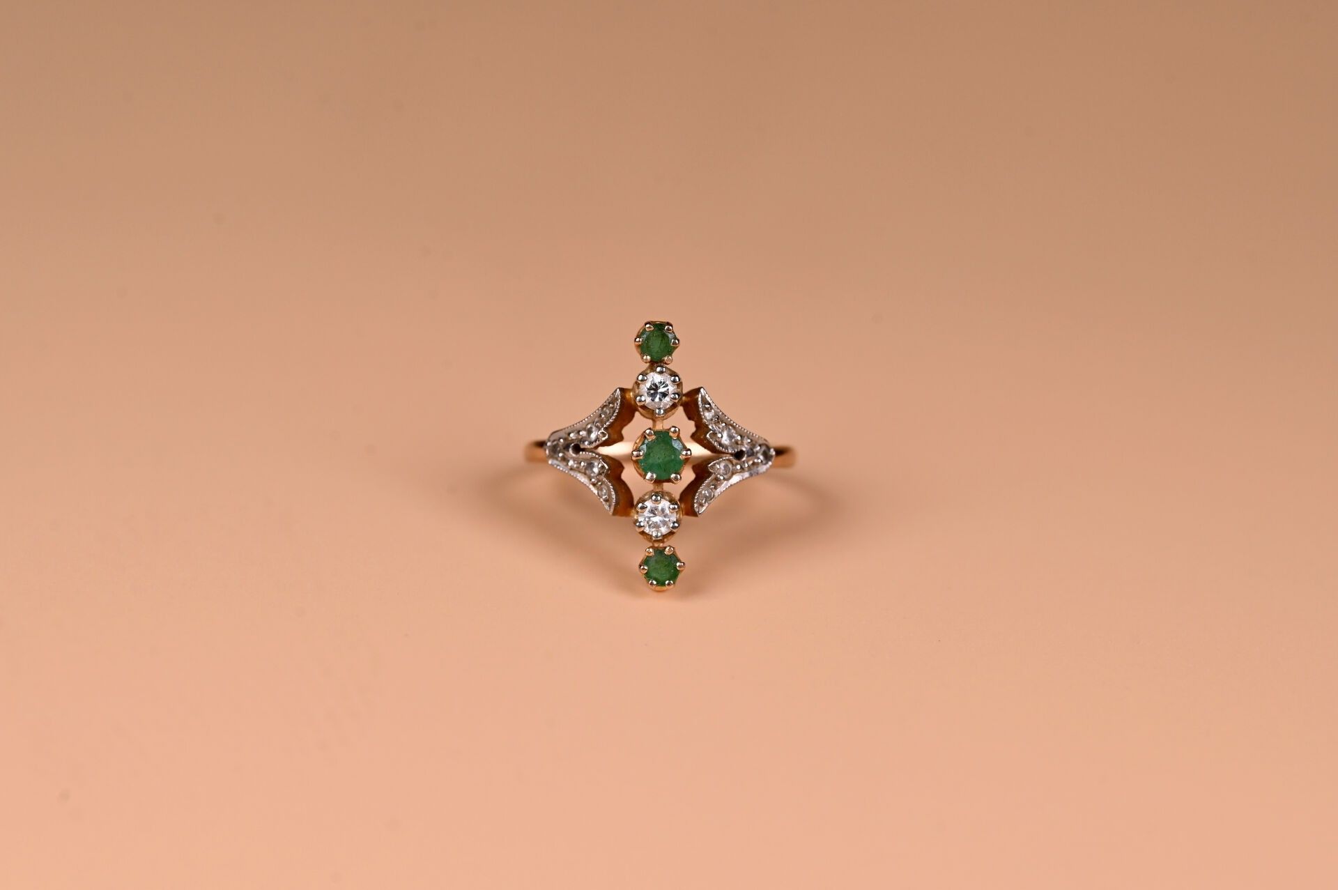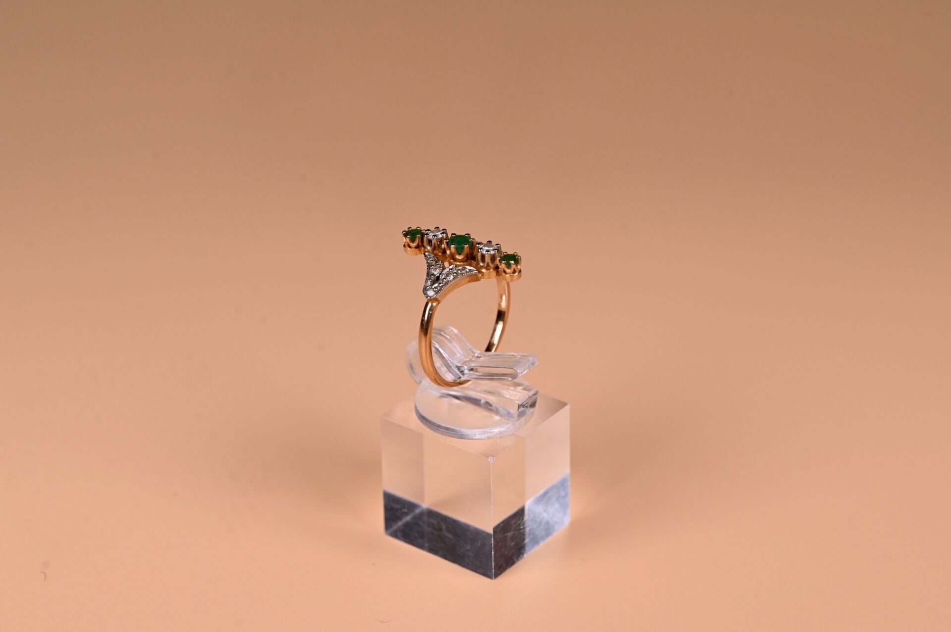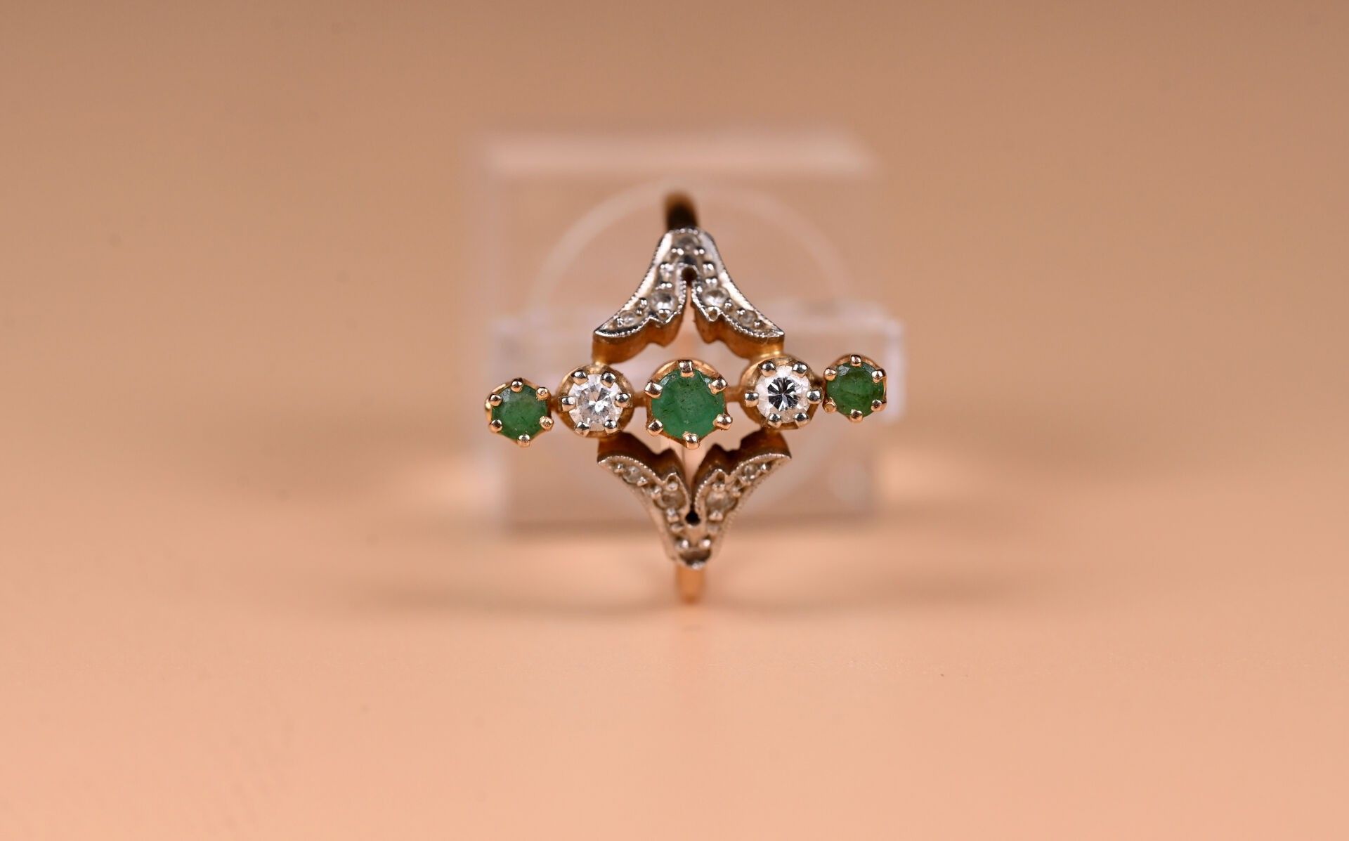 Marquise-shaped ring in 18k gold set with three round emeralds and two small diamonds. Shoulder in palmettes with small diamonds. TDD 57. Gross weight: 4 g
