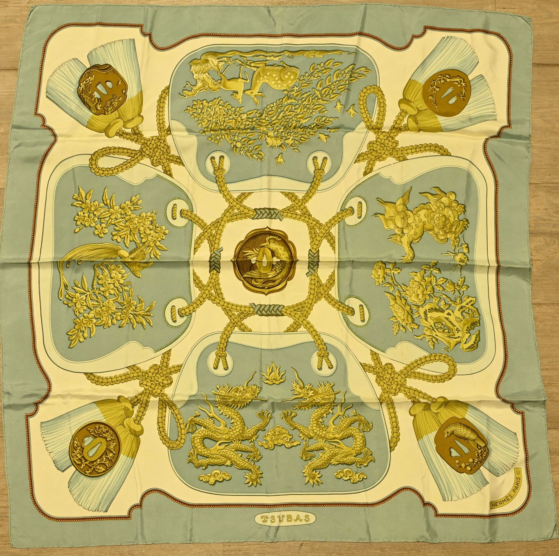 HERMES PARIS. Tsubas" silk square with ochre and beige monoc…