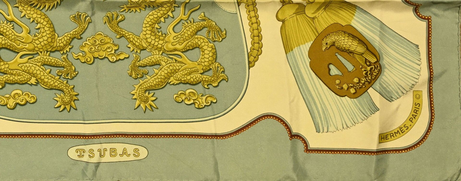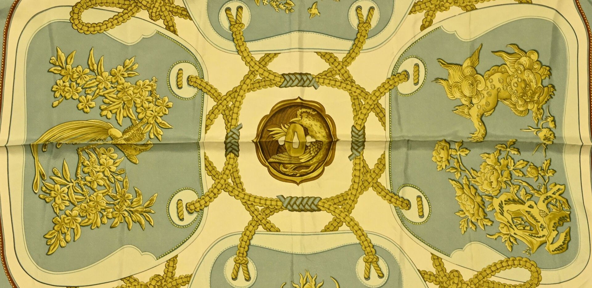 HERMES PARIS. Tsubas" silk square with ochre and beige monochrome decoration, sky blue border (slightly yellowed, minor wear). 90 x 90 cm.