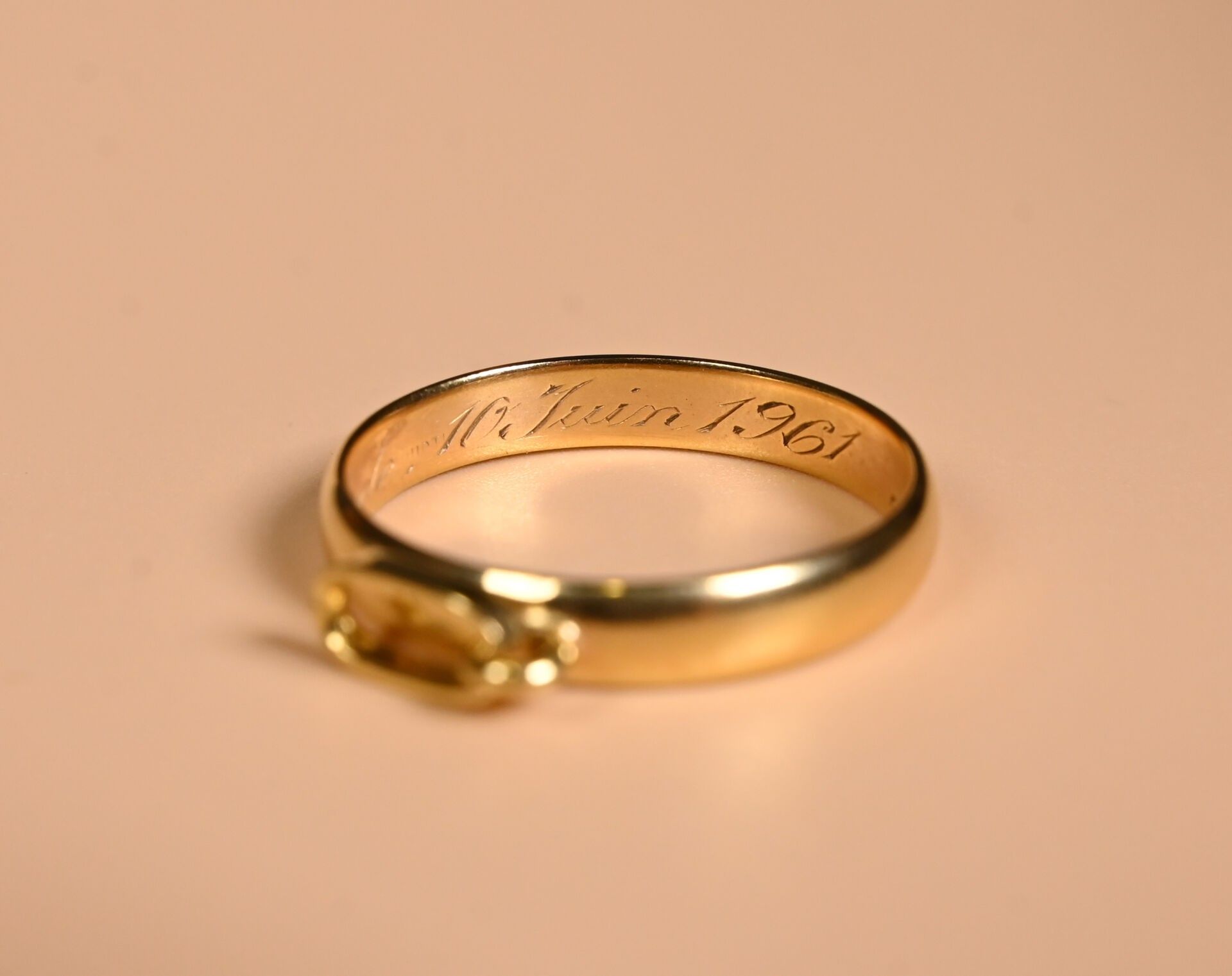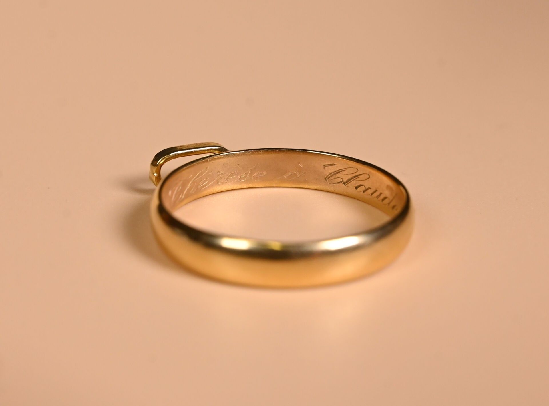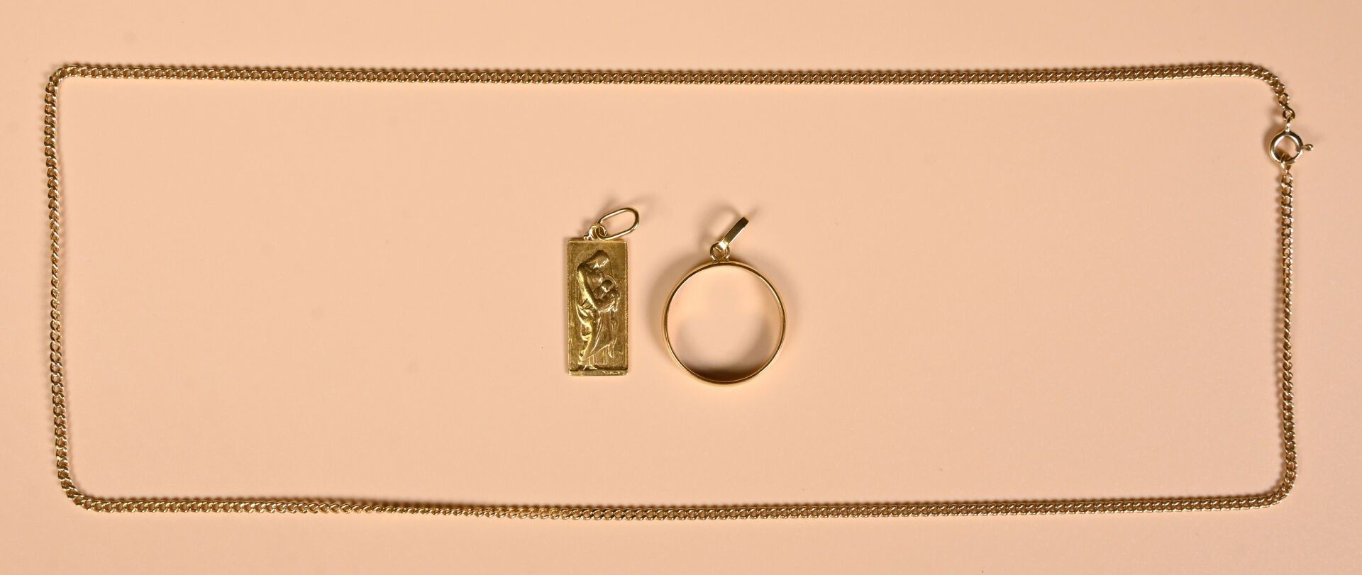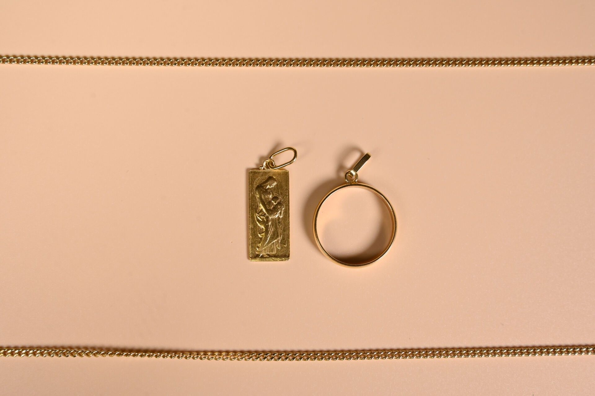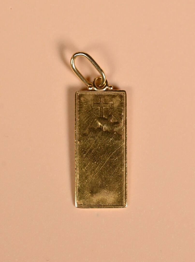 Set in 18K 750/1000 yellow gold comprising an English-link chain, a rectangular medal and a ring with engraved inscription "Marie-Thérèse à Claude 10 Juin 1961". Total weight: 17.87 g. The ring will be hallmarked before the sale.