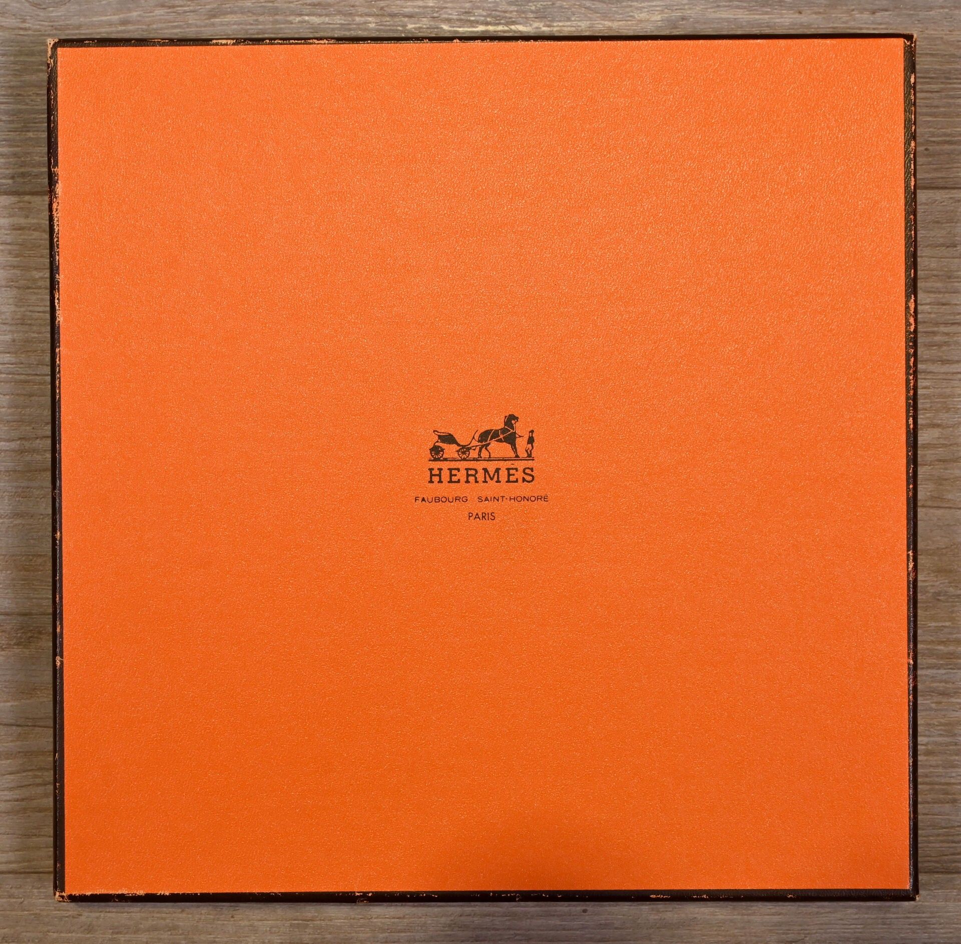 HERMES PARIS. Silk square model "Mécanique du temps" decorated in red, orange and black on a grey background (small stains, some threads pulled). Marked. 90 x 90 cm. Boxed.