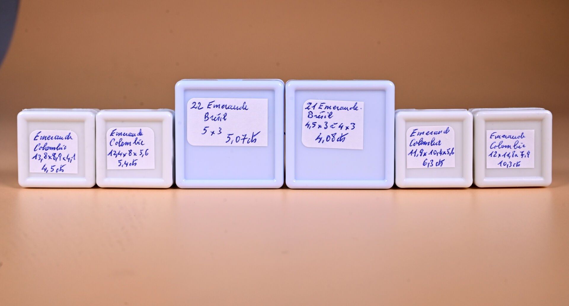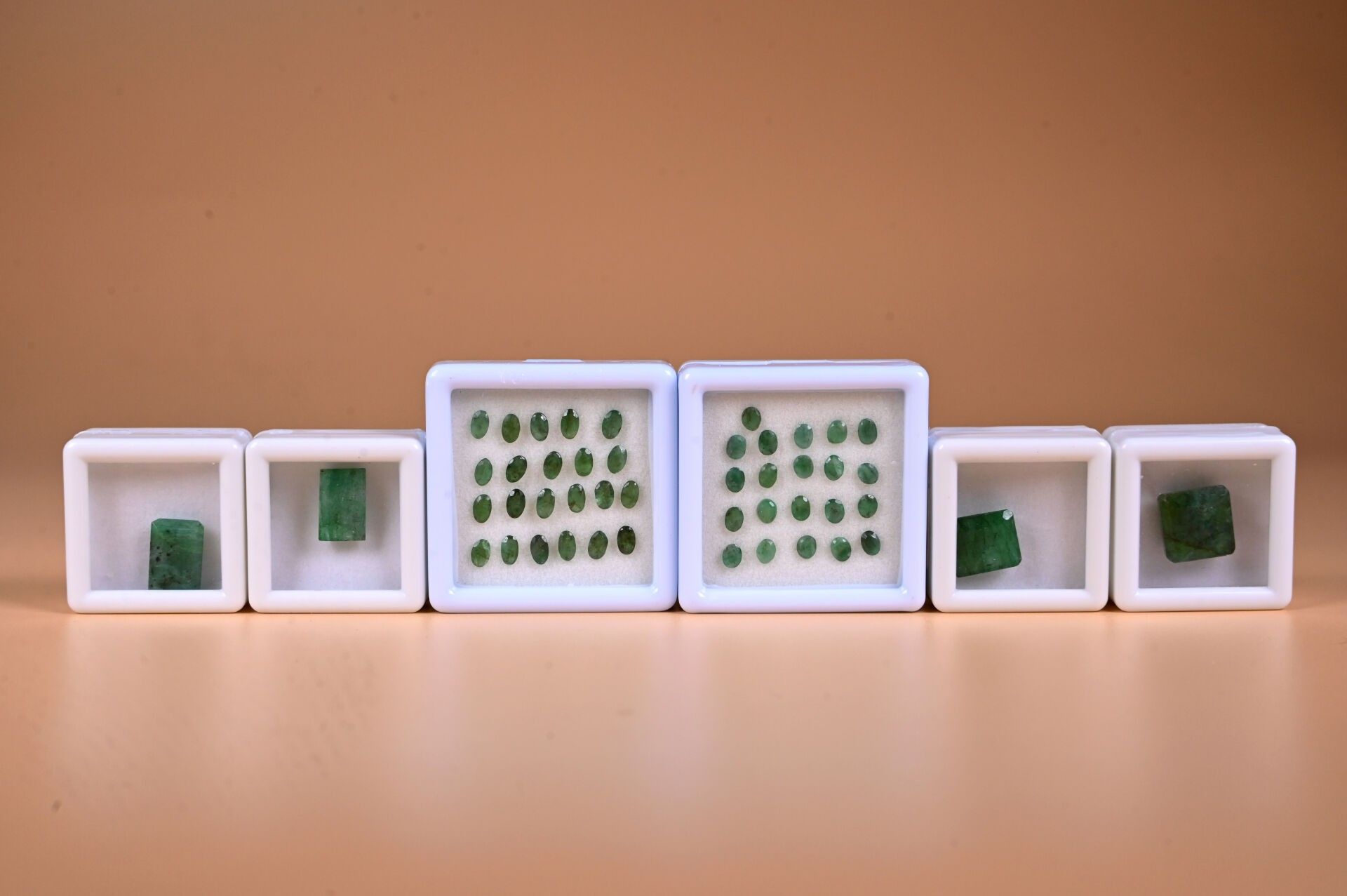 4 emeralds (Colombian, partly opaque) and two lots of small opaque emeralds.