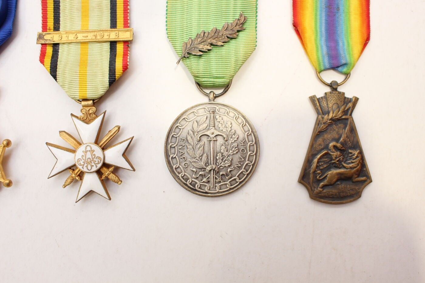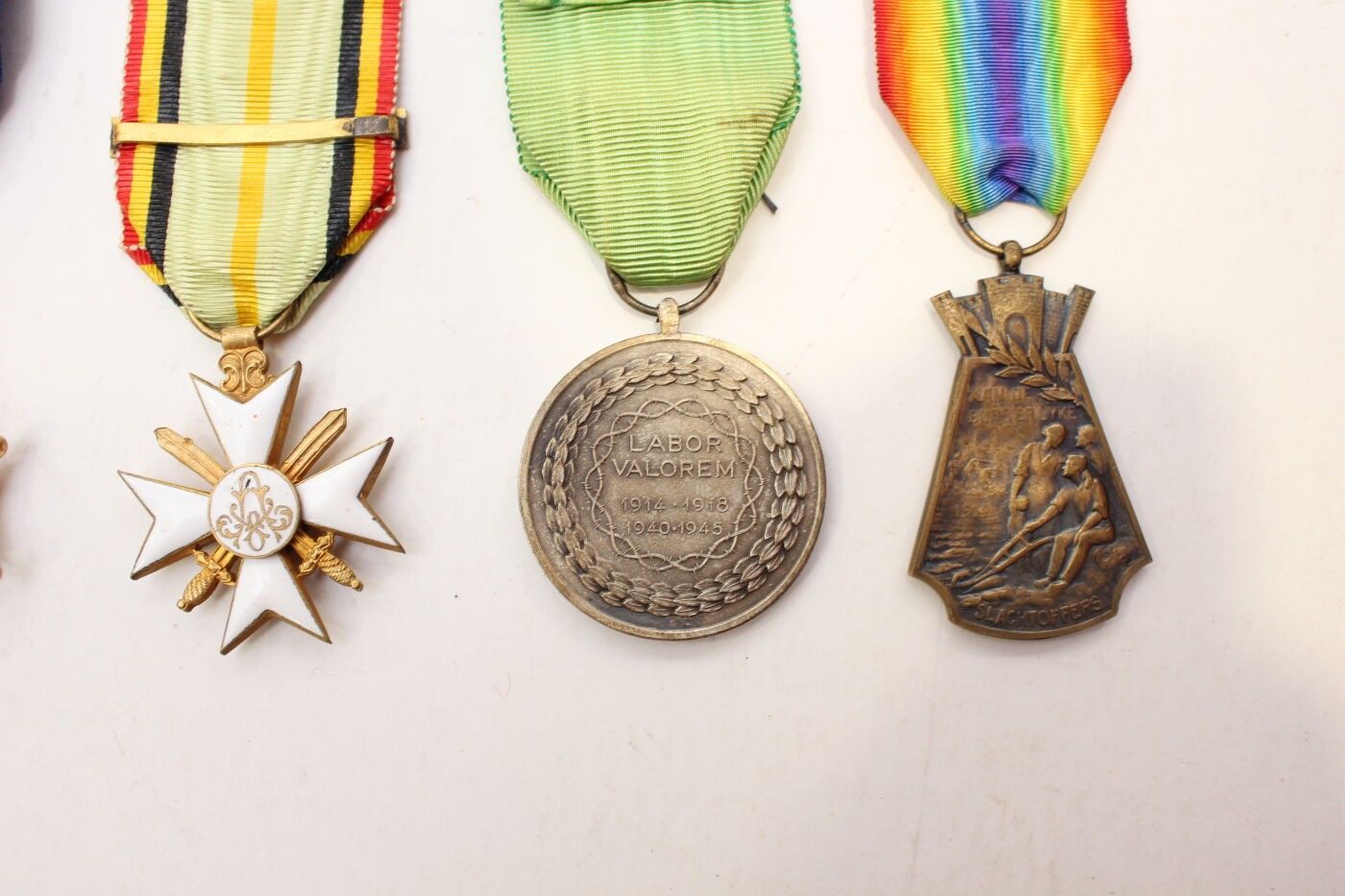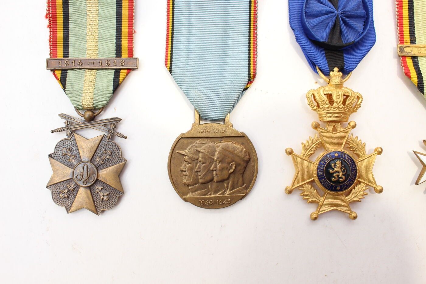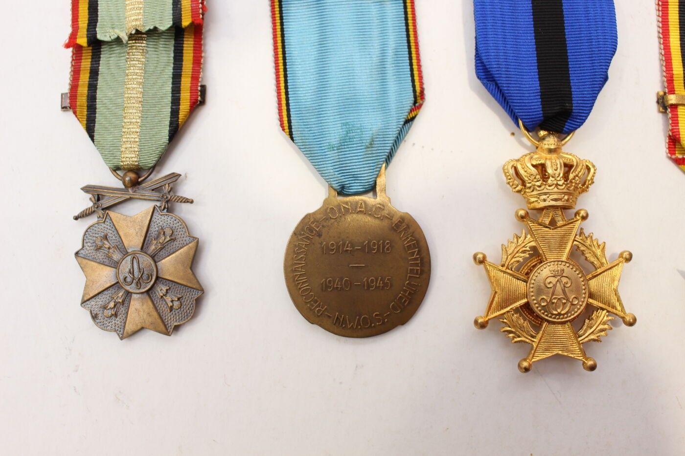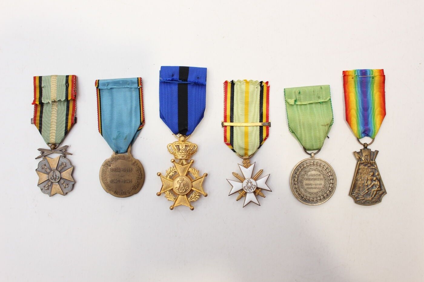 BELGIUM. Set of six items including: Order of Leopold II, officer's badge in gilt bronze, enamel and ribbon; ONAC 14/18 and 40/45 recognition medal in gilt bronze and enamel; FNAPG prisoner of war veterans medal in silvered bronze and ribbon; medal for civilian victims of WW1; military merit medal in bronze and ribbon with 1914/1918 clasp; a civic cross in bronze and ribbon with 1914/1918 clasp. 20th century.