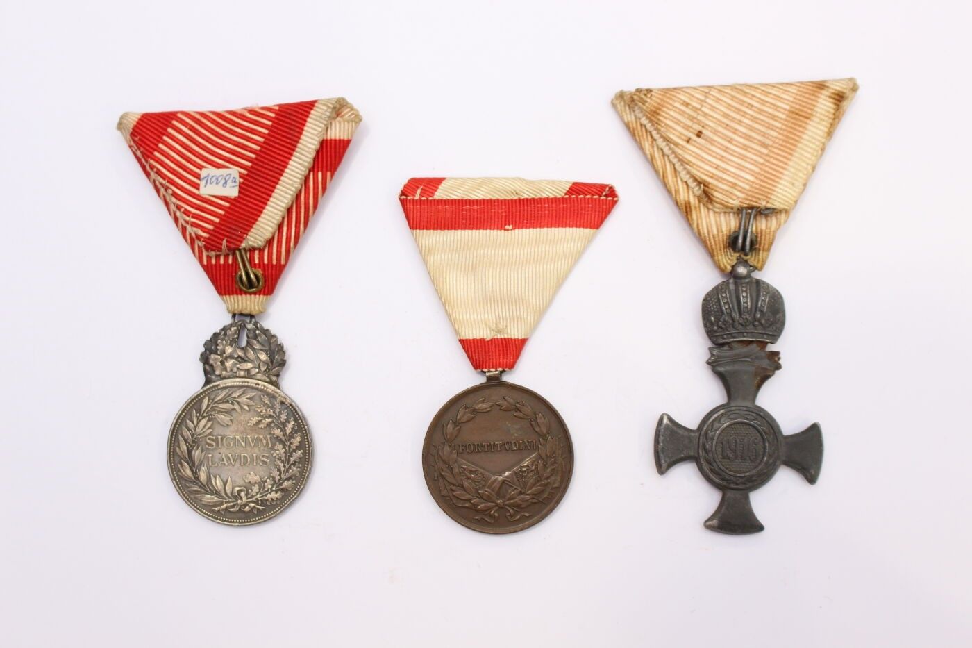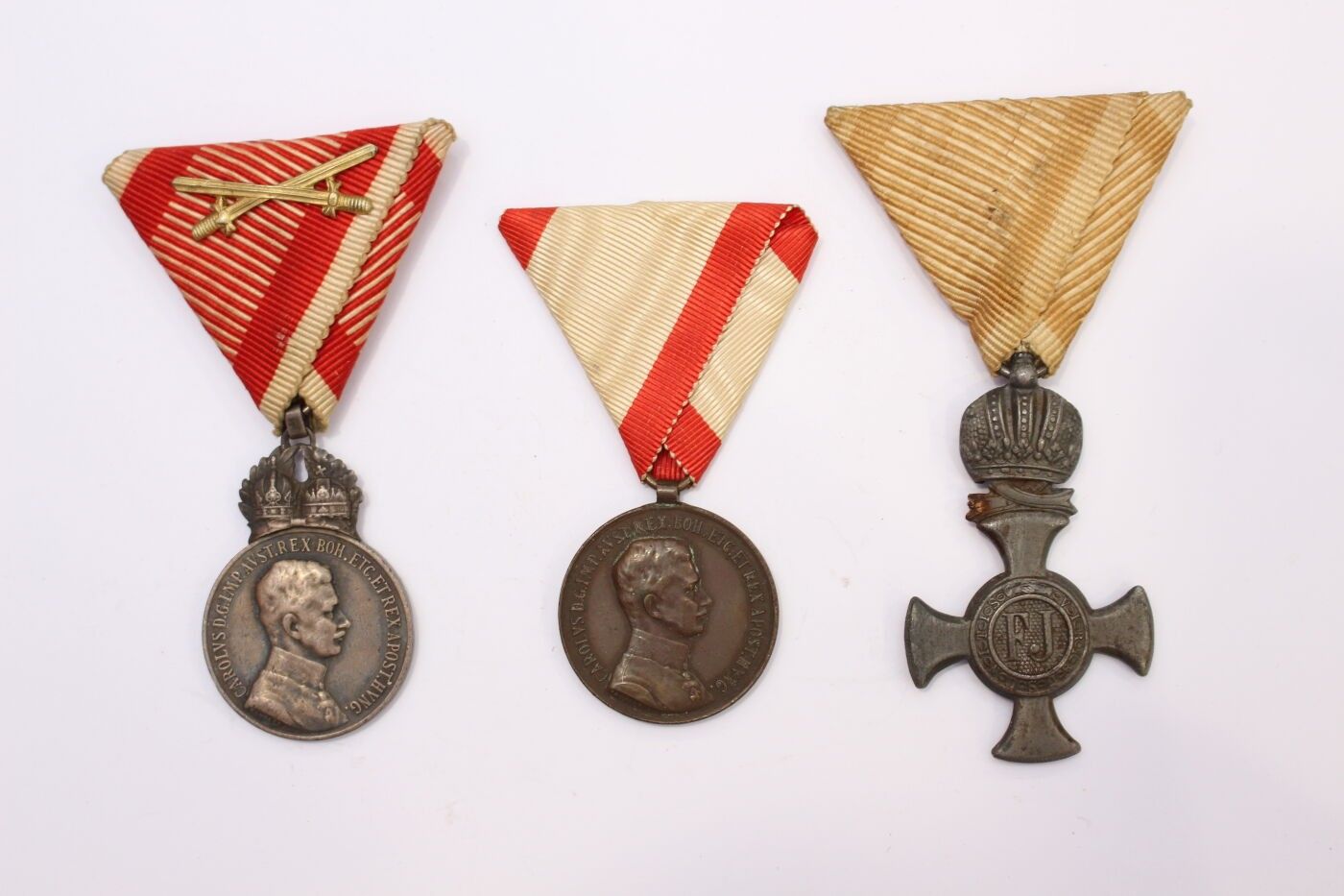 AUSTRIA-HUNGARY. Set of three items comprising: silver medal of military merit of the 2nd type for wartime in minimum silver 800°/°° and ribbon with gilt metal swords; bronze medal for bravery of the 2nd type in bronze and ribbon; iron cross of merit model with metal crown and ribbon. Gross weight: 24.9 g.