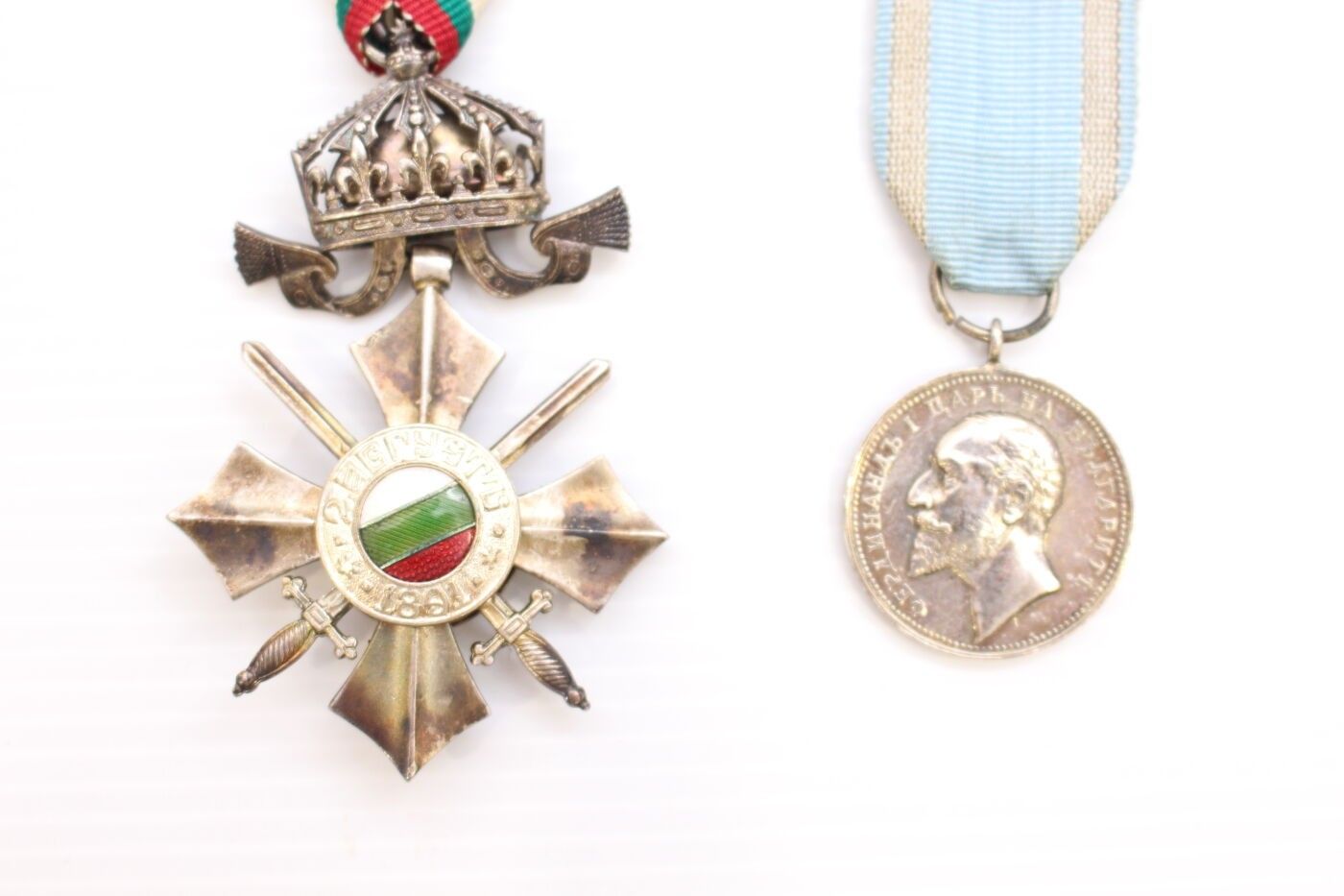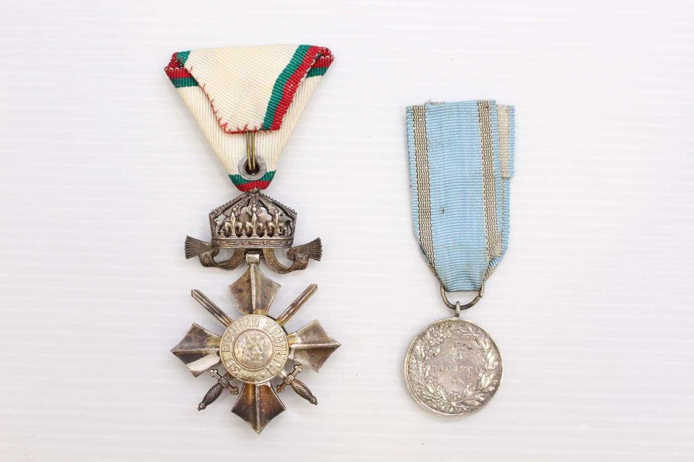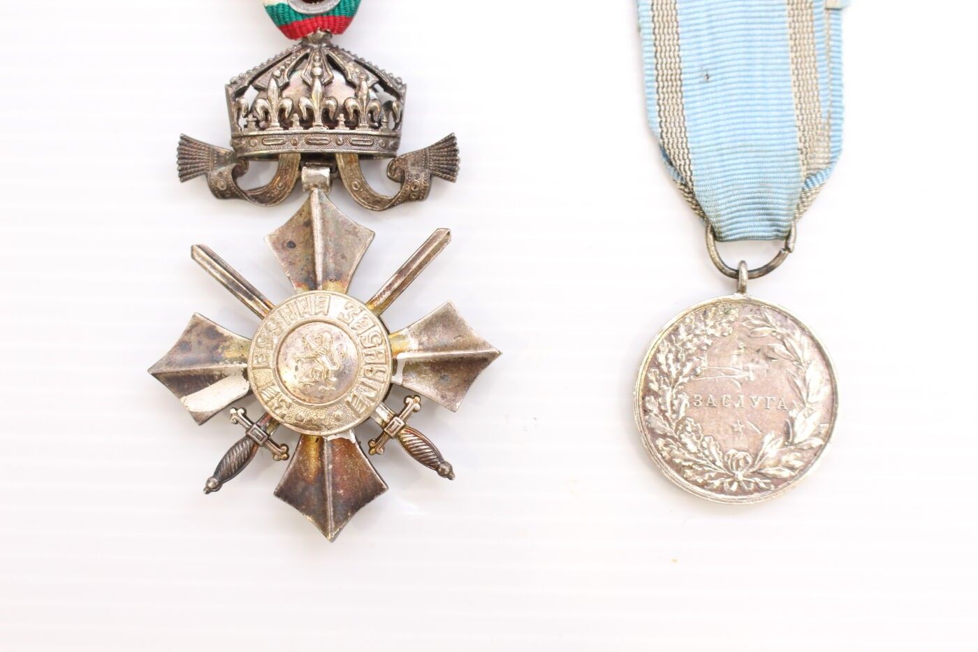 BULGARIA. NATIONAL ORDER OF MILITARY MERIT. 800°/°° silver knight's badge, enamel and ribbon not in conformity. Early 20th century. Dimensions: 72 x 48 mm. Attached is a medal of merit in the profile of Ferdinand I in silver 800°/°° and ribbon. Total gross weight: 37 g.
